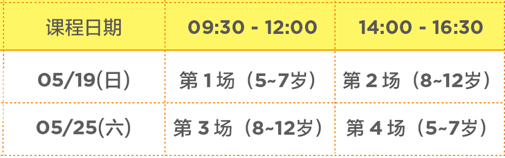 课程时间:每场课时2.5小时,课程内容根据孩子接受能力有部分调整,整体内容一致,可选择一场参加。
