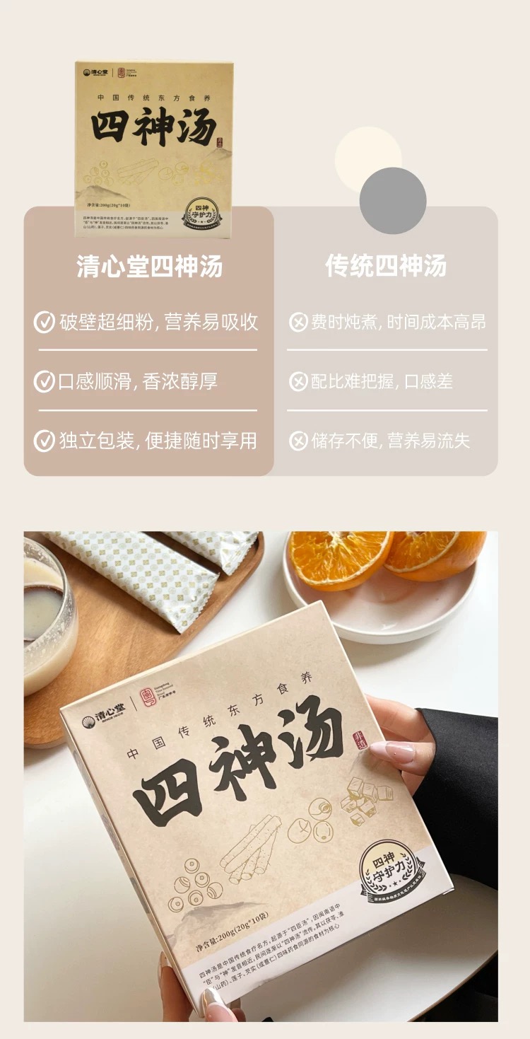 清心堂四神汤冲泡时只要加少量温水调匀,再兑适量沸水,搅拌到全部溶解就行,早晚各一次,每次1-2袋。喝起来浓稠厚实,带着淡雅清润的口感,脾胃不好吃不下饭、容易拉肚子,或是湿气重、虚胖的人,都很适合。还可以根据自己的喜好加糖、蜂蜜、盐调味,或者加鲜奶一起吃,真正做到温和养人,能每天喝还不挑体质,老少皆宜哦!