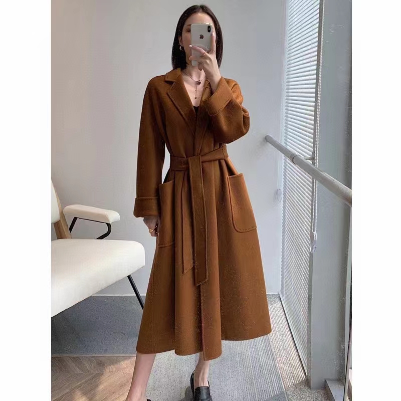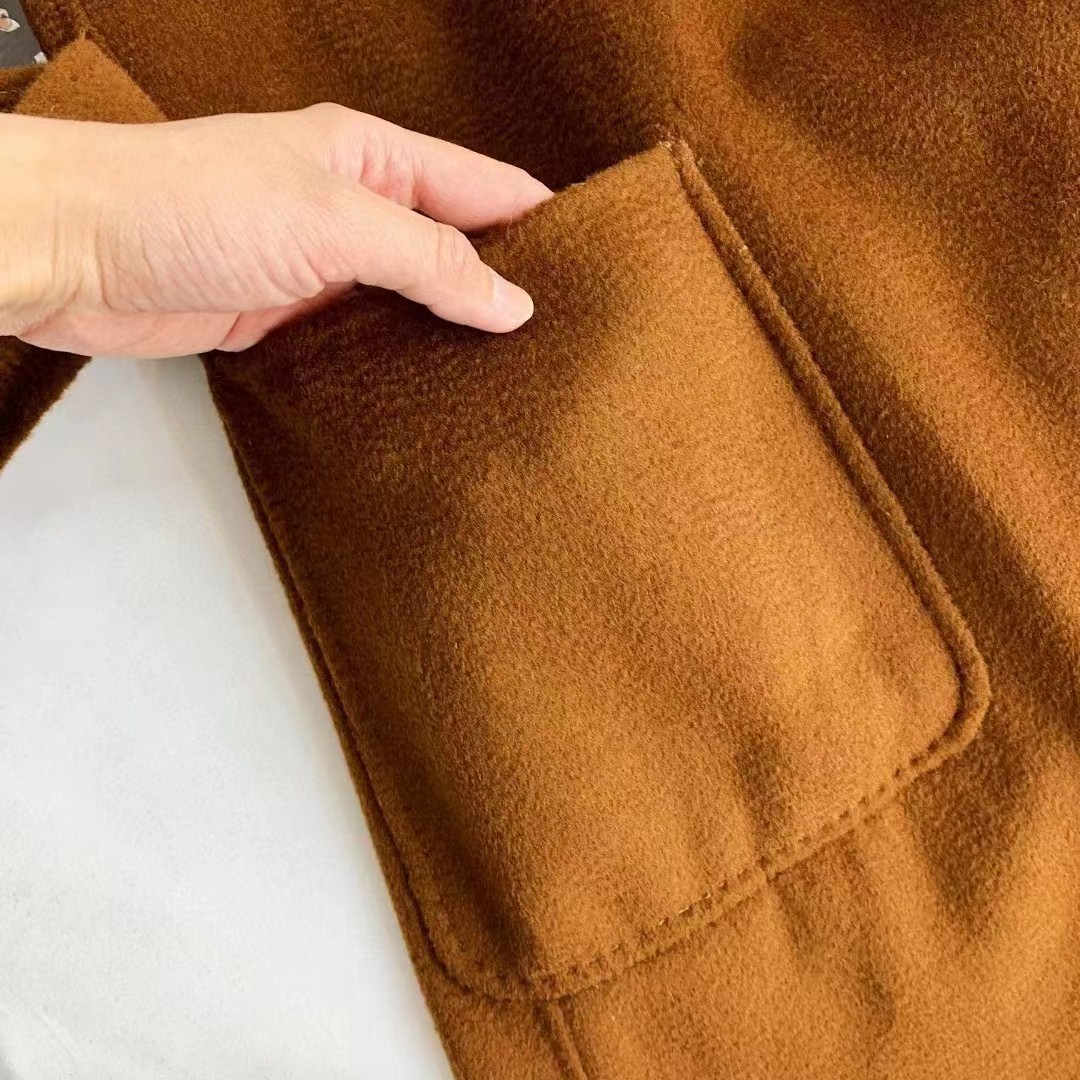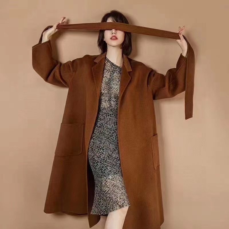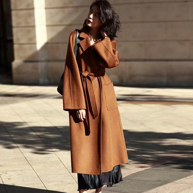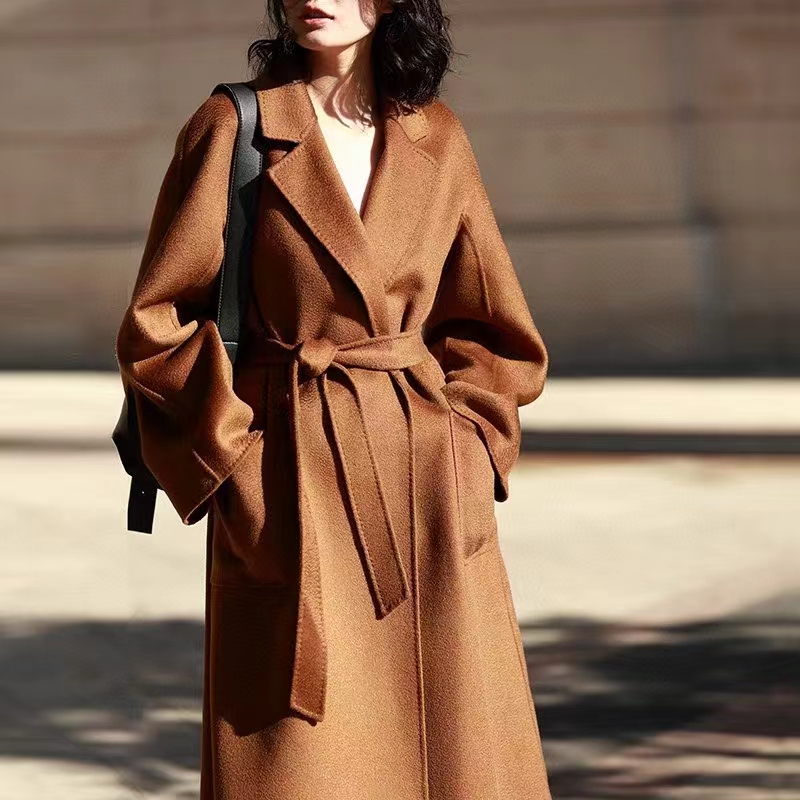 F011394焦糖色水波纹三十而已顾佳同款纯羊绒双面呢大衣女中长款外套