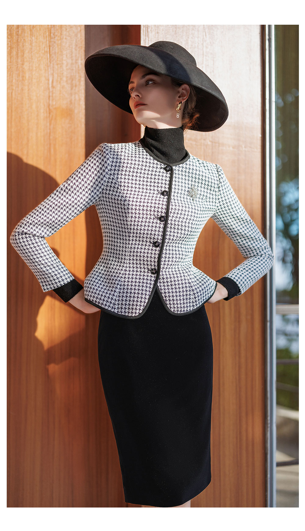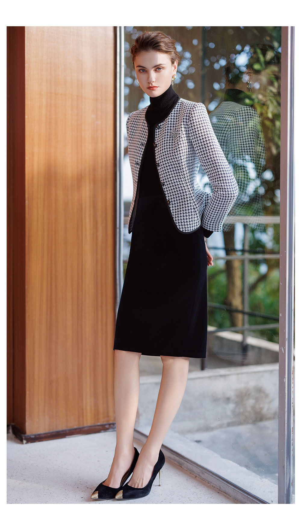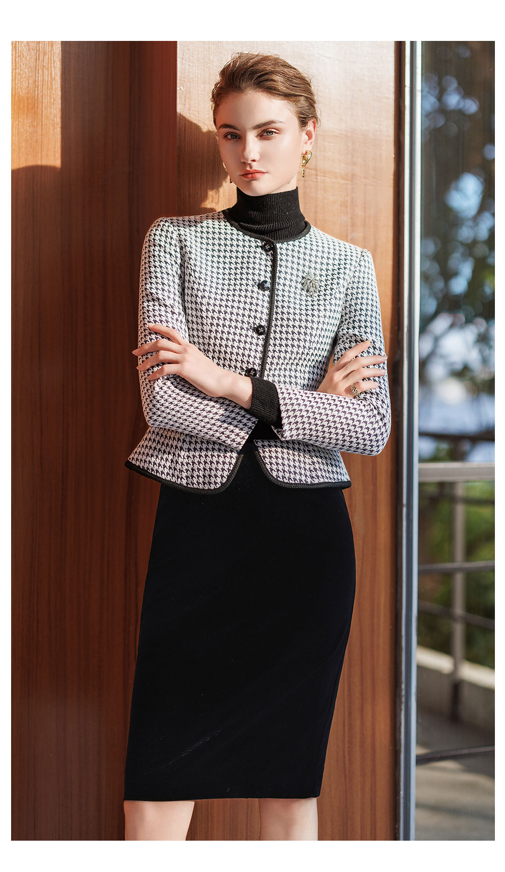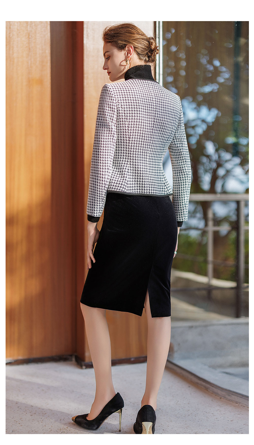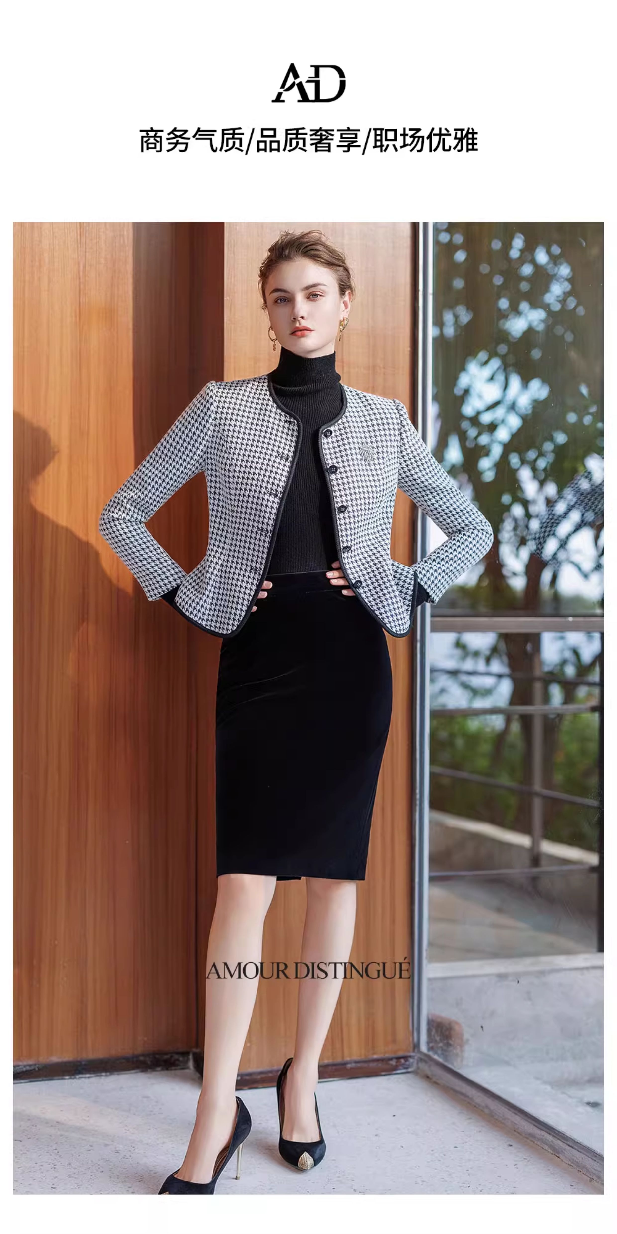 AD黑色千鸟格圆领短外套女秋冬气质小香风高端职场套装丝绒包臀裙