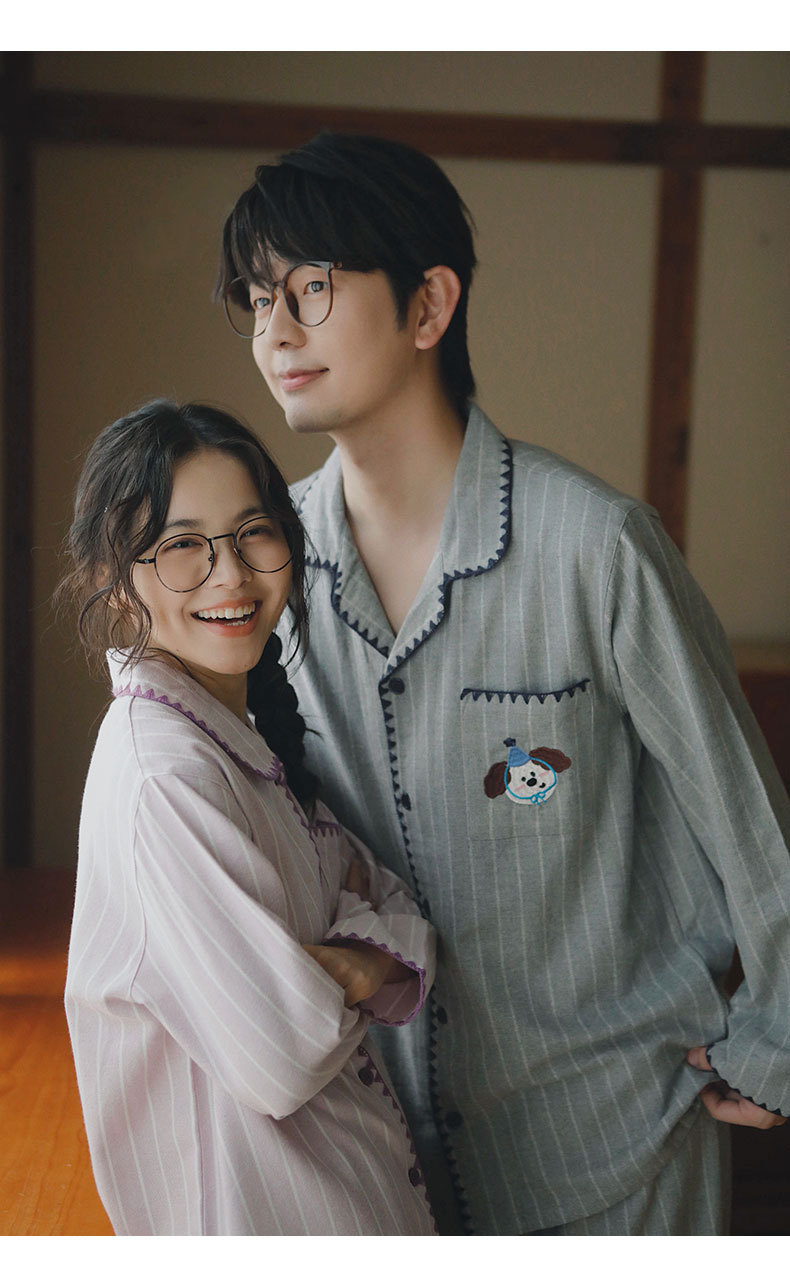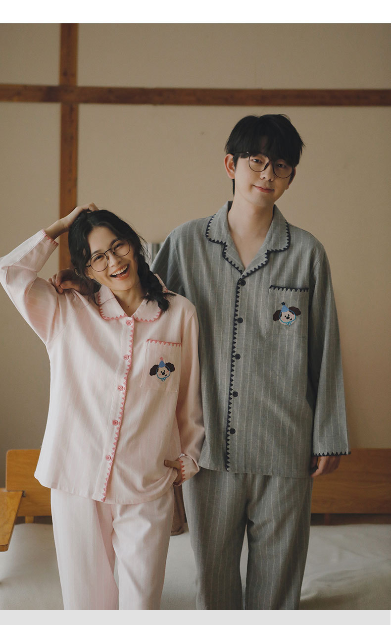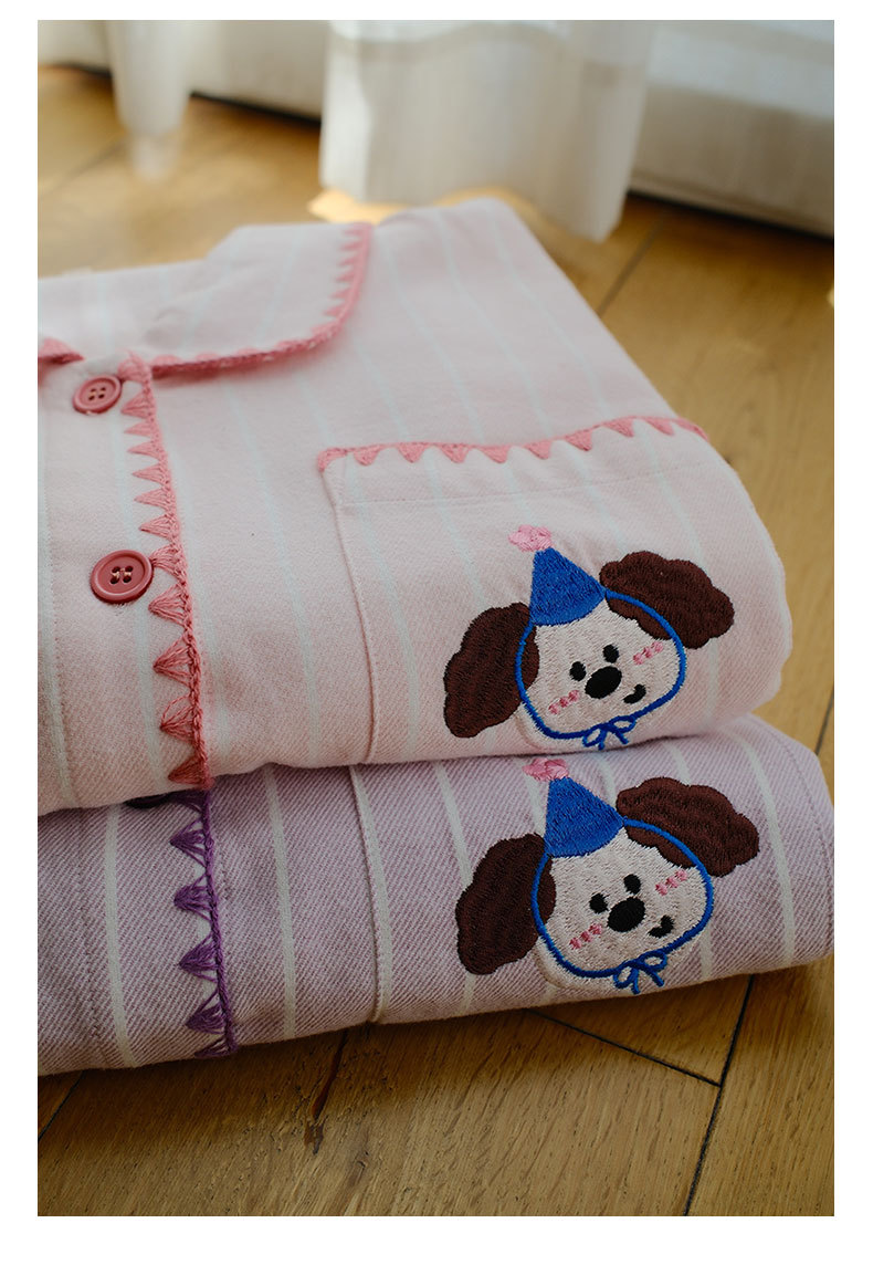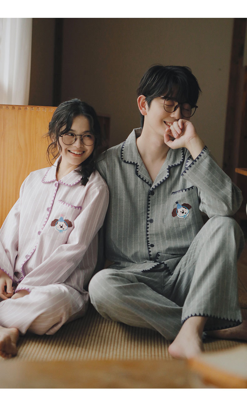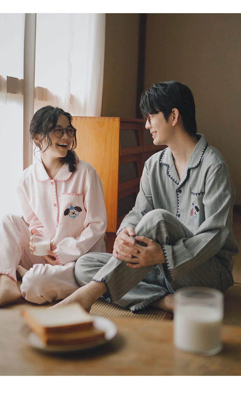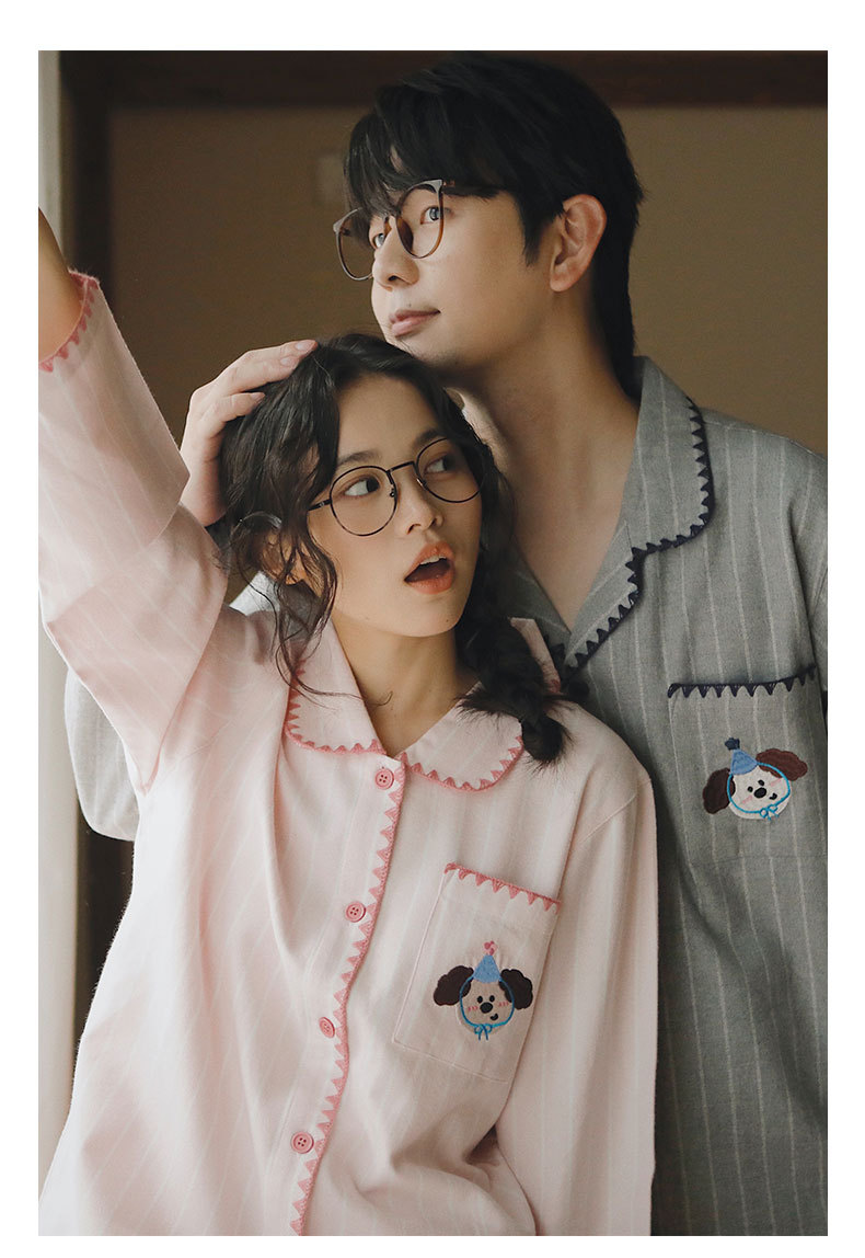 【全棉磨毛】预售~快乐小狗情侣睡衣女春秋季2025新款纯棉卡通刺绣长袖卡通家居服全棉男女