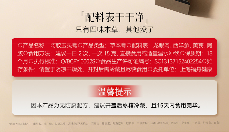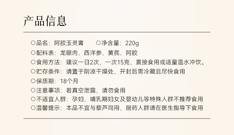 【品名】福牌阿胶玉灵膏 【规格】220g/盒 【保质期】18个月 【储存方法】请置于阴凉干燥处,开封后需冷藏且尽快食用。 【产地】山东 【发货地】山东 【发货快递】圆通、中通 【不发货区域】新疆,西藏,港澳台地区不发 【补邮费地区】青海,内蒙,海南+10元 【发货时效】48小时,节假日顺延 |