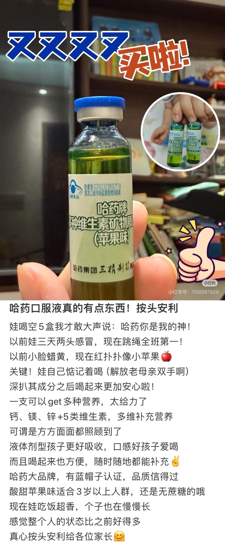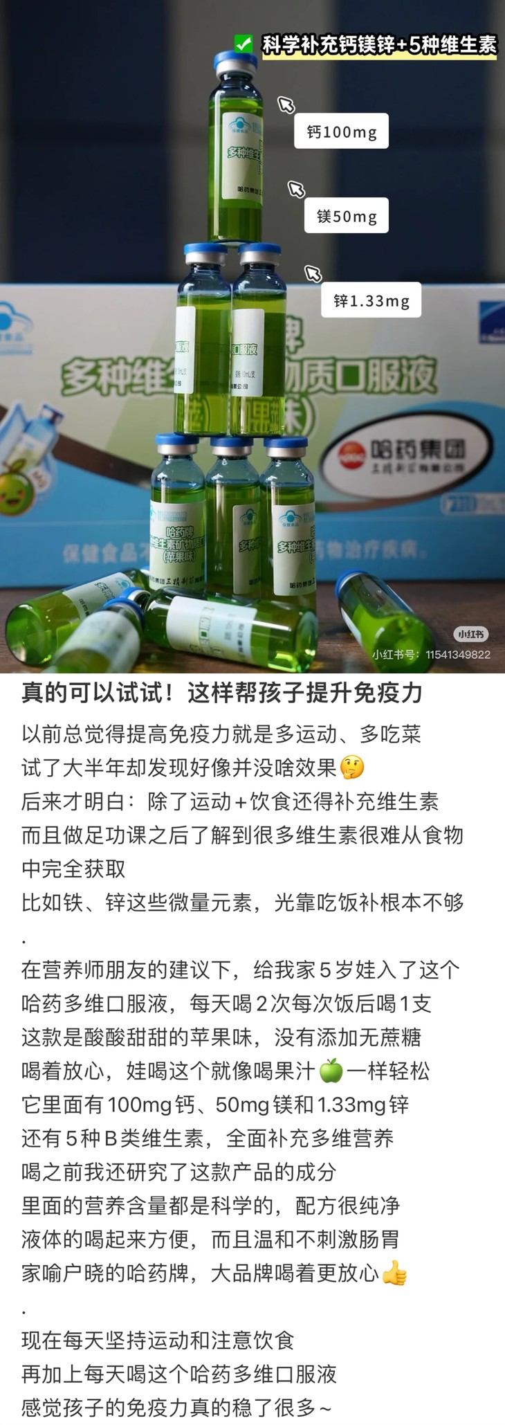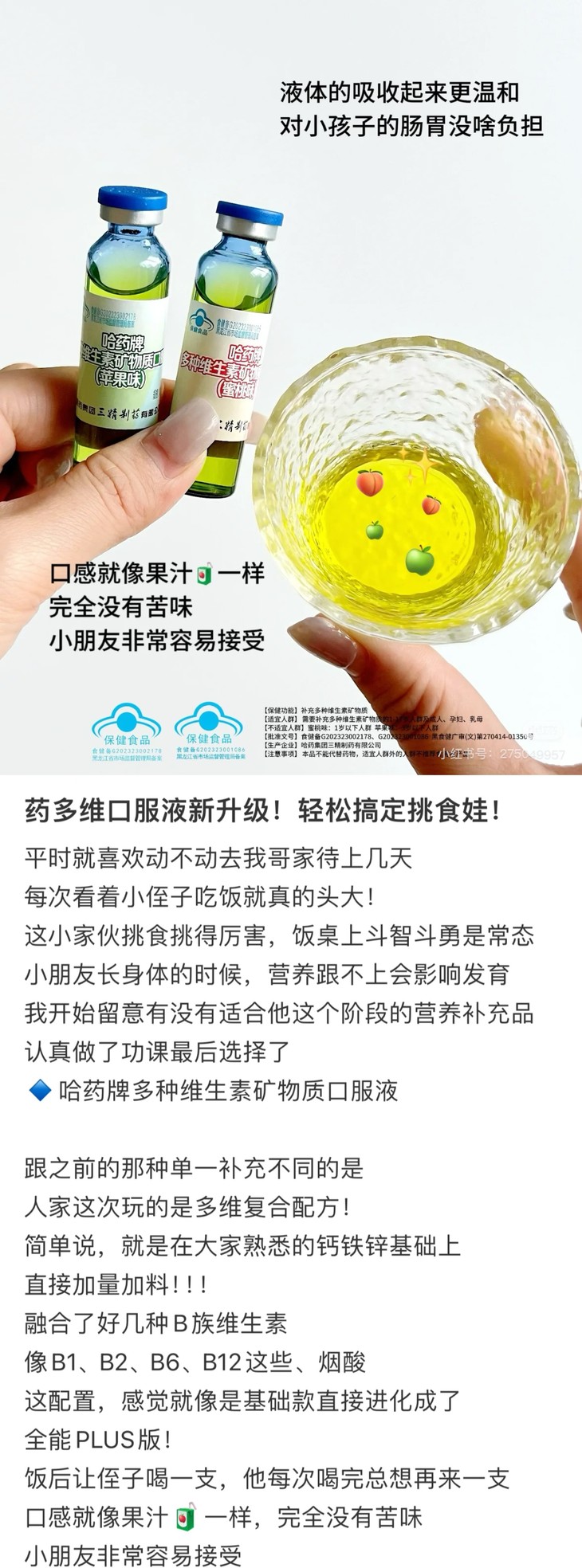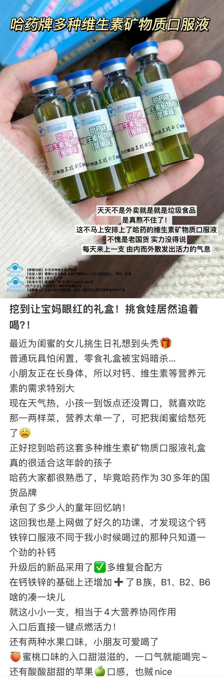 作为国内知名的医药品牌,哈药集团已拥有数十年深厚底蕴,相信不少家长对它都耳熟能详。从曾经广受欢迎的钙铁锌口服液,到如今的多种维生素矿物质口服液,哈药始终坚守初心,致力于为孩子们提供高品质的营养补充选择。即便在网络信息爆炸的时代,哈药没有像一些新兴品牌那样频繁活跃在社交媒体的聚光灯下,但它一直默默守护着一代又一代人的健康。选择哈药,无疑就是选择了一份踏实的安心。