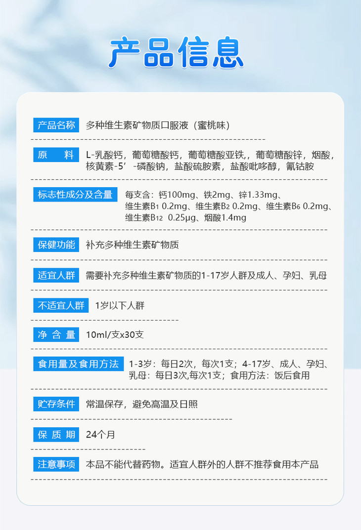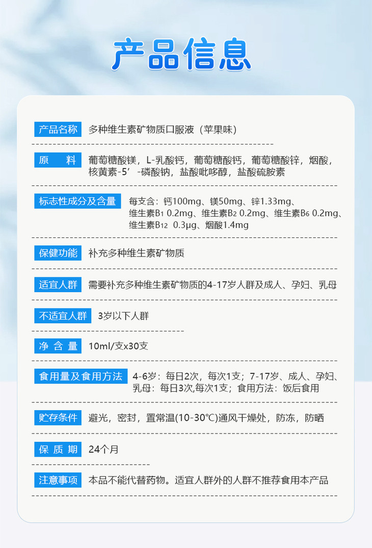 多种维生素矿物质口服液的营养配比十分科学,包含3大矿物质和5类维生素,具体来说就是钙、铁、锌以及B₁、B₂、B₆、B₁₂和烟酸(维生素B₃)。这些营养成分都是孩子成长过程中不可或缺的"好帮手":钙能为骨骼生长注入动力,助力孩子长得更高更壮;锌可以有效促进生长发育,同时提高孩子的免疫力;铁则有助于打造强健体魄,预防贫血问题。而B族维生素更是发挥着关键作用,能更好地促进孩子对这些营养的吸收,让营养补充的效果事半功倍。