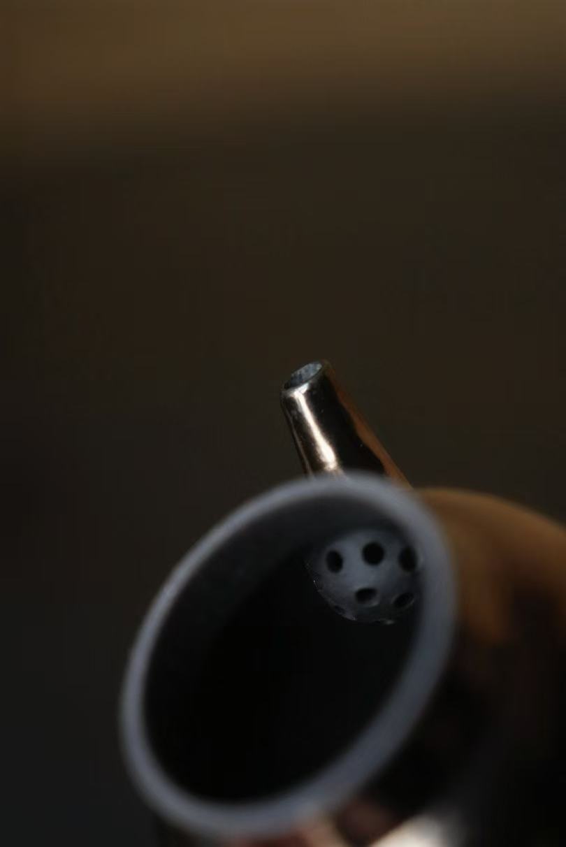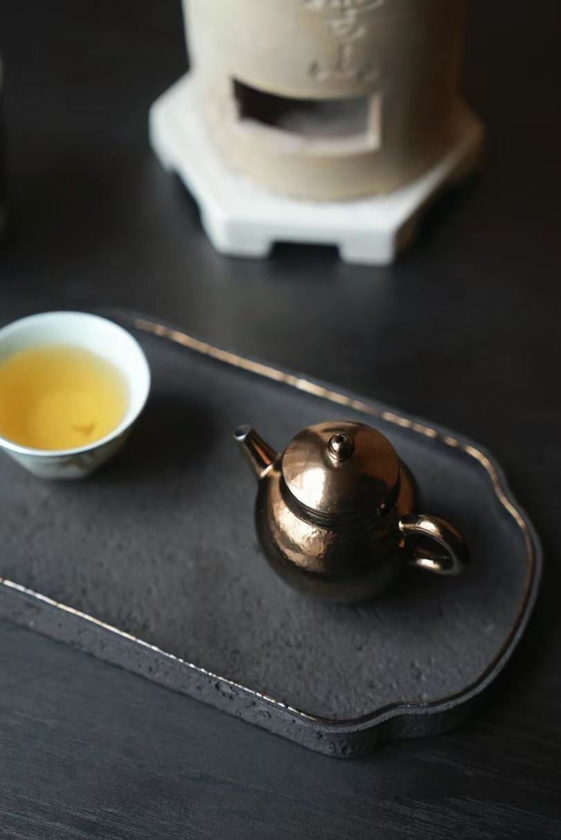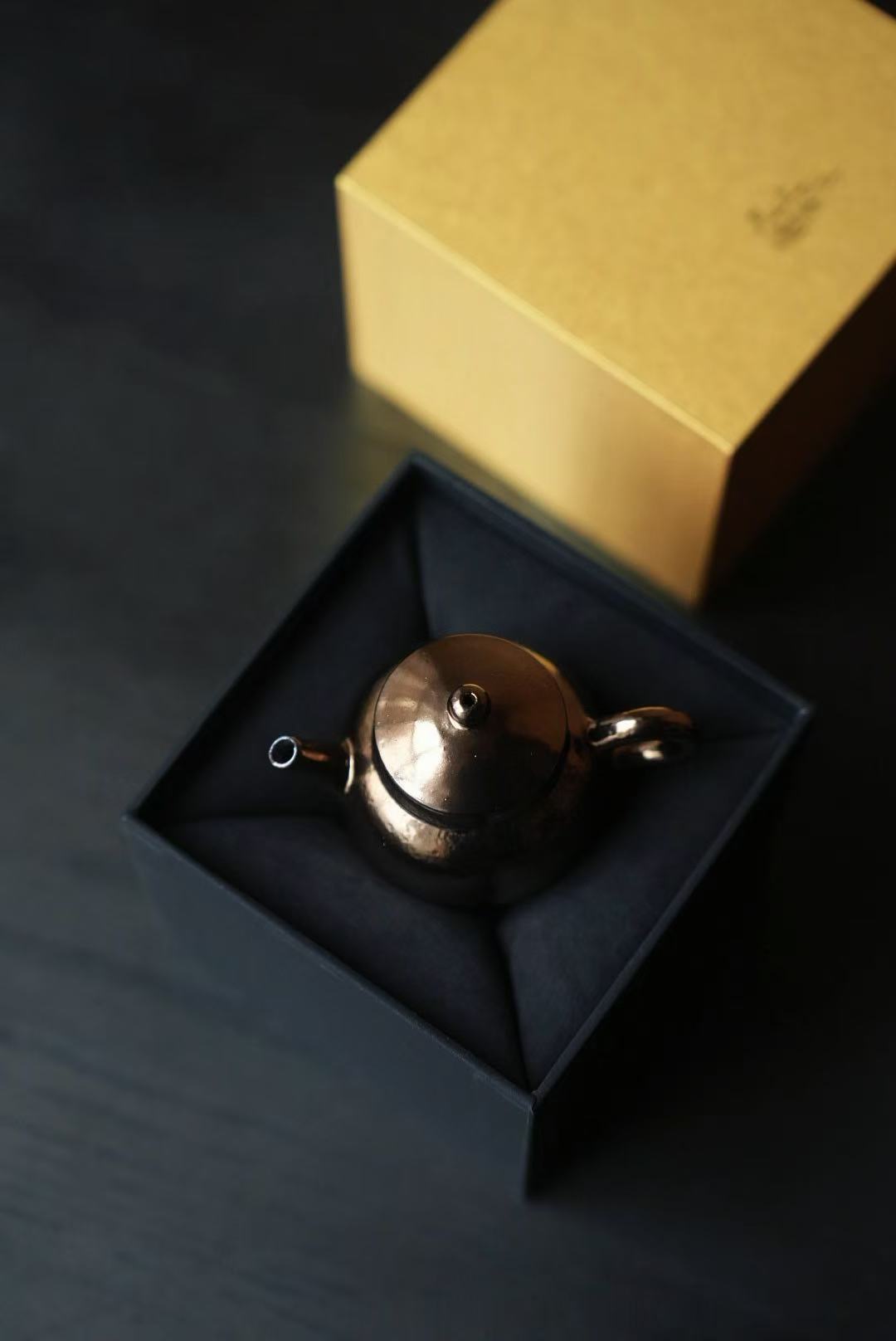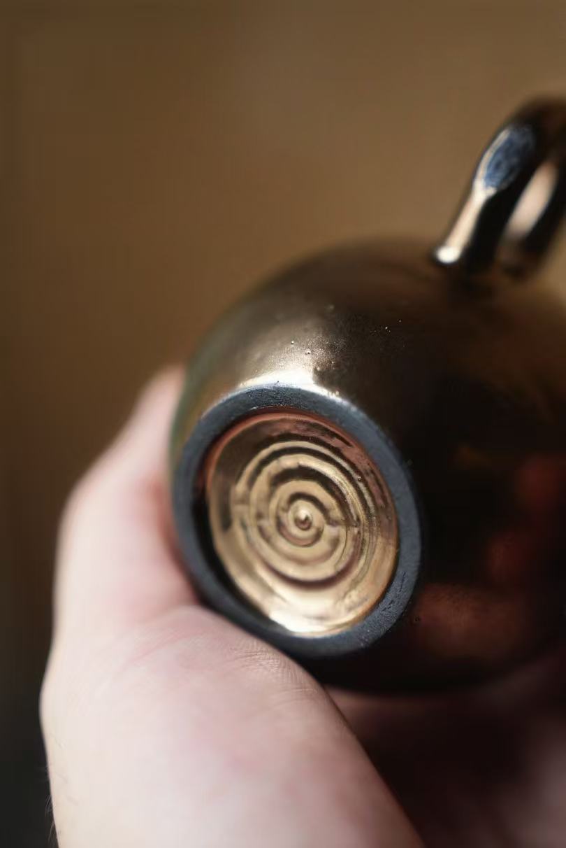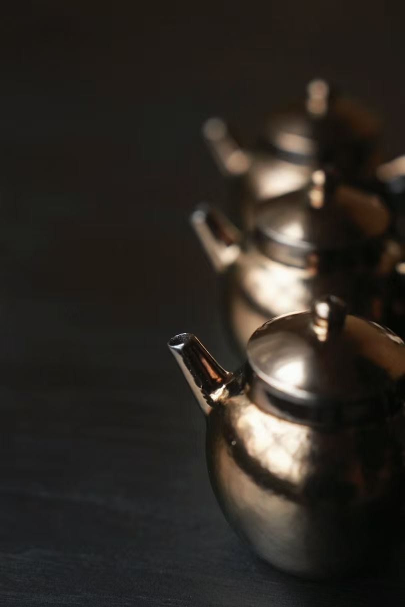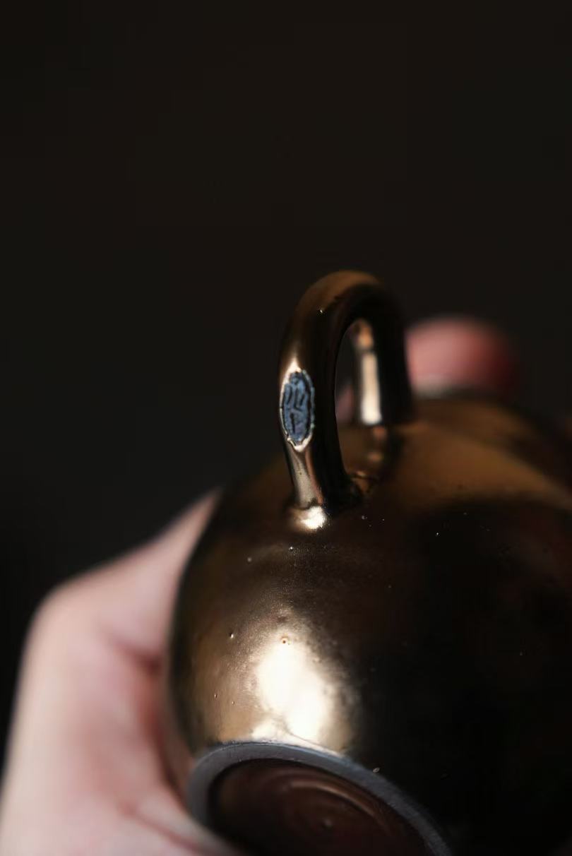 通体施古铜金釉,经高温窑烧后,釉面呈现出类似金属的温润光泽,黑底泛金,在光影下流转出细腻的金属质感,远看如银壶,近观是陶胎的温润,朴拙中藏着贵气,低调又高级。
