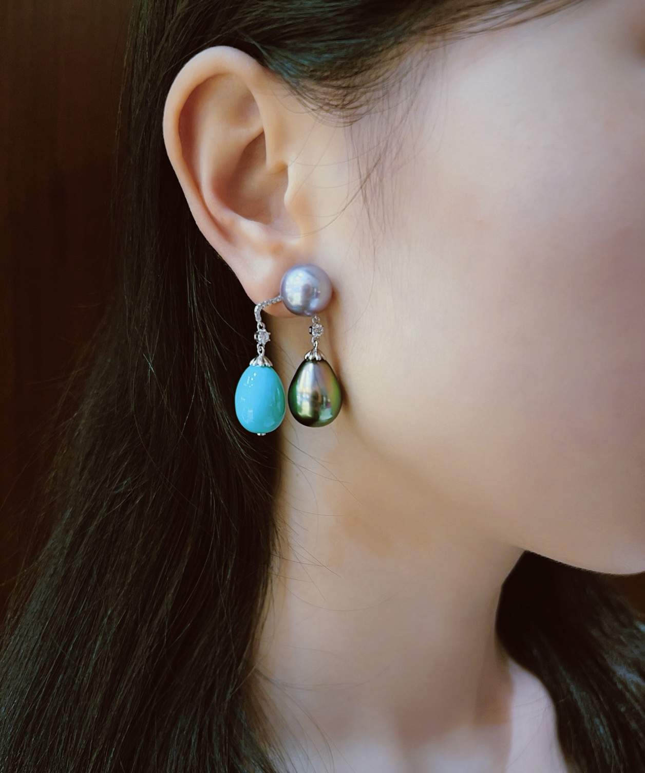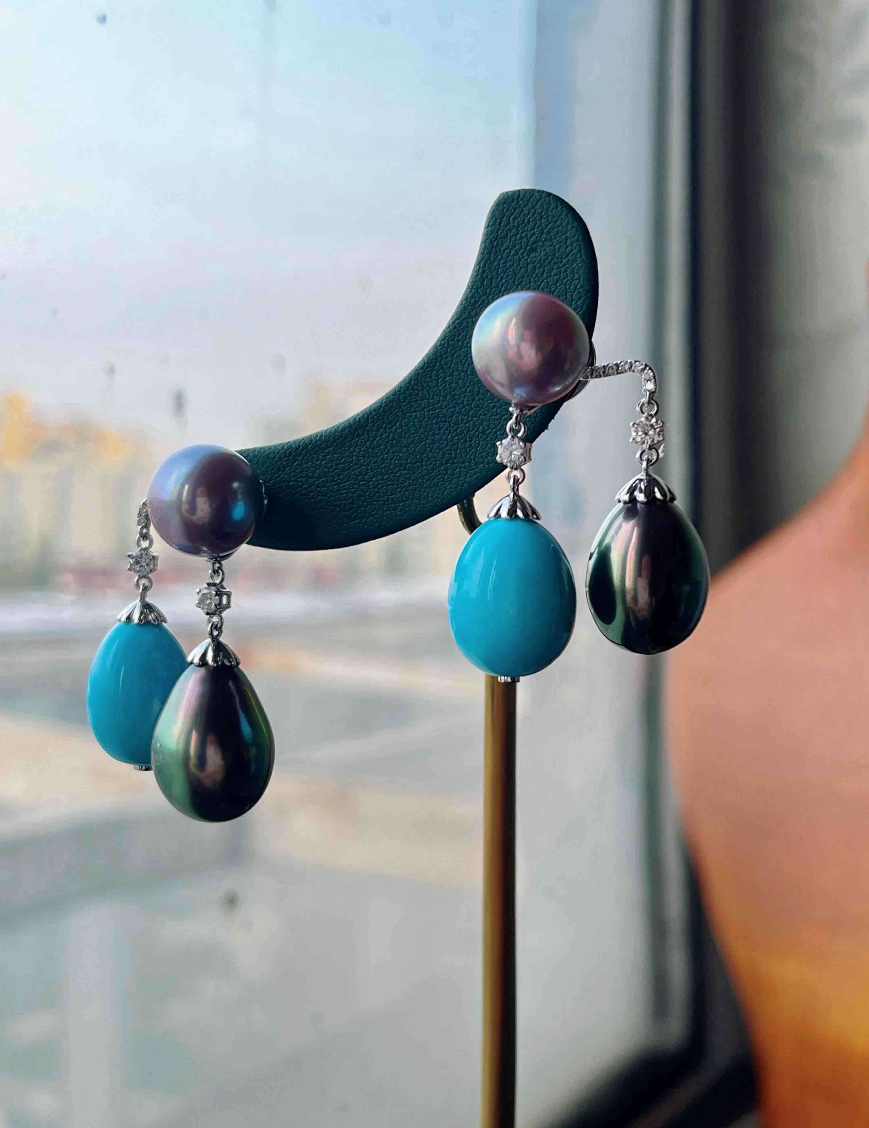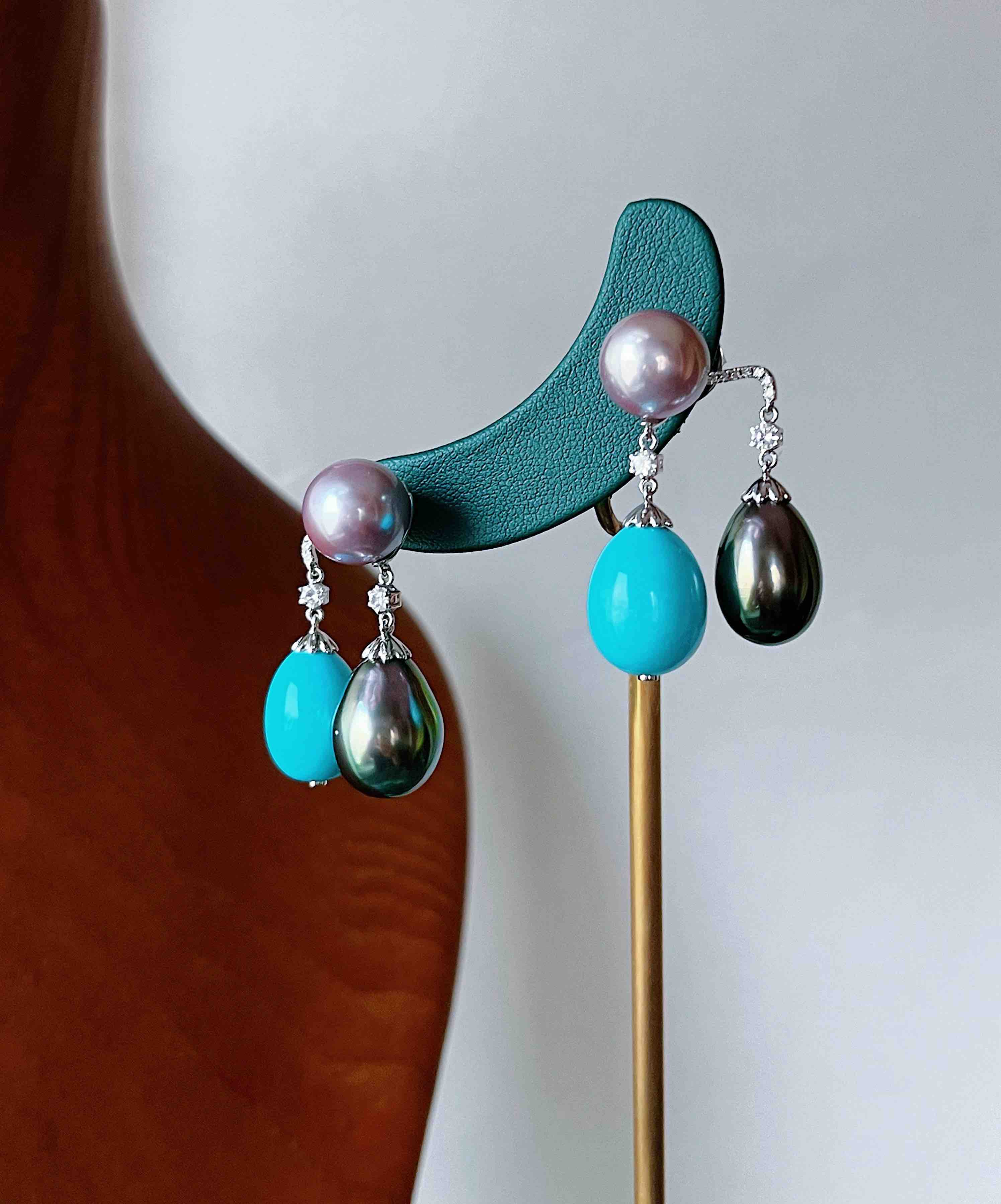 作品名称:18K镶钻石、松石、大溪地珍珠和