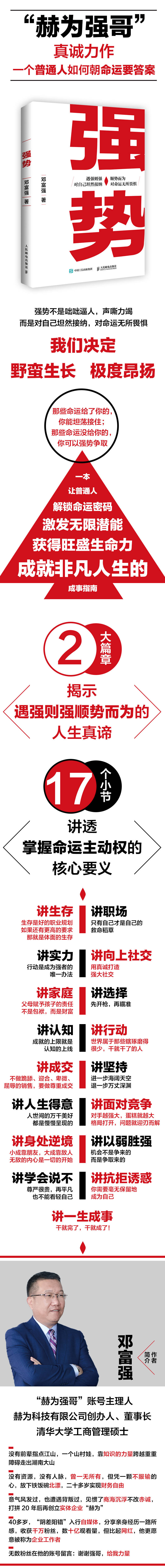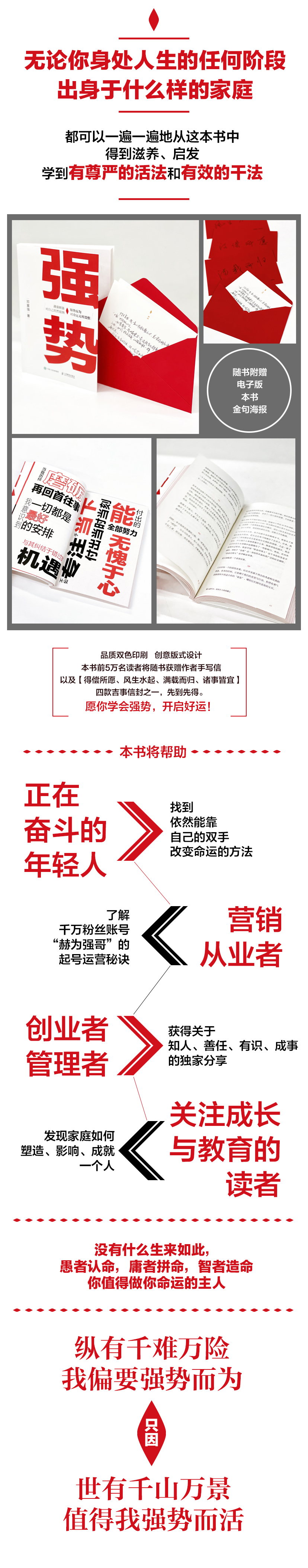 这是一本讲述一个普通人如何朝命运要答案的图书,作者是千万粉丝博主赫为强哥。 本书2大篇章揭示“遇强则强 顺势而为”的人生真谛,17个小节讲透普通人也能复制“掌握命运主动权”的核心要义。 无论你身处人生的任何阶段,出身于什么样的家庭,*可以一遍一遍地从这本书中得到滋养、启发,学到有尊严的活法和有效的干法。 没有什么生来如此,愚者认命,庸者拼命,智者造命,你值得做你命运的主人。