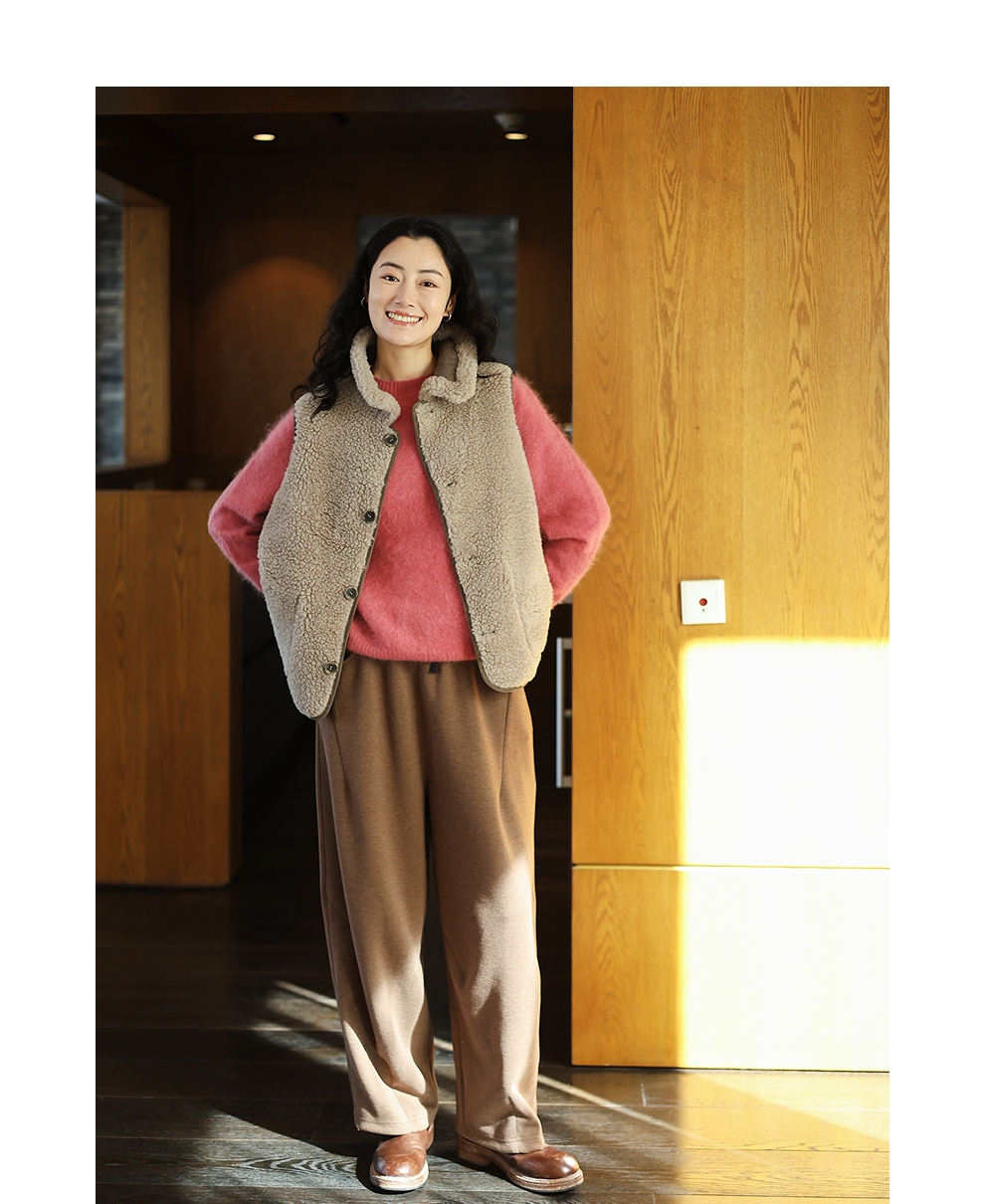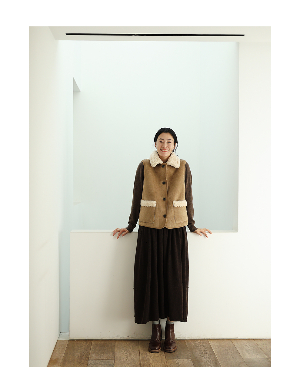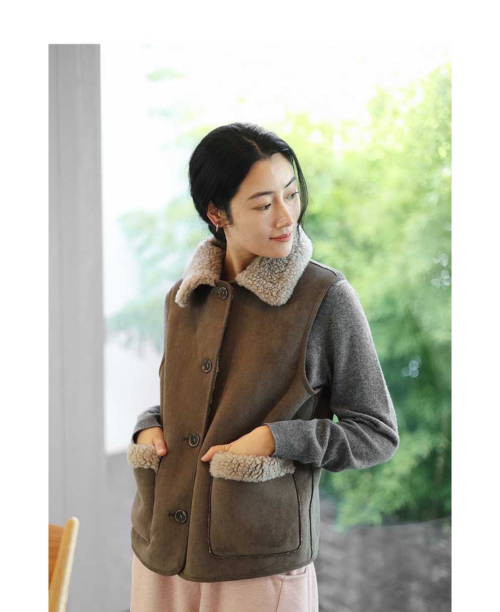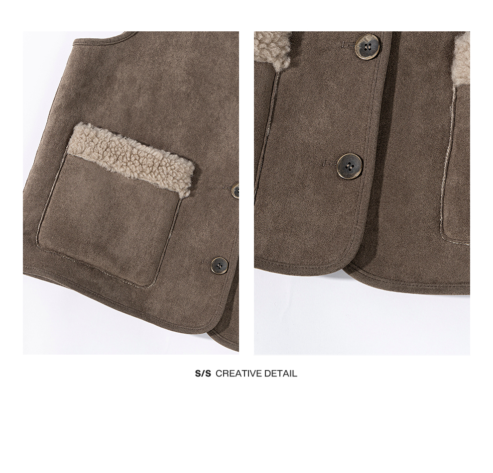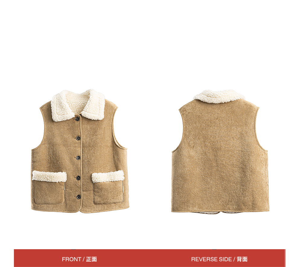 特绽放876朵/纯羊毛马夹双面穿麂皮羊羔毛撞色拼接叠搭马甲冬新款