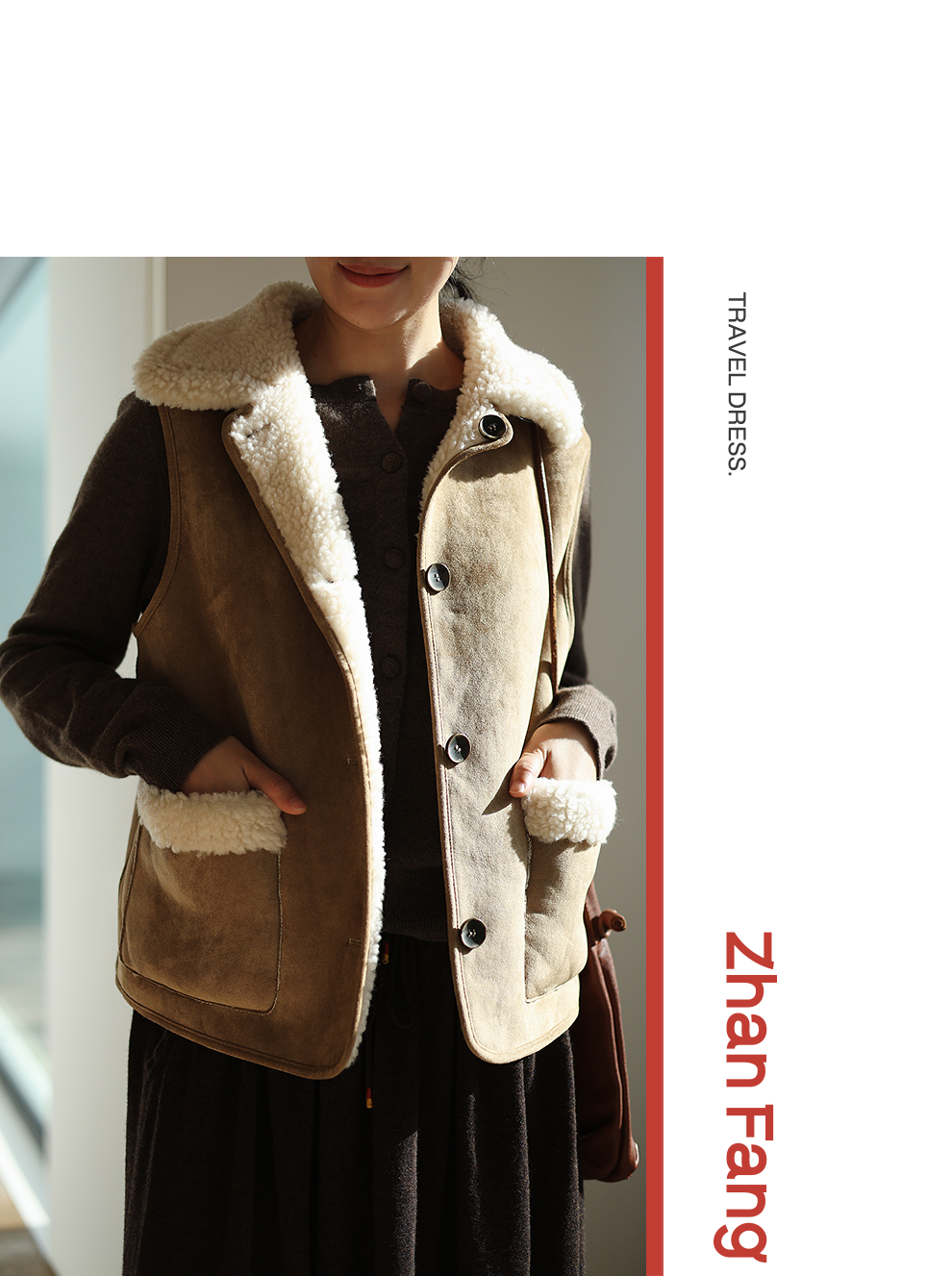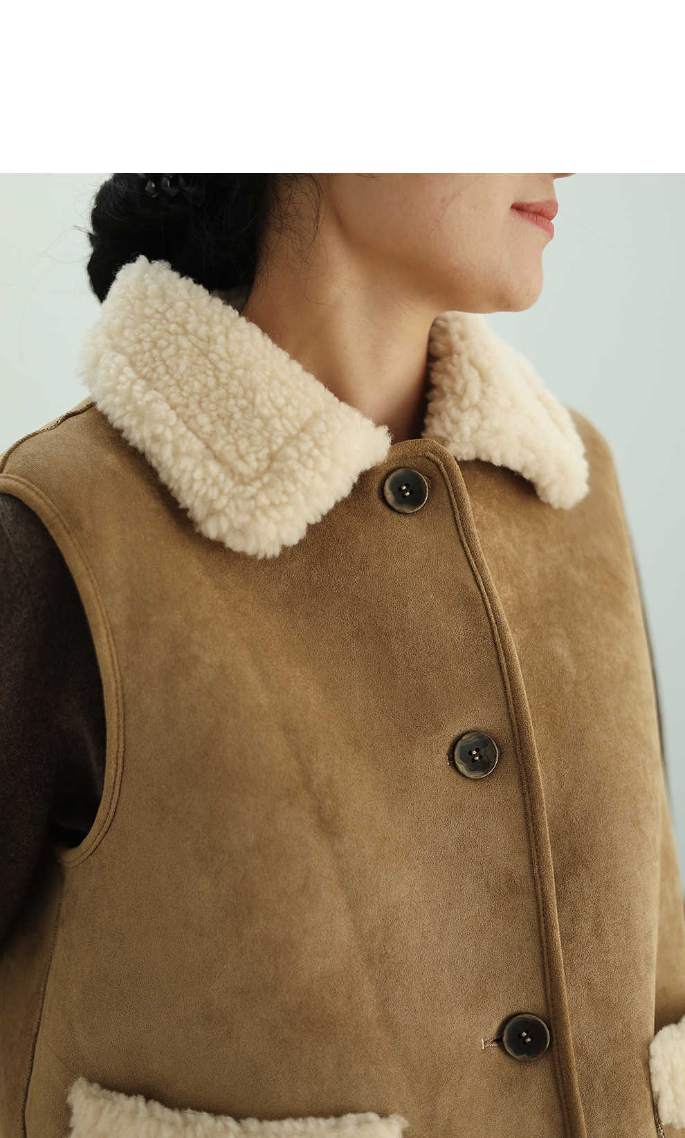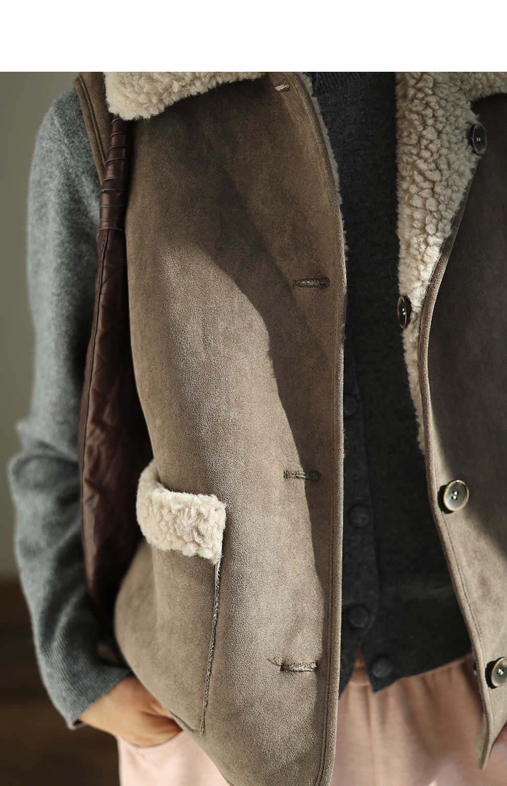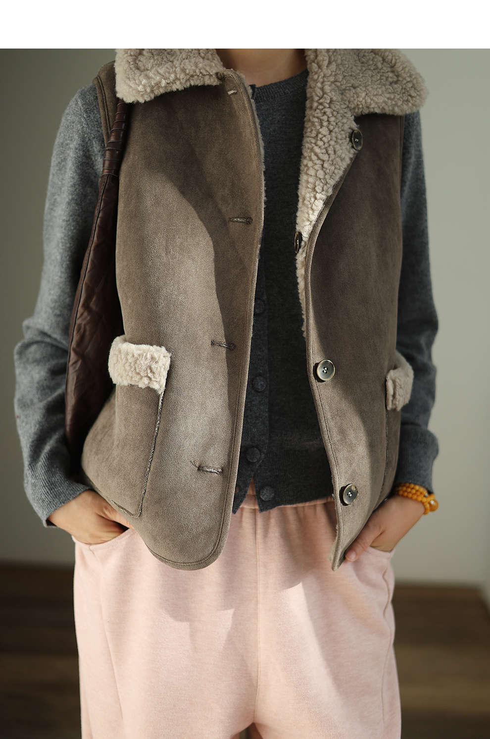 特绽放876朵/纯羊毛马夹双面穿麂皮羊羔毛撞色拼接叠搭马甲冬新款
