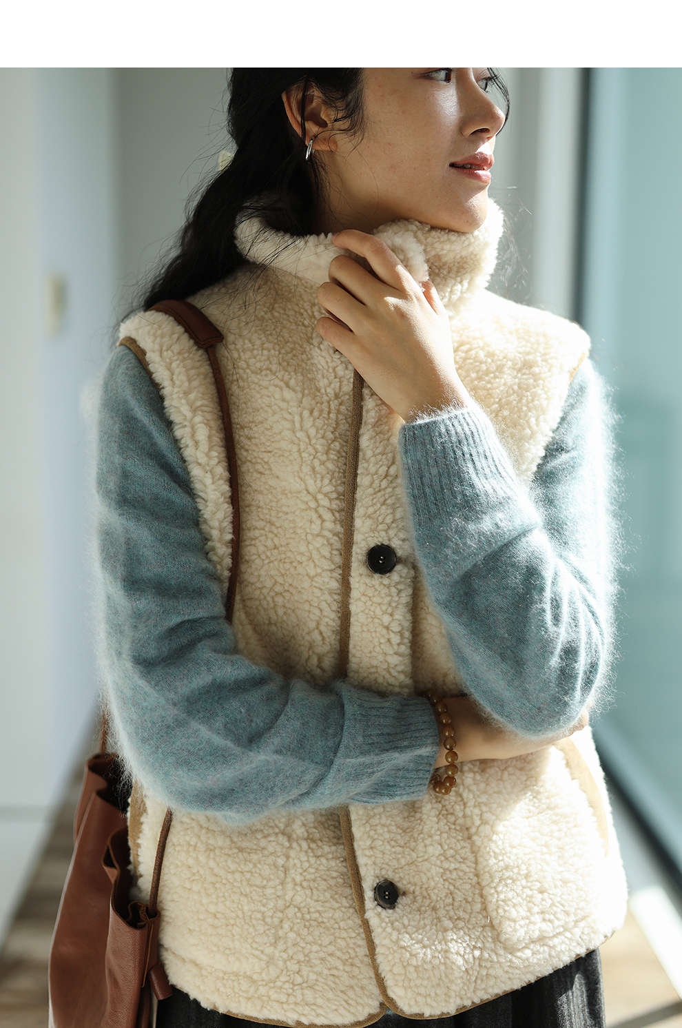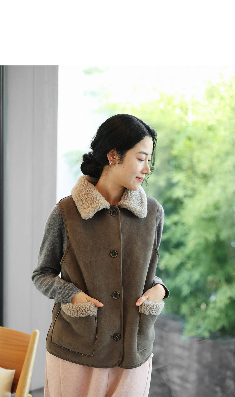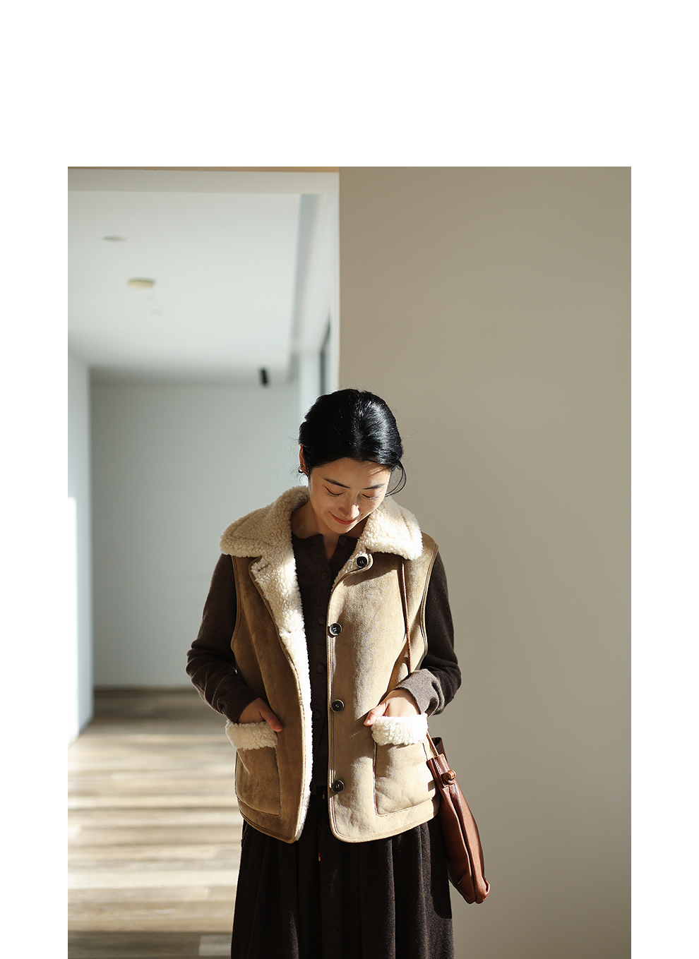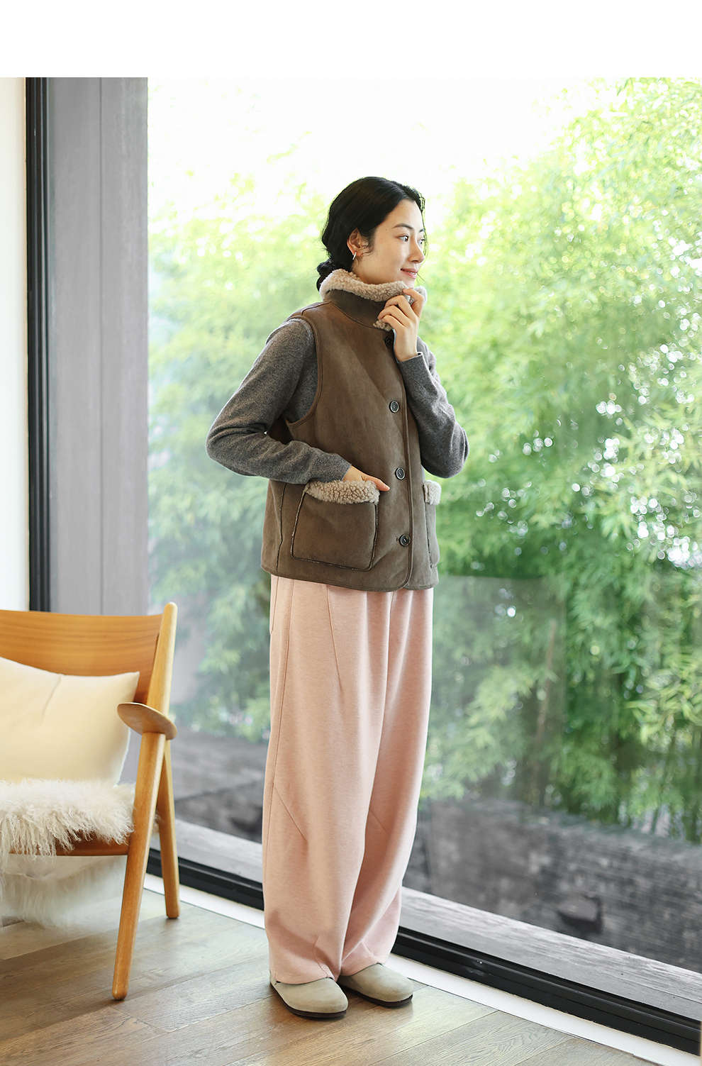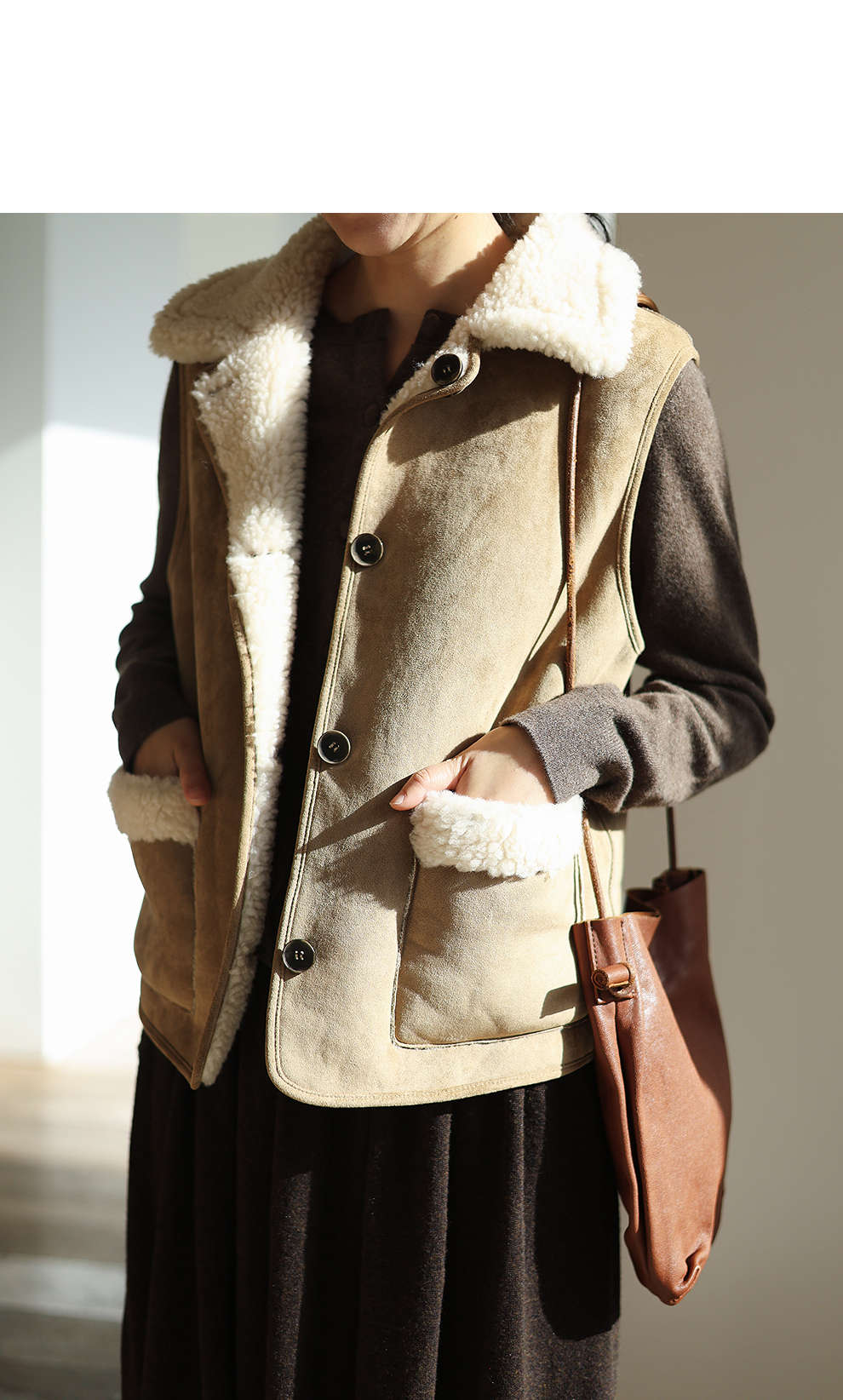 特绽放876朵/纯羊毛马夹双面穿麂皮羊羔毛撞色拼接叠搭马甲冬新款