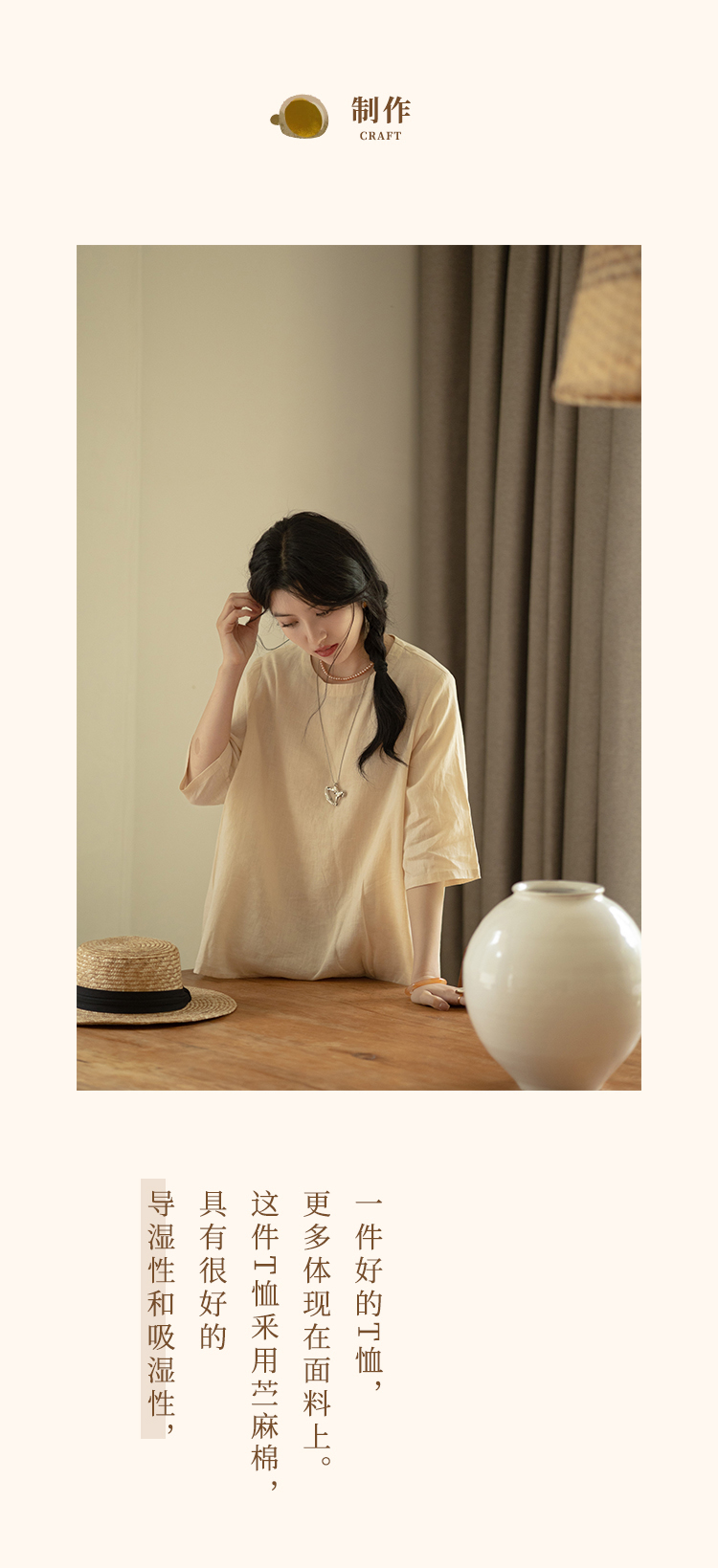 绽放345朵【甜茶系列·布丁】苎麻七分袖捏褶水滴扣宽松文艺T恤