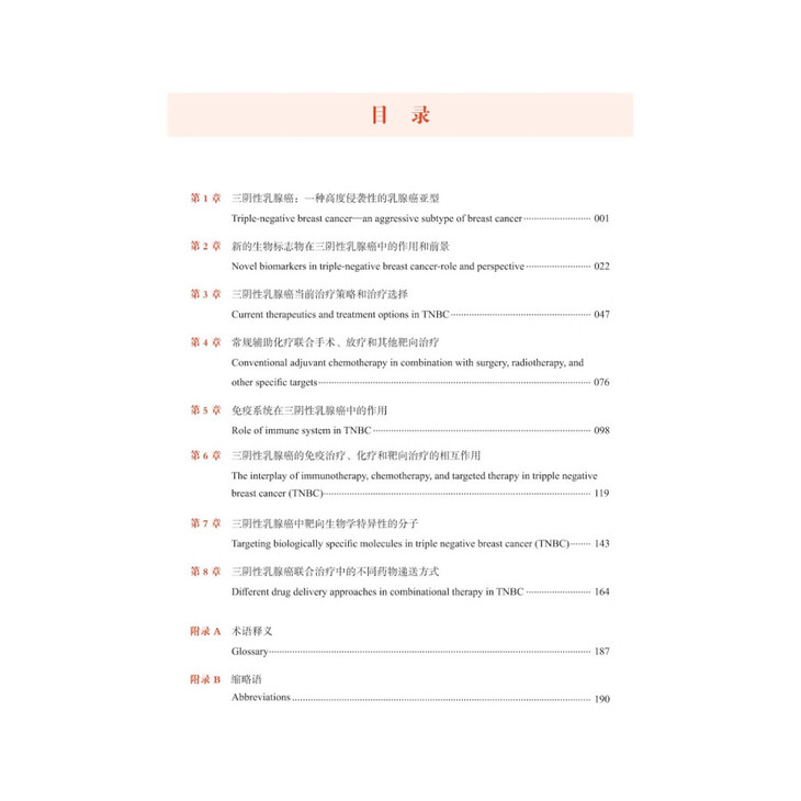 本书引进自 Elsevier 出版社,由癌症生物学与免疫学专家 Manzoor A. Mir 博士撰写,是一部全面介绍三阴性乳腺癌联合治疗的实用指南,不仅从分子水平上讨论了三阴性乳腺癌,还对这种特定癌症类型的联合治疗策略进行了系统介绍。对于三阴性乳腺癌这样的高级别肿瘤,因肿瘤细胞固有的遗传不稳定性会产生内在耐药性和获得性耐药性,因此采用单一疗法大多毫无价值。联合疗法降低了单一药物的剂量,但可提供更多或至少相同的治疗效果,并降低耐药性的风险,因此了解多种治疗方案至关重要。全书共 8 章,内容系统、阐释简明、配图丰富,可供对联合疗法治疗三阴性乳腺癌感兴趣的医生、癌症研究人员、肿瘤学家及生物学家借鉴参考。