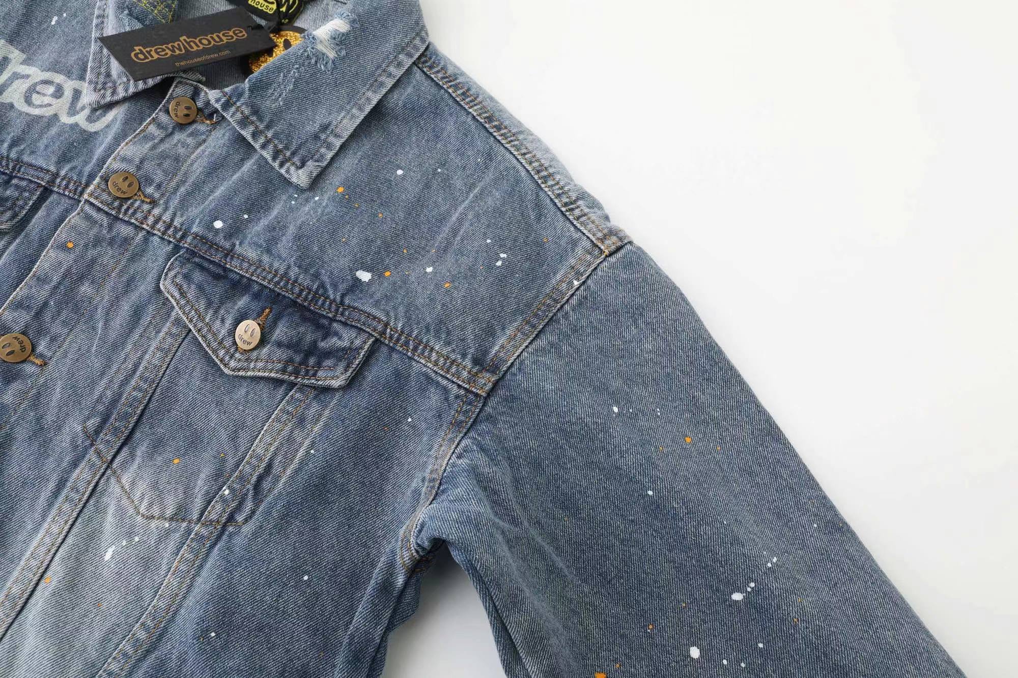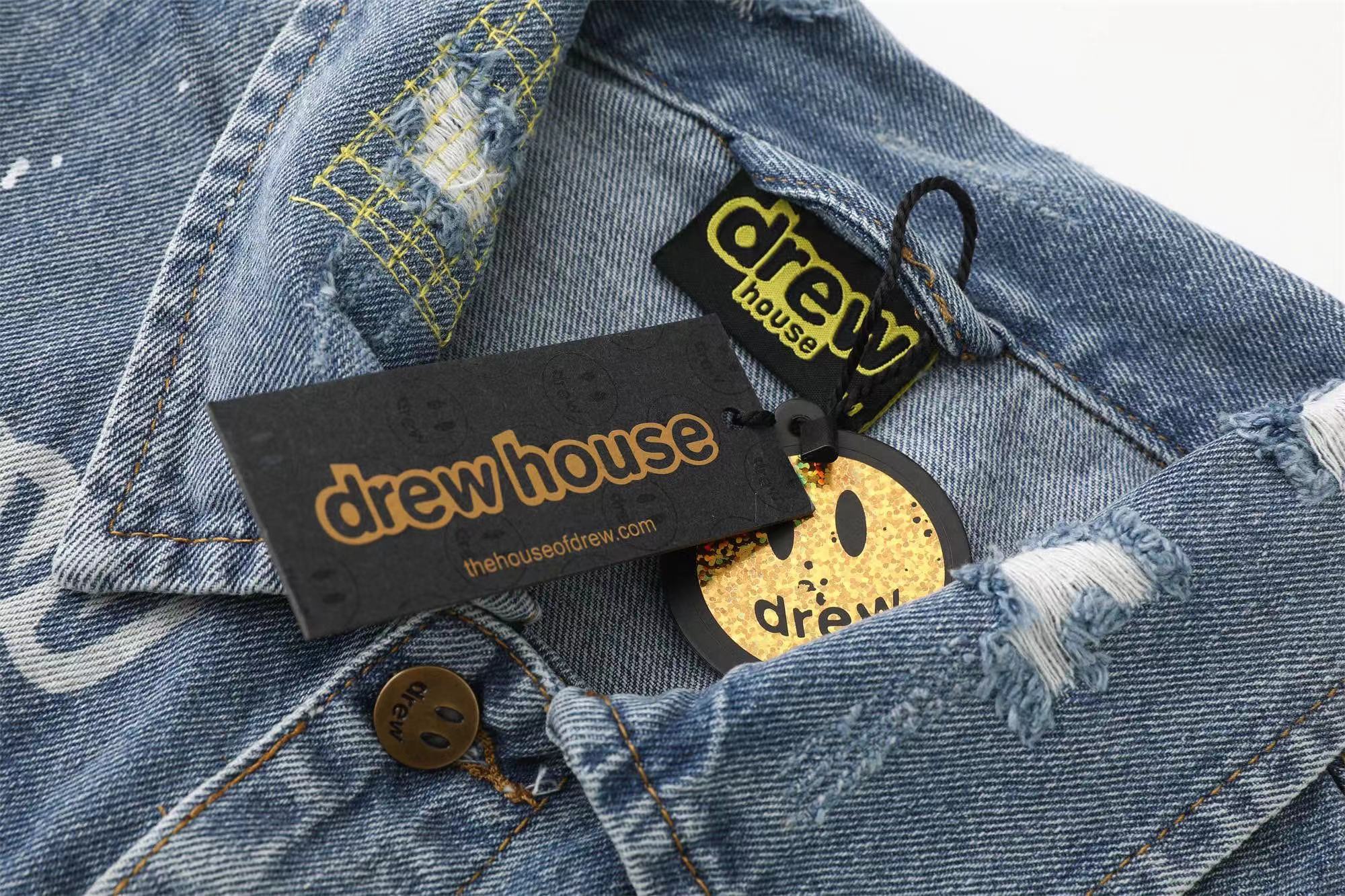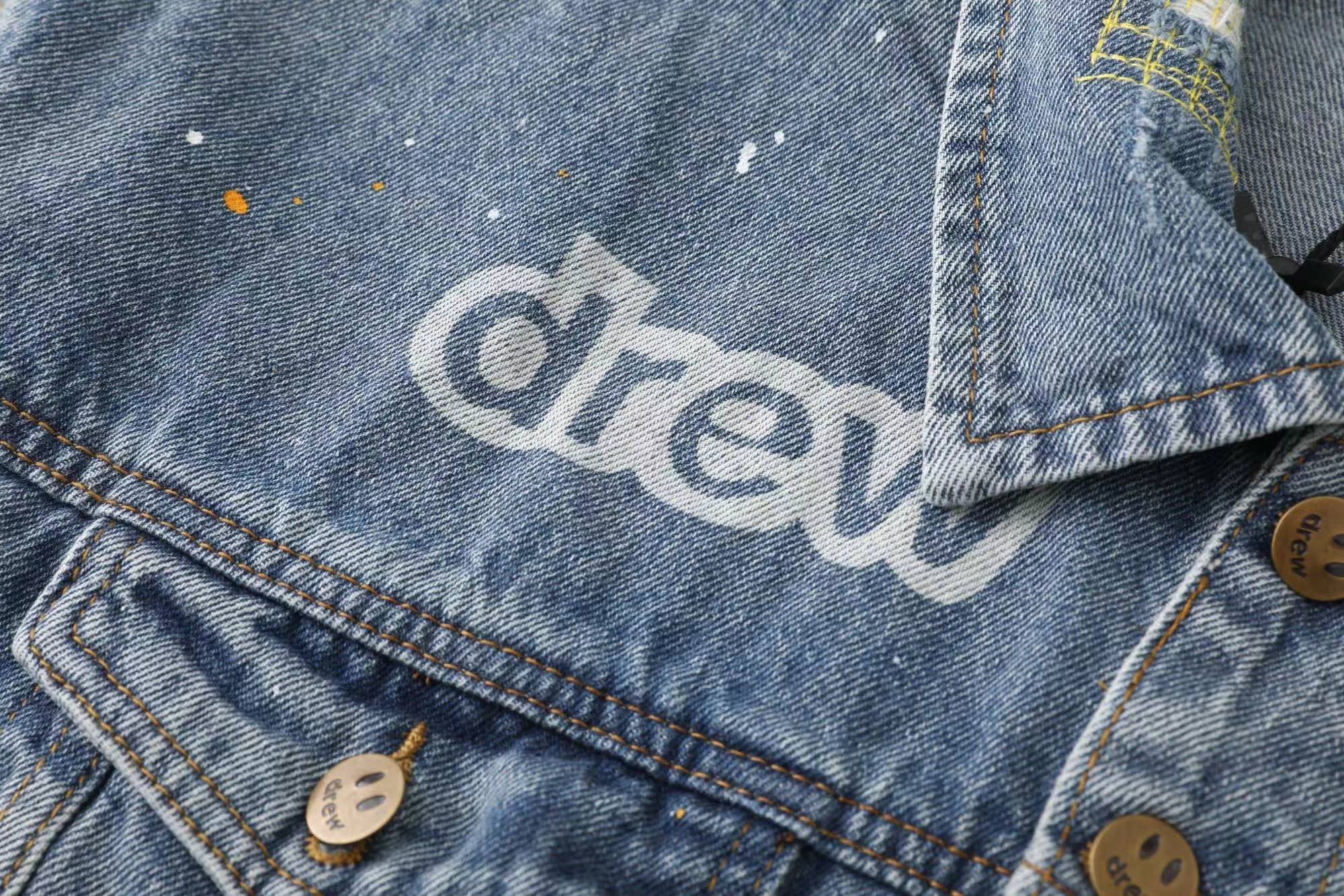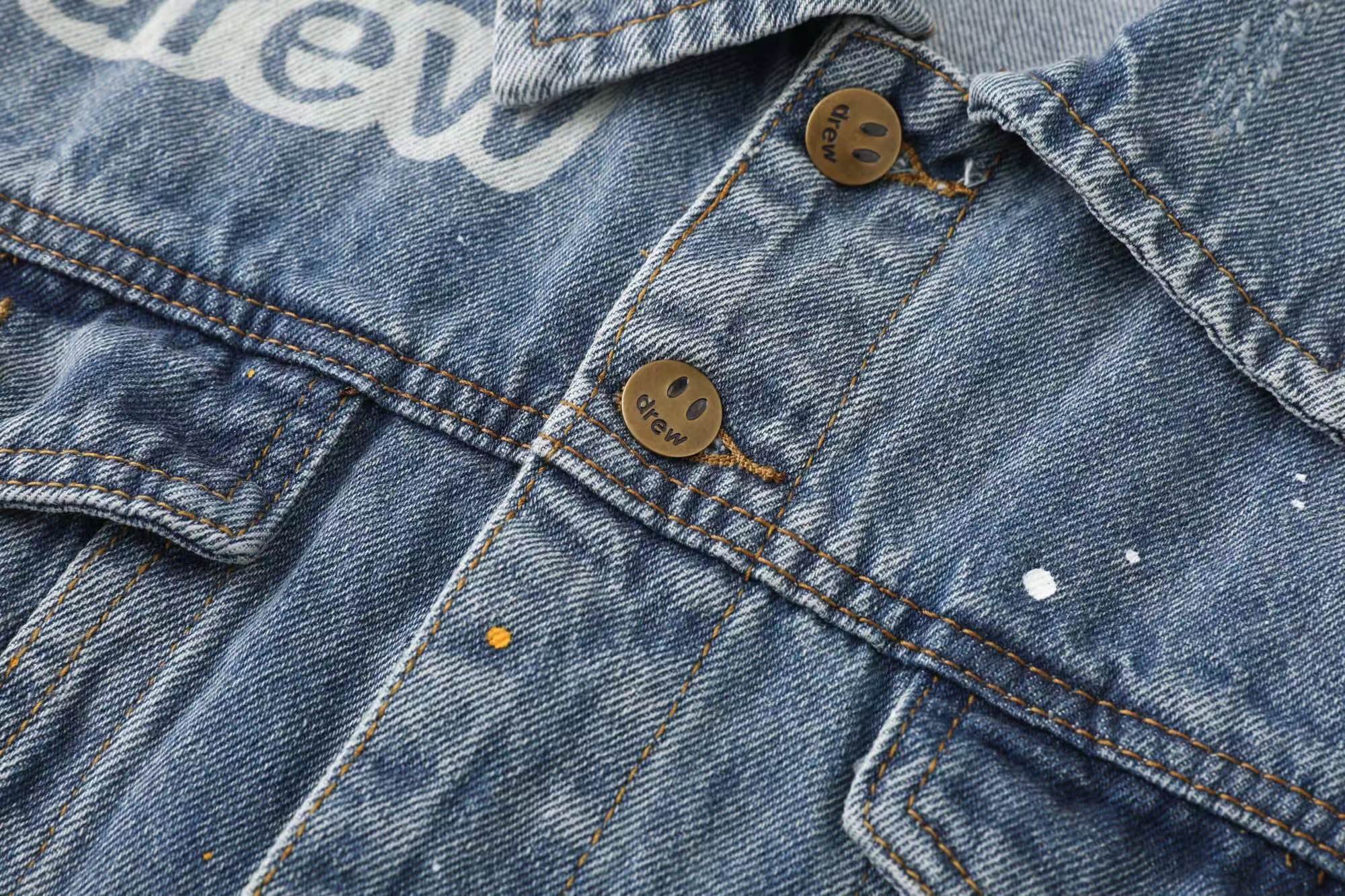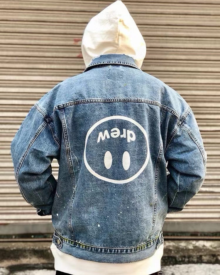 笑脸破洞破坏水洗泼墨刺绣牛仔夹克外套-重度水洗工艺,暗藏玄机的细节非常多,这次主推的裤子无论是版型还是上身都太wan美,从刺绣到印花以及口袋力度笑脸还有扣子的笑脸的每一个细节,都是一点一点去抠,毫不夸张的说做一条牛仔裤,不如去做20件短袖的时间,面料采用12.2盎司牛仔布,牛仔只有到了12盎司以上才有牛仔独特的gao端质感,水洗数次打样非常满意,右后口袋开模压印笑脸LOGO,左腿处采用笑脸LOGO刺绣,裤子破坏内里采用白色纯棉斜纹布,上面有胶浆印花的笑脸LOGO,口袋布工艺同上