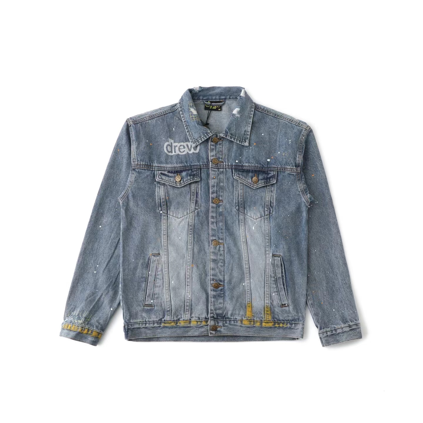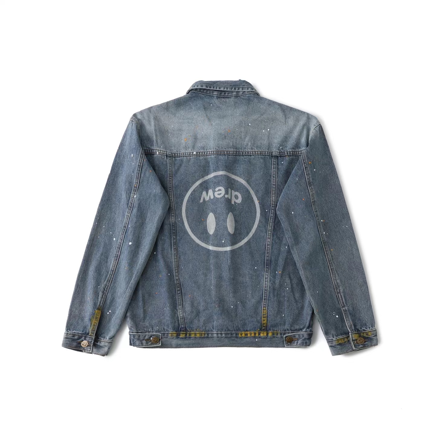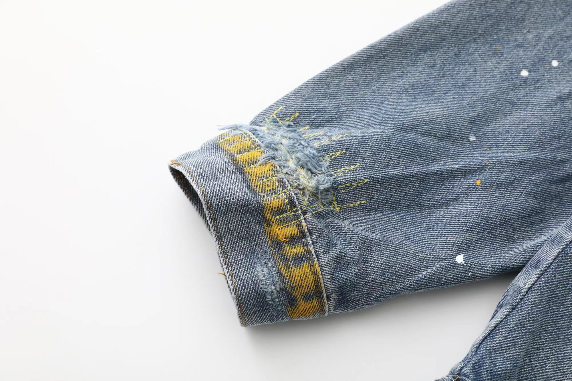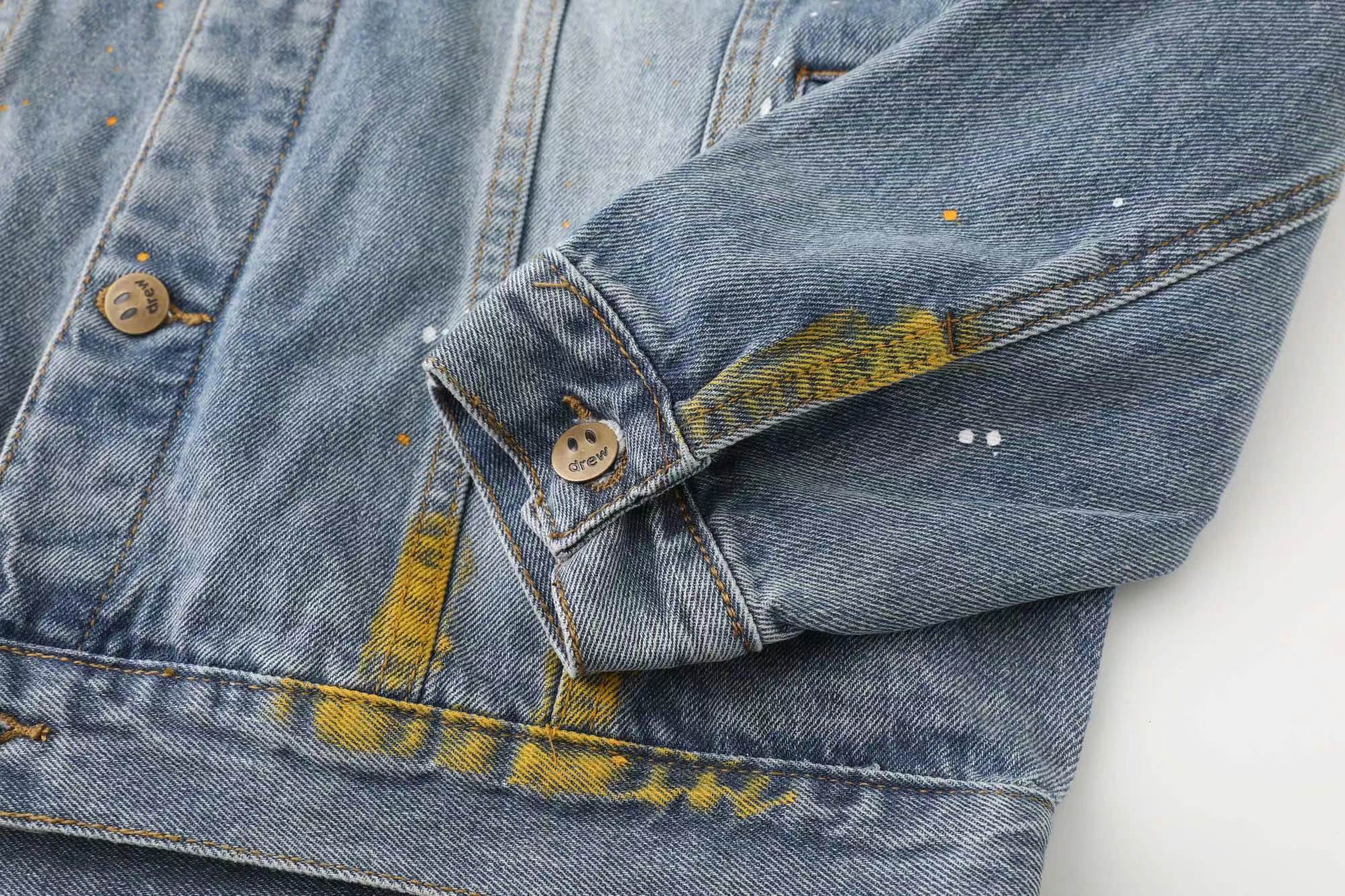 笑脸破洞破坏水洗泼墨刺绣牛仔夹克外套-重度水洗工艺,暗藏玄机的细节非常多,这次主推的裤子无论是版型还是上身都太wan美,从刺绣到印花以及口袋力度笑脸还有扣子的笑脸的每一个细节,都是一点一点去抠,毫不夸张的说做一条牛仔裤,不如去做20件短袖的时间,面料采用12.2盎司牛仔布,牛仔只有到了12盎司以上才有牛仔独特的gao端质感,水洗数次打样非常满意,右后口袋开模压印笑脸LOGO,左腿处采用笑脸LOGO刺绣,裤子破坏内里采用白色纯棉斜纹布,上面有胶浆印花的笑脸LOGO,口袋布工艺同上