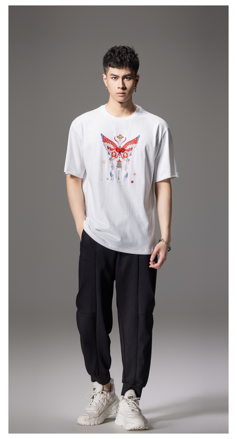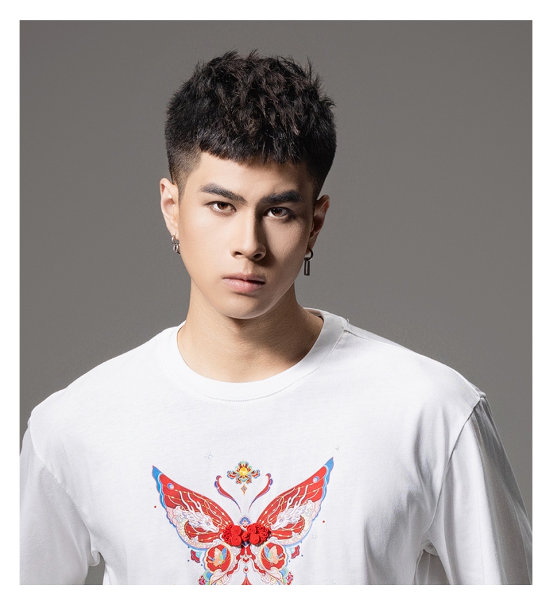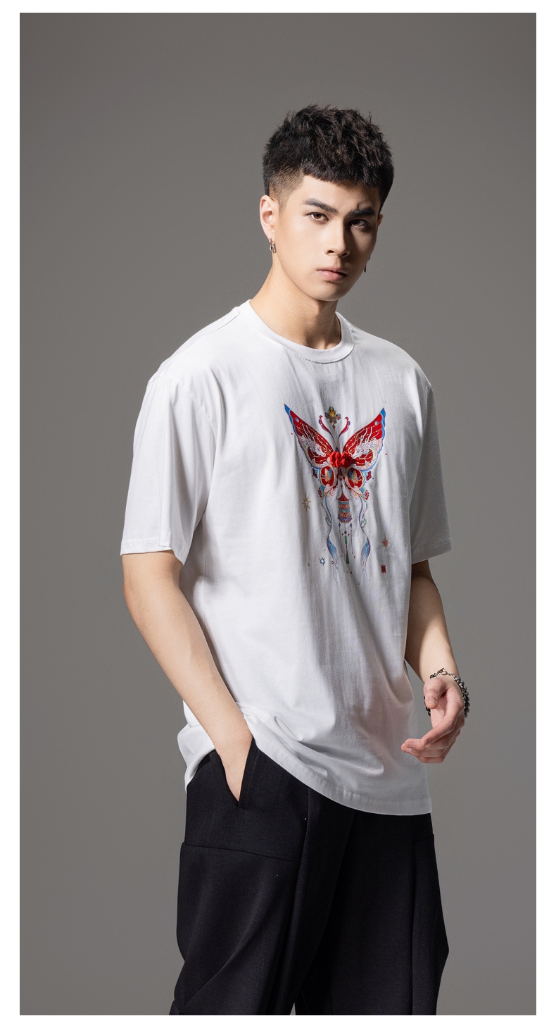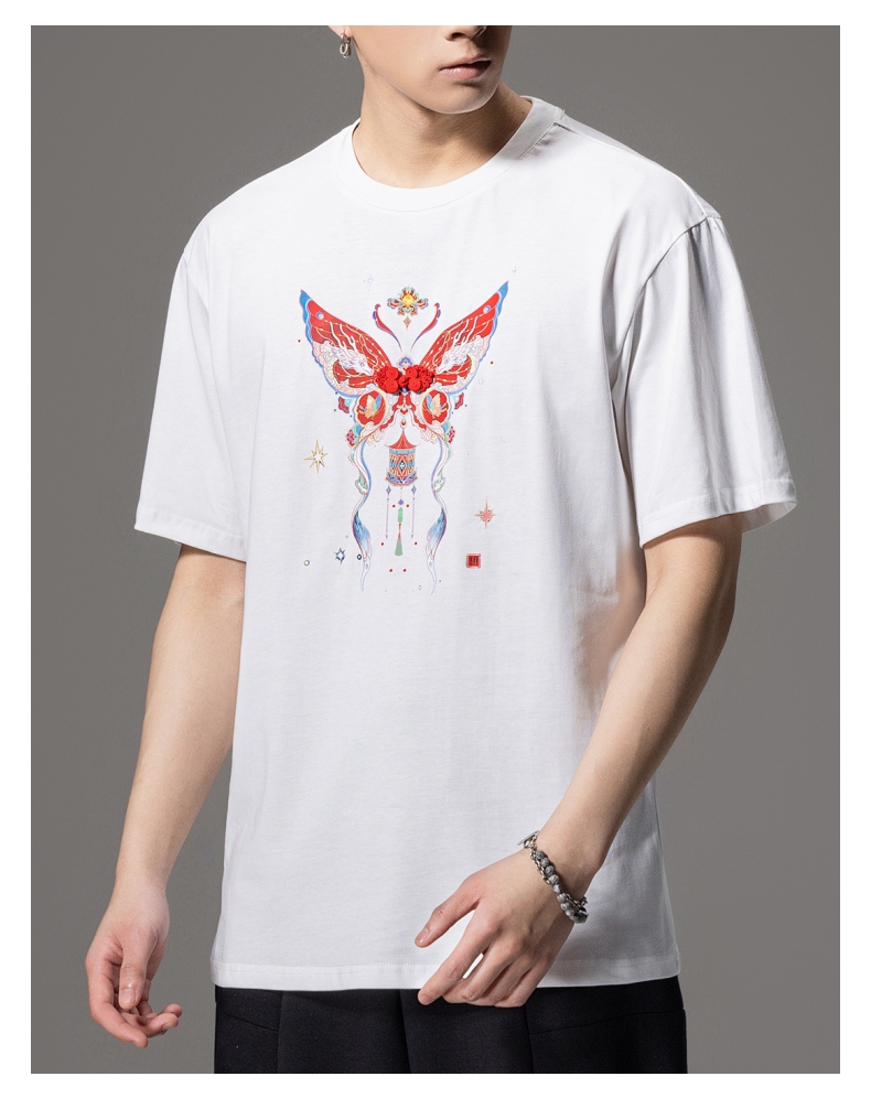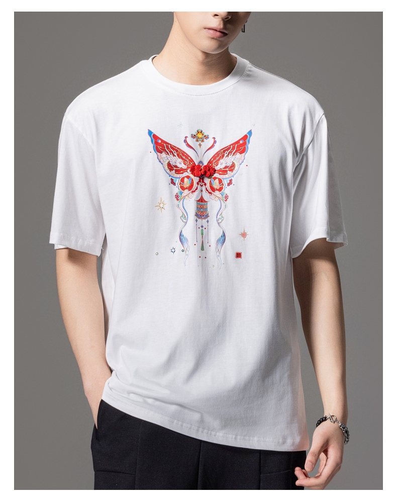 PINLI品立2024新中式夏季新款蝴蝶印花圆领短袖T恤男BG242111031