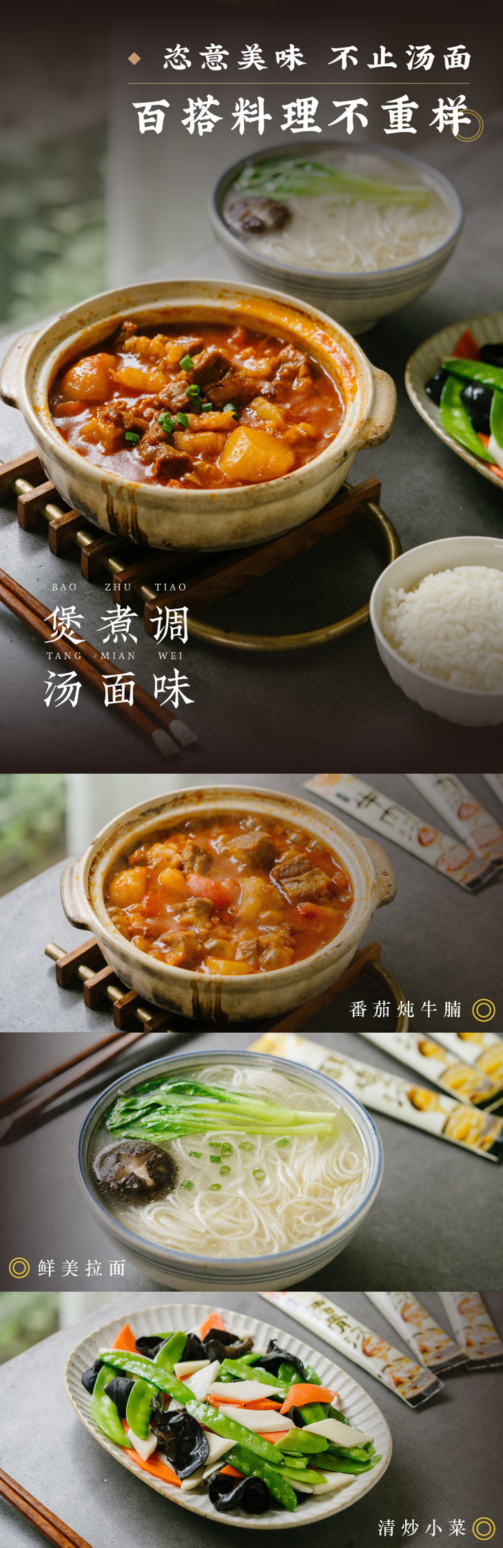 高汤每袋120克,内含4支,30克独立包装,一次用一支,不用担心开封后用不完变质。储存也不用占用冰箱空间,常温就行,保质期长达9个月,囤几袋在家,随时能派上用场。煮面时加一支,500-600毫升水煮沸,就是一碗媲美拉面店的鲜美汤底;炖番茄牛腩、萝卜排骨汤时倒入,能让肉质更软嫩、汤汁更浓郁;甚至炒菜时加一点,都能瞬间提升菜品鲜度,让家常小炒秒变“硬菜”;下小火锅时作为底料,也是清爽又增鲜!