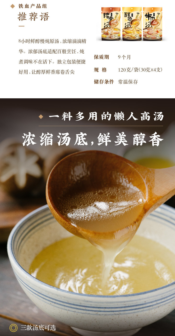 三味浓缩高汤味道也各有千秋。清炖牛肉汤精选牛肉与牛棒骨,汤底醇厚回味,自带牛肉的香浓;醇香鲜鸡汤以广东母鸡为原料,炖煮出的汤品清澈,鲜美不油腻,喝一口满是温润;大棒猪骨汤则用猪后腿棒骨熬制,满满骨胶原融入汤中,鲜入骨髓,浓郁得能挂壁!