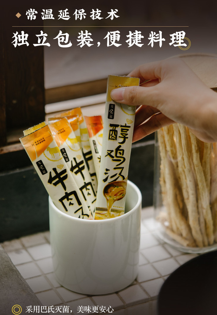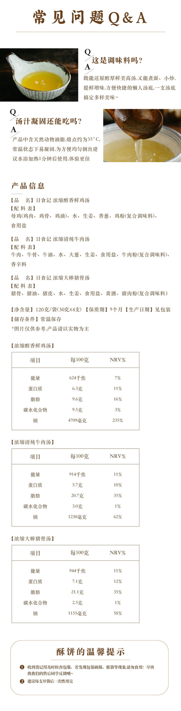 温馨小提示:产品含天然动物油脂,熔点约35℃,常温下容易凝固,建议用前水浴加热1分钟,这样倾倒更顺畅,滋味也能更好地释放。另外,由于高汤本身已经过精准调味,钠含量和鲜味都很充足,烹饪时基本不用额外加盐和味精,既方便又能避免摄入过多盐分。