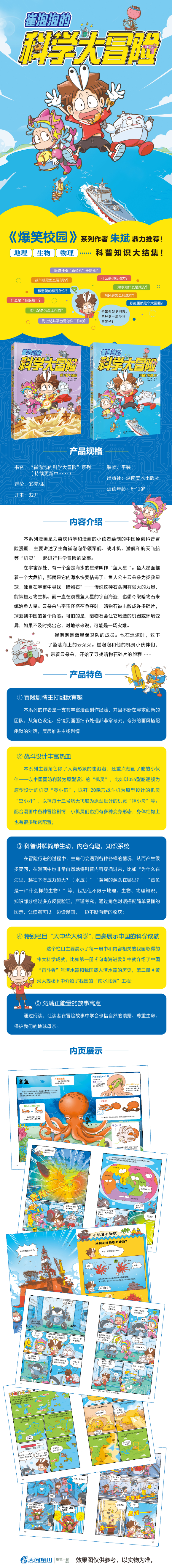 在冒险行进的过程中,主角们会遇到各种各样的情况,从而产生很多疑问,在漫画中也非常自然地将科普内容穿插进来,比如;为什么在海里,越往下潜压力越大?(水压);黄河的源头在哪里?;章鱼是一种什么样的生物?等,包括但不限于地理、生物、物理知识, 知识部分经过多方反复验证,严谨考究,通过角色对话搭配简单易懂的图示,让读者可以一边读漫画,一边不断有新的收获;