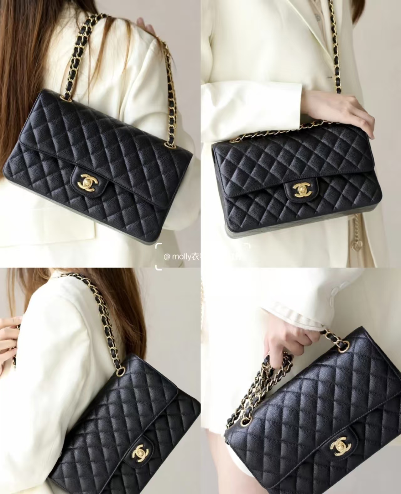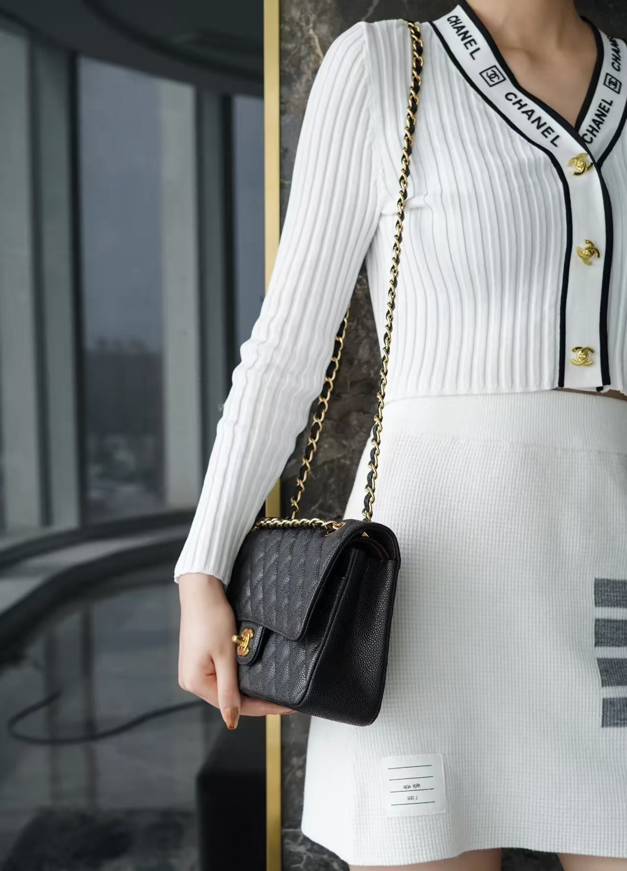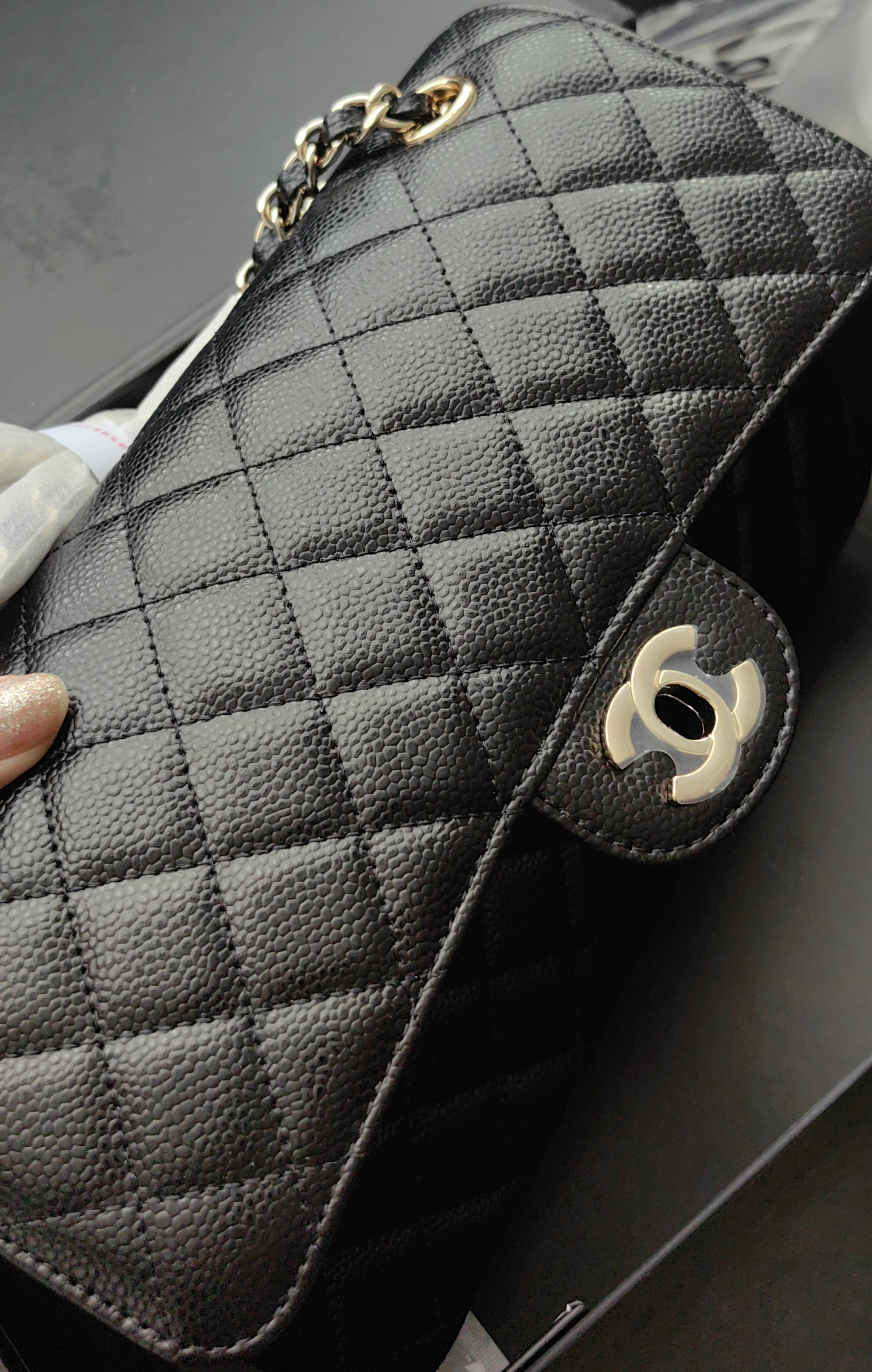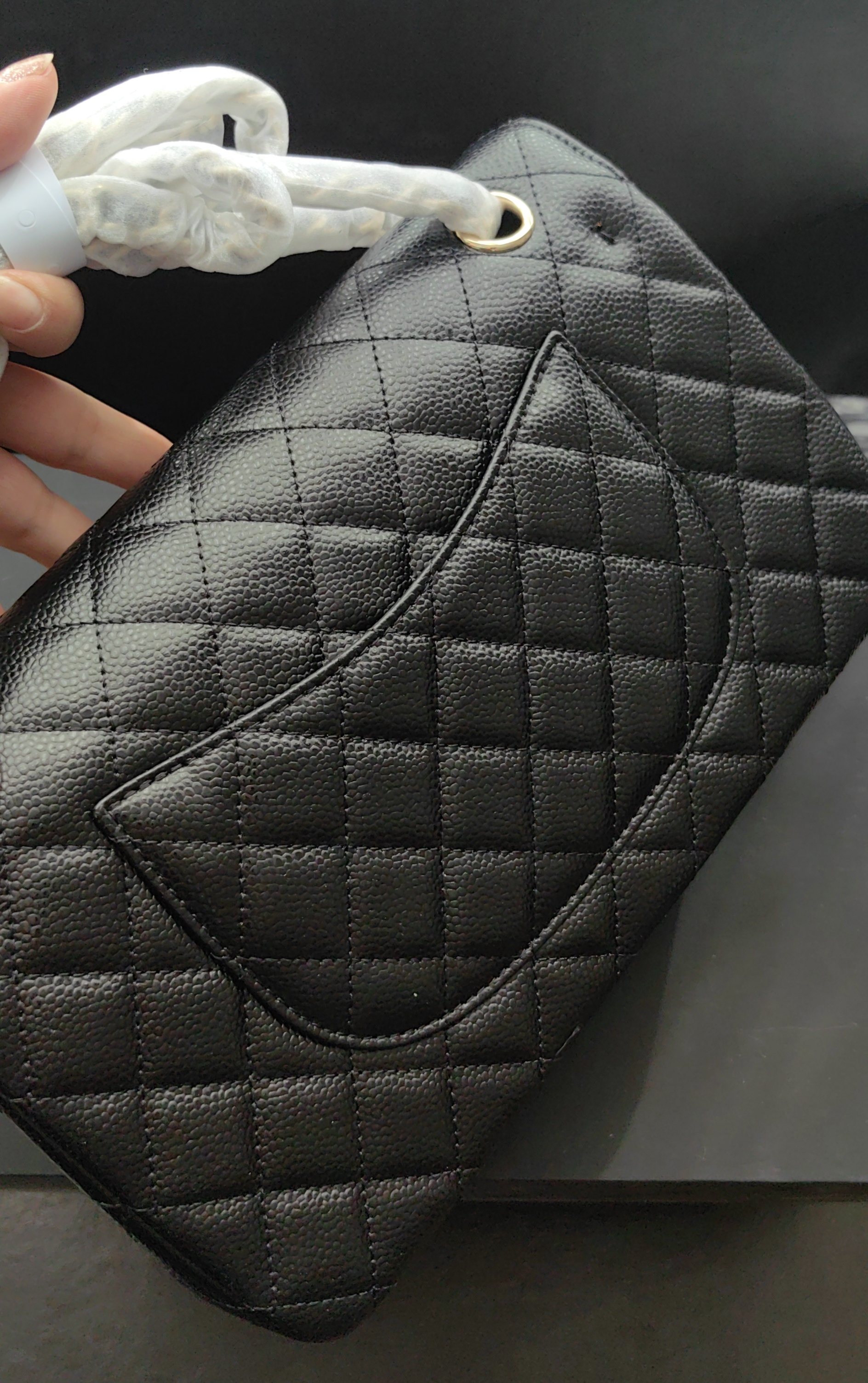 解救所有场合经典CF,进口鱼子酱皮,质感无敌好。高档包进出工作会议日常背毫无压力。长26cm,高16cm,底宽7cm