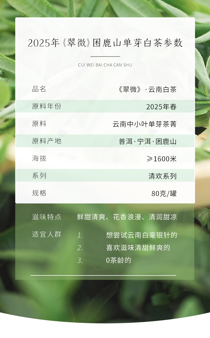 【买5送1】2025《翠微》困鹿山白毫银针 80克/罐 白茶