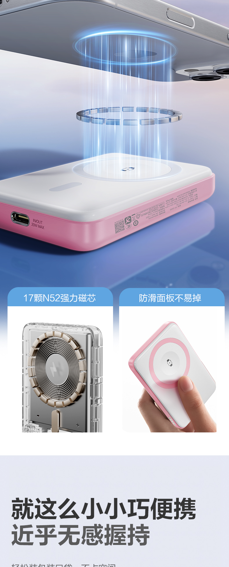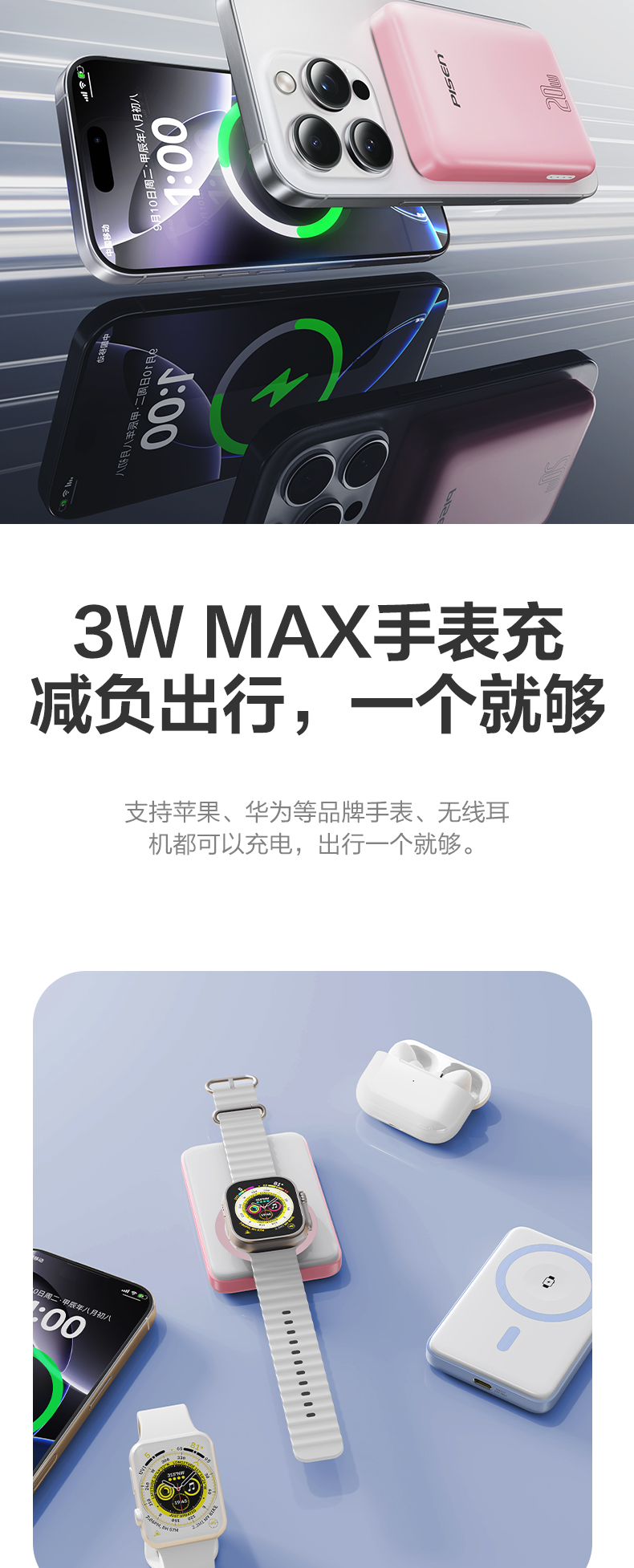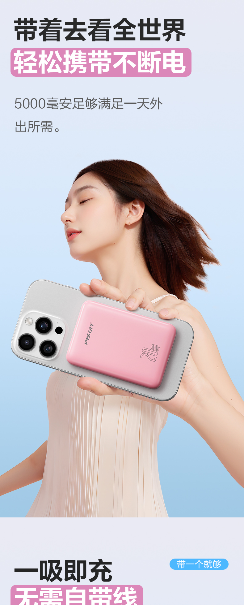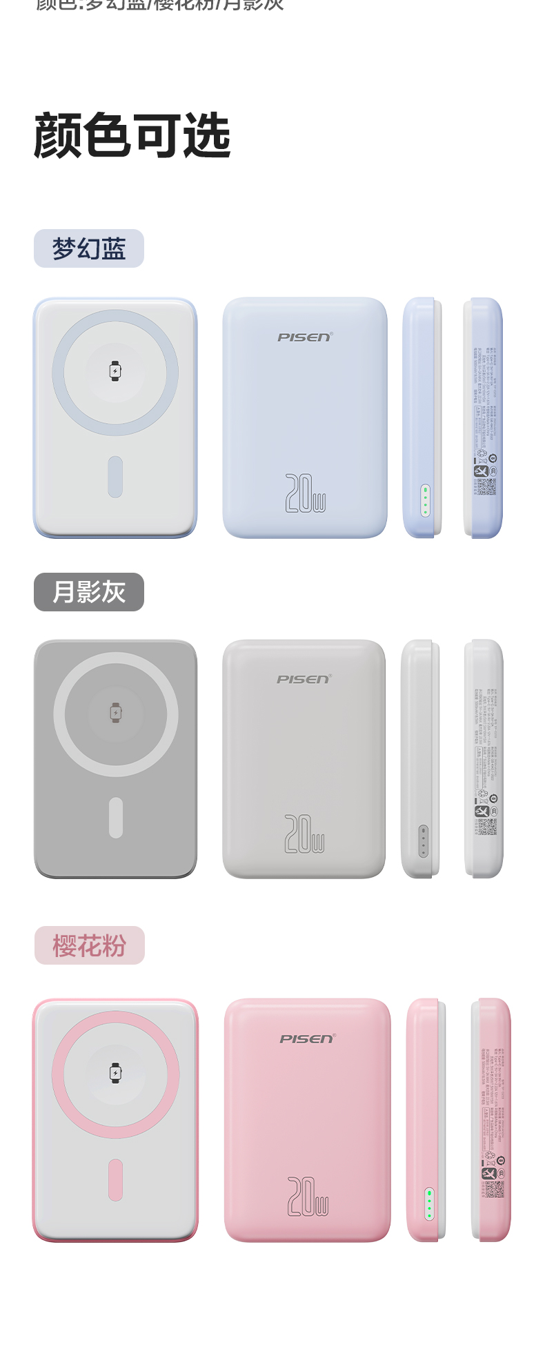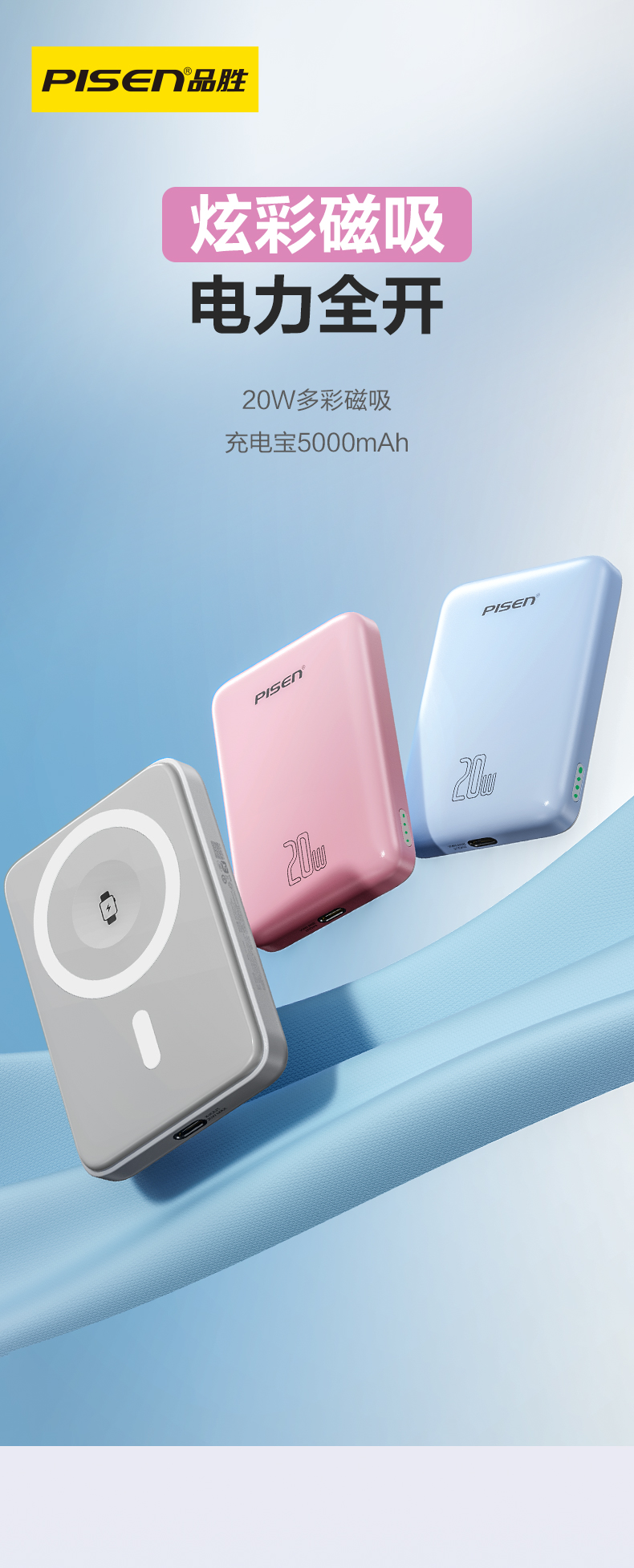 品胜 20W多彩磁吸充电宝5000毫安 支持手机手表耳机无线充移动电源iPhone Air华为小米设备