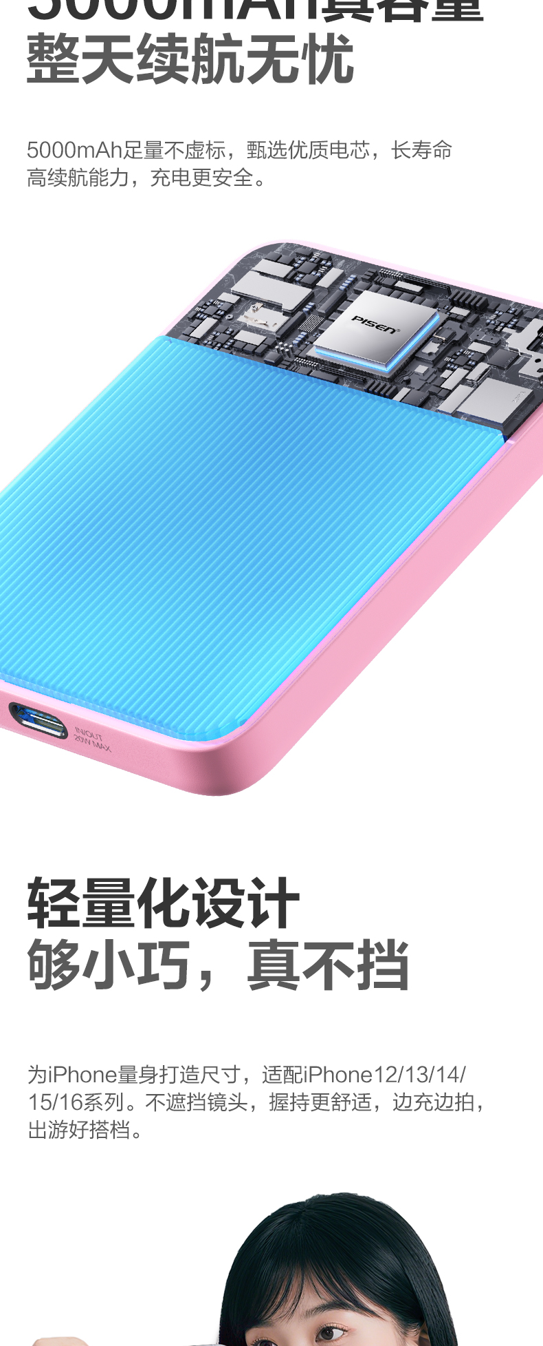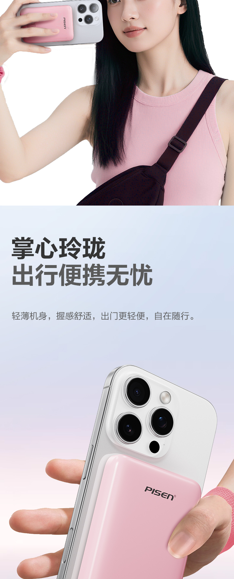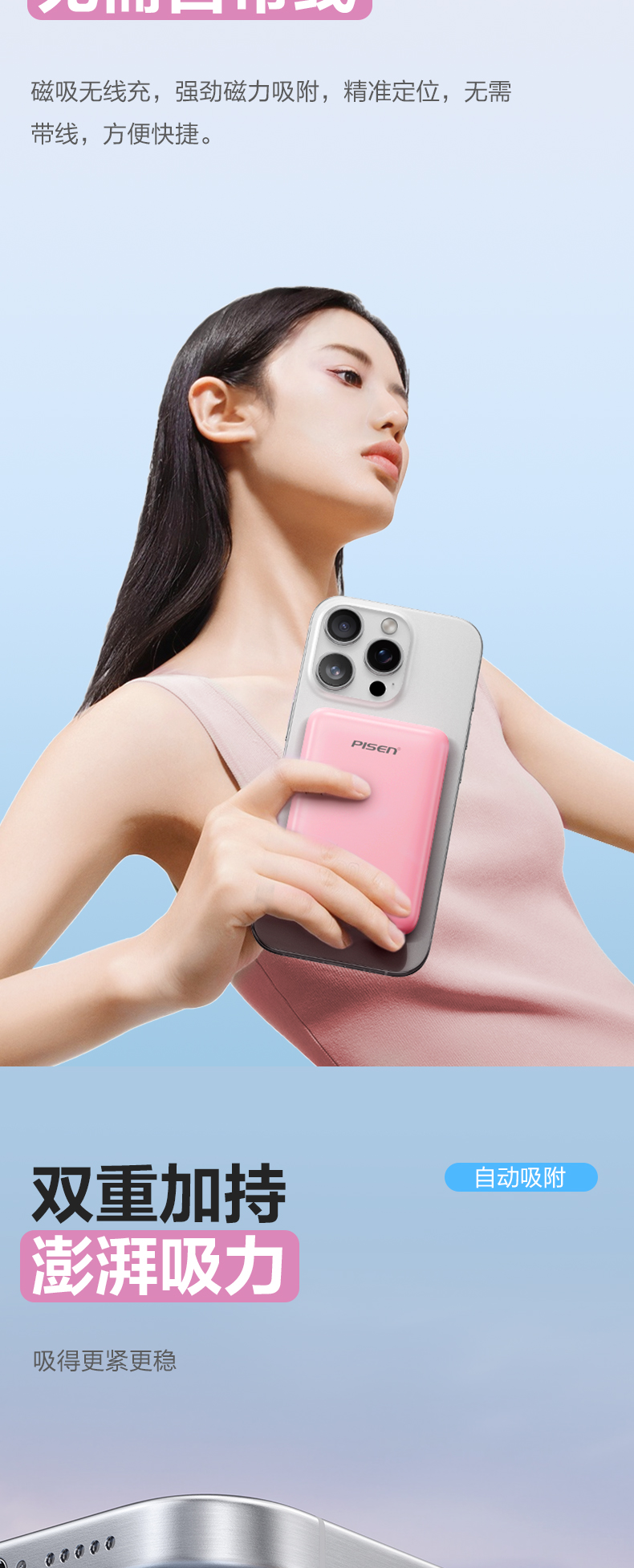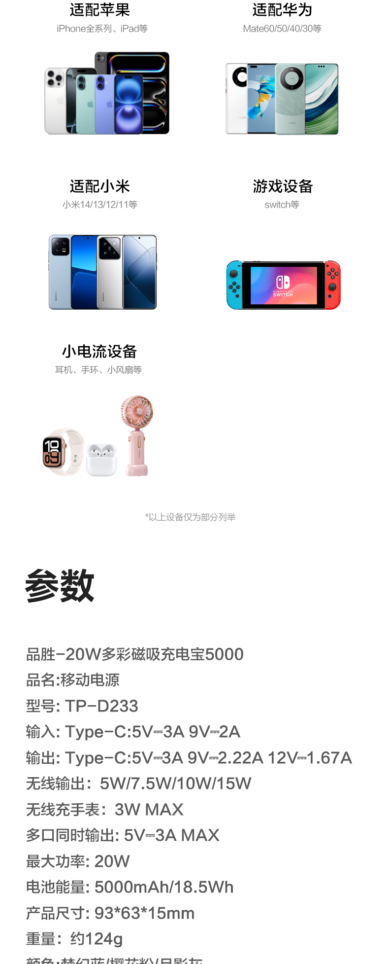 品胜 20W多彩磁吸充电宝5000毫安 支持手机手表耳机无线充移动电源iPhone Air华为小米设备