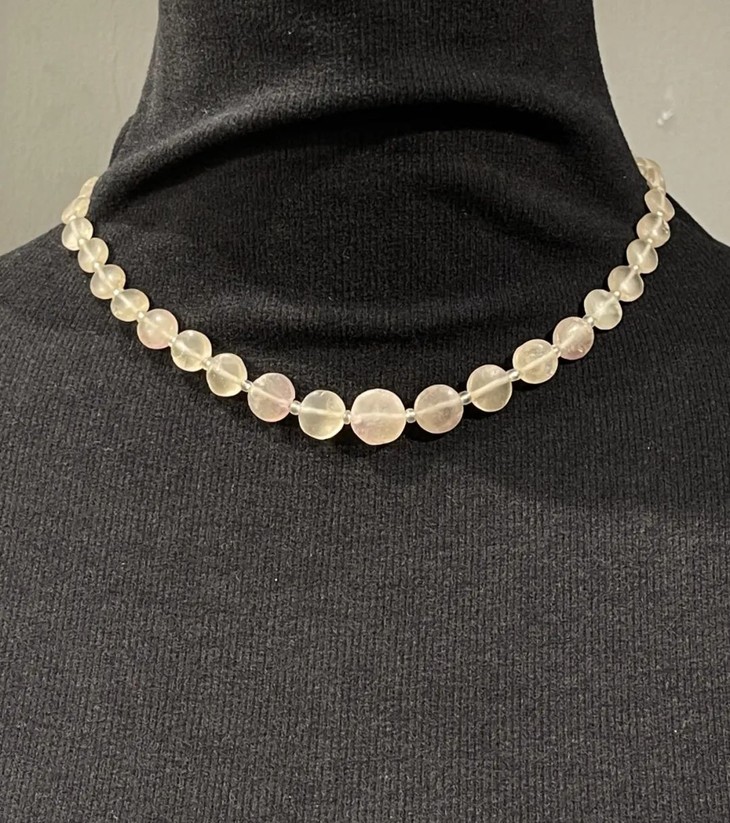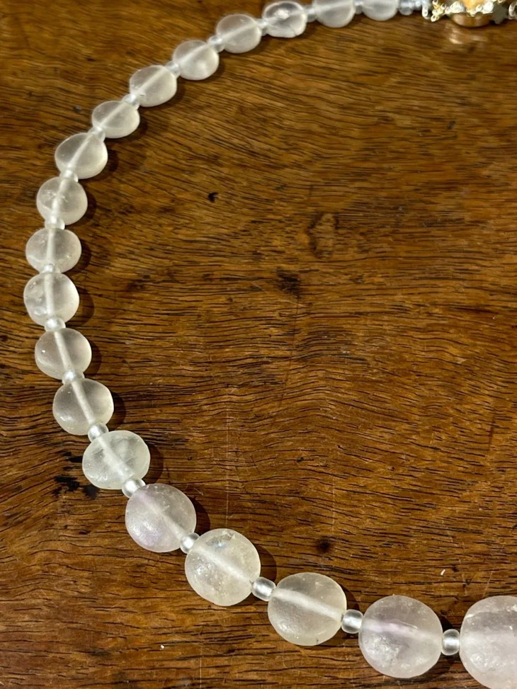 这是一组高古天然白水晶扁珠串成的塔式項链,尺寸中央大,左右向上漸小的老扁珠,搭配小米粒隔珠串成的淑女项链,造型独特的扁豆型老珠共30粒,透明无色白水晶质地晶莹剔透,表面风化腐蚀,老砣具钻孔痕迹明显, 包浆皮壳温润细腻,是中亚地区的高古老珠,整组尺寸搭配合宜成为塔式項链,入手即可佩戴,艳丽动人,与各式时尚服饰百搭。