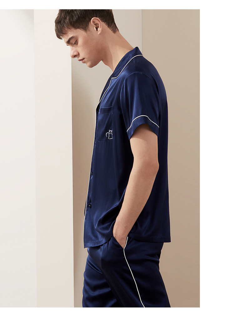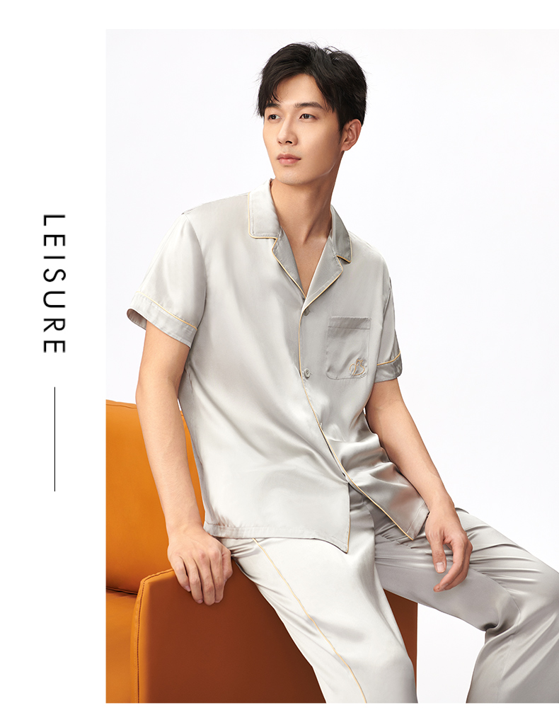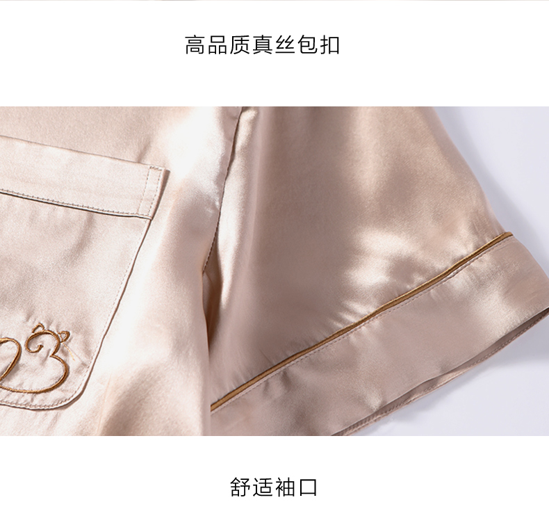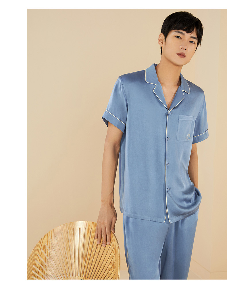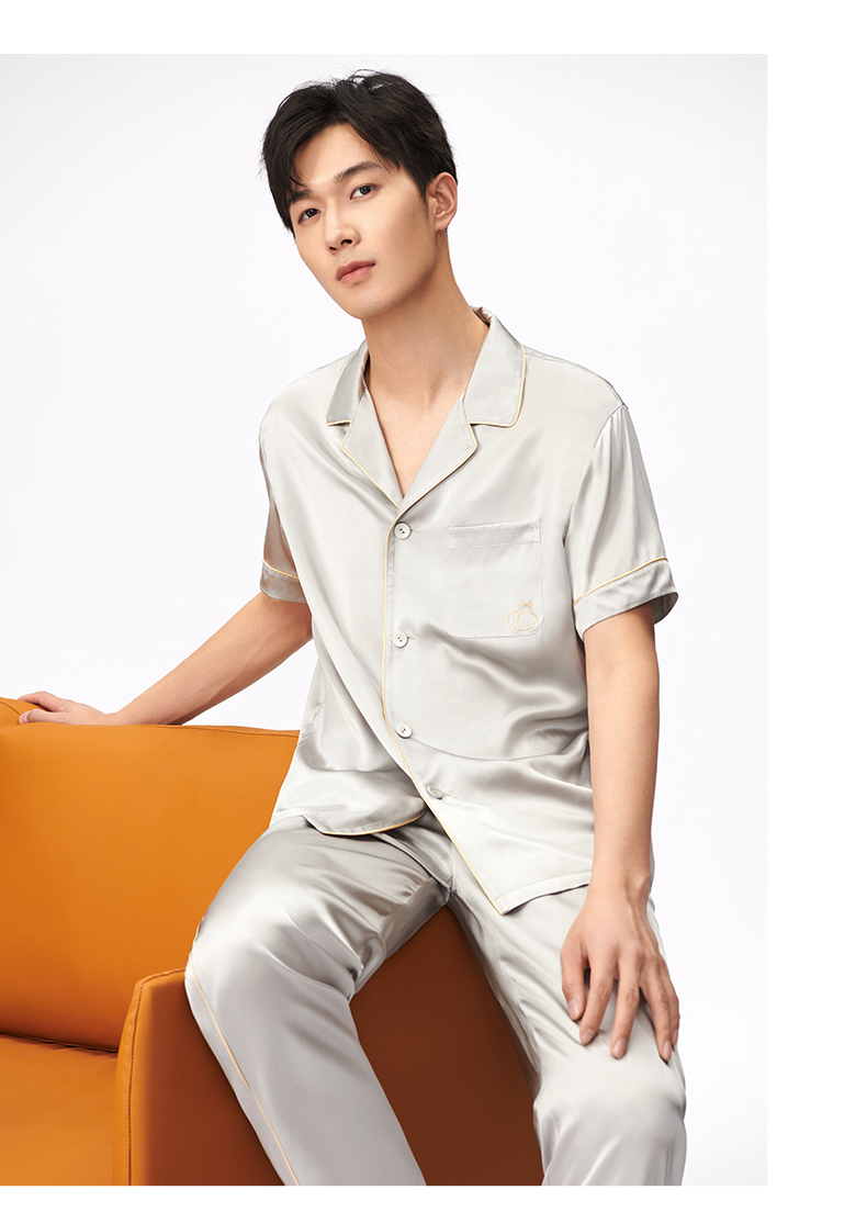 金三塔真丝睡衣男士短袖夏季100%桑蚕丝纯色绣花短袖衣裤套家居服 YSMAB401(限价款)