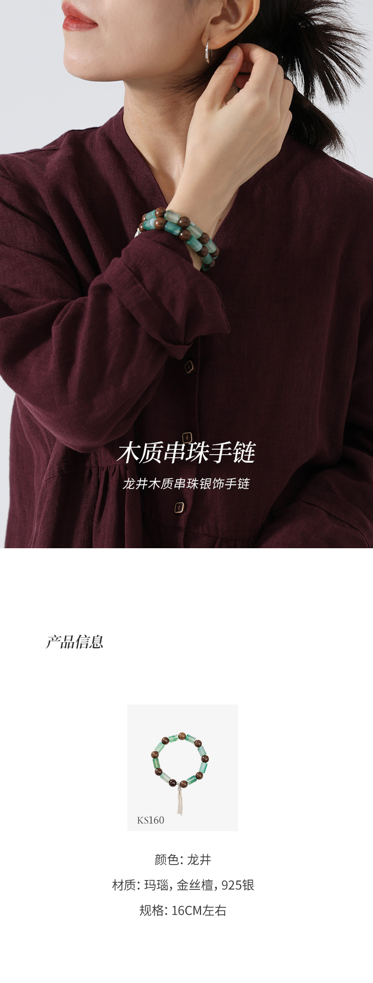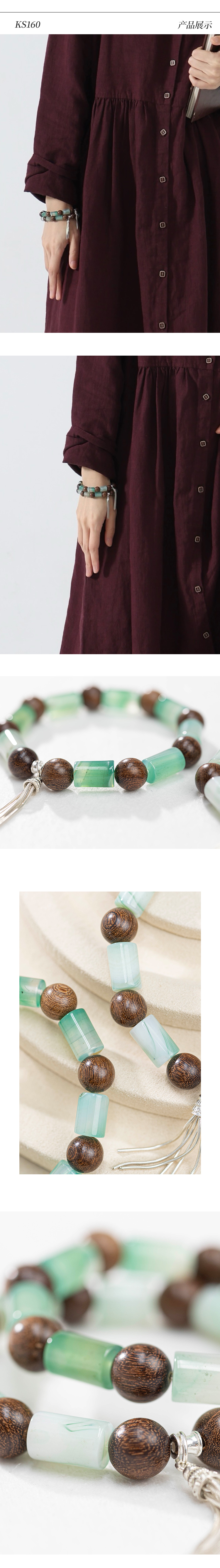 绽放/KS160朵龙井金檀木玛瑙串珠手链流苏配饰925银