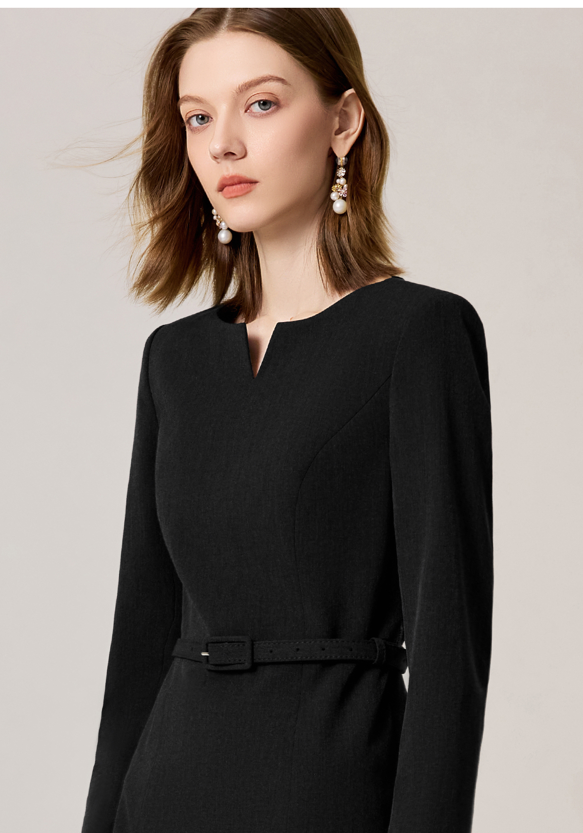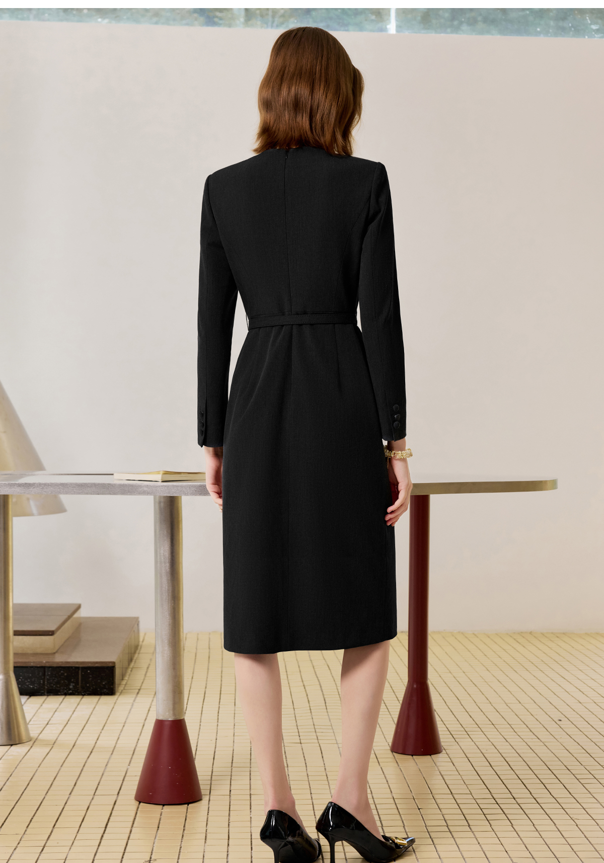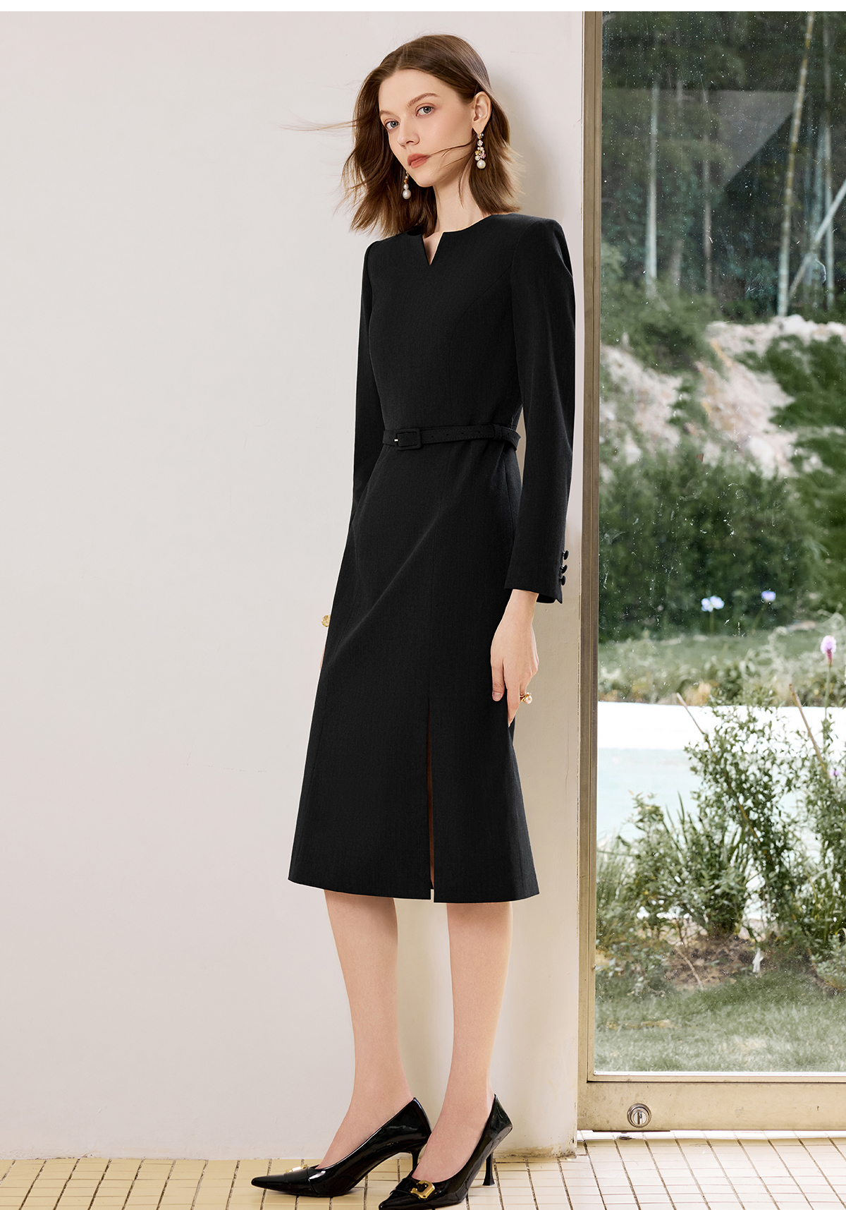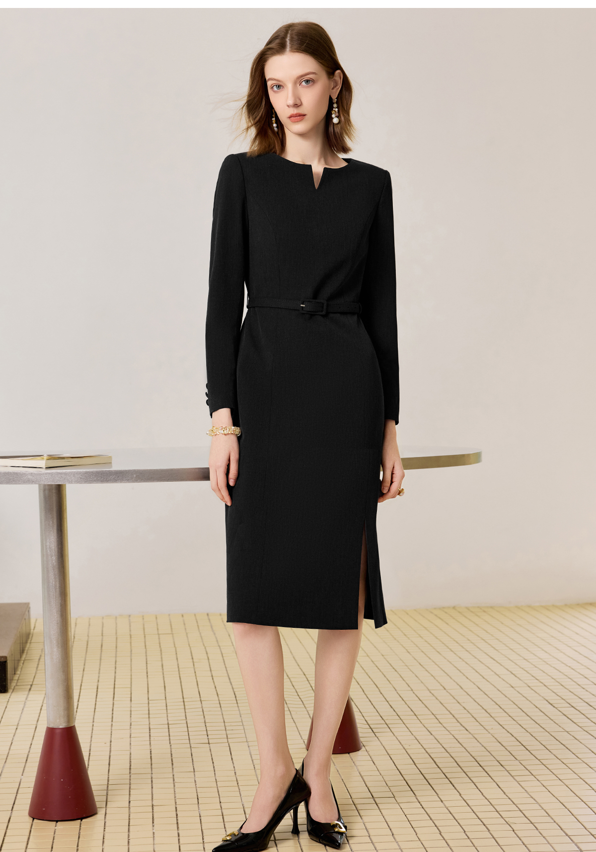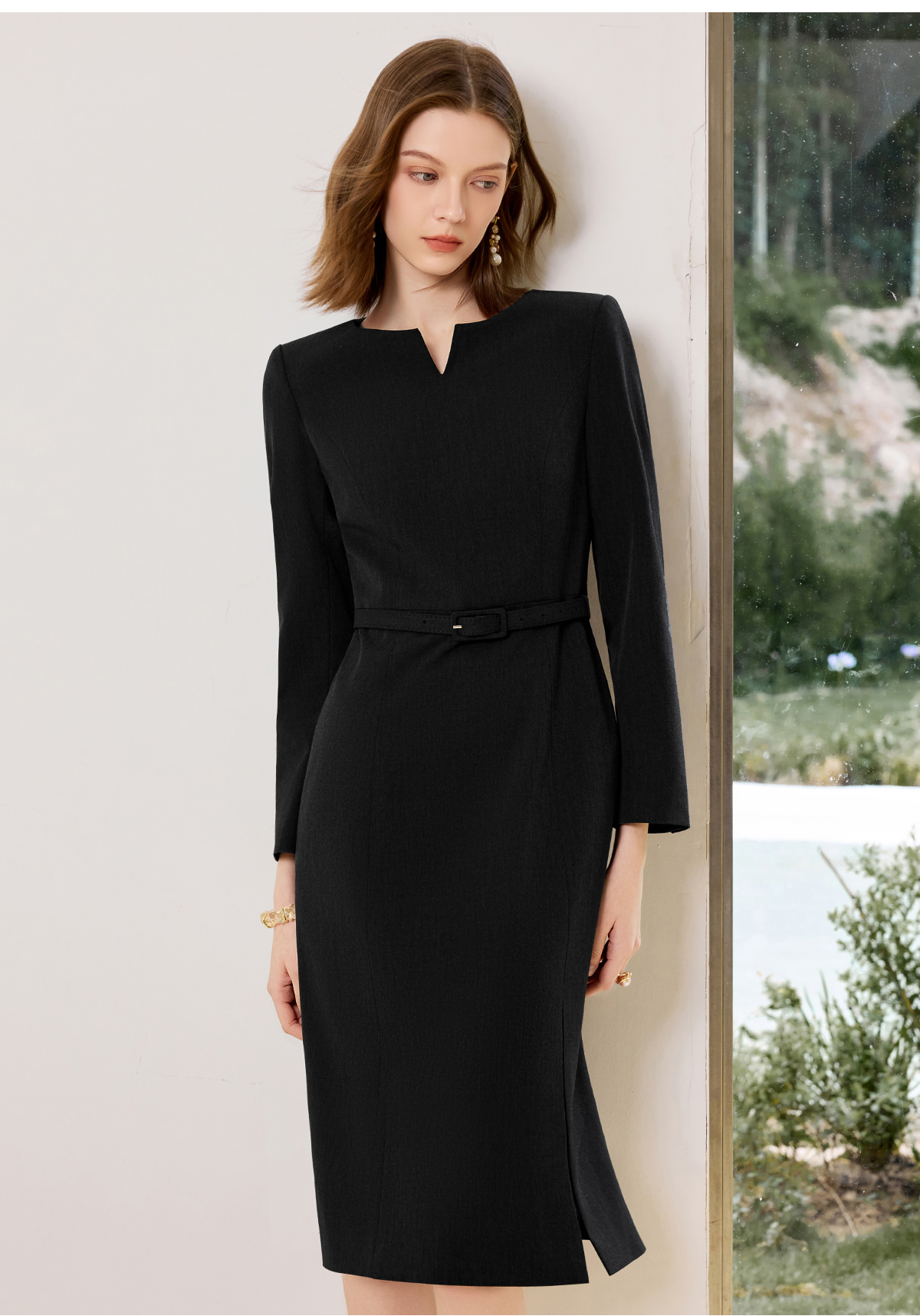 AD黑色气质连衣裙女2025新款秋冬中长款职业工作服开叉西装裙中长