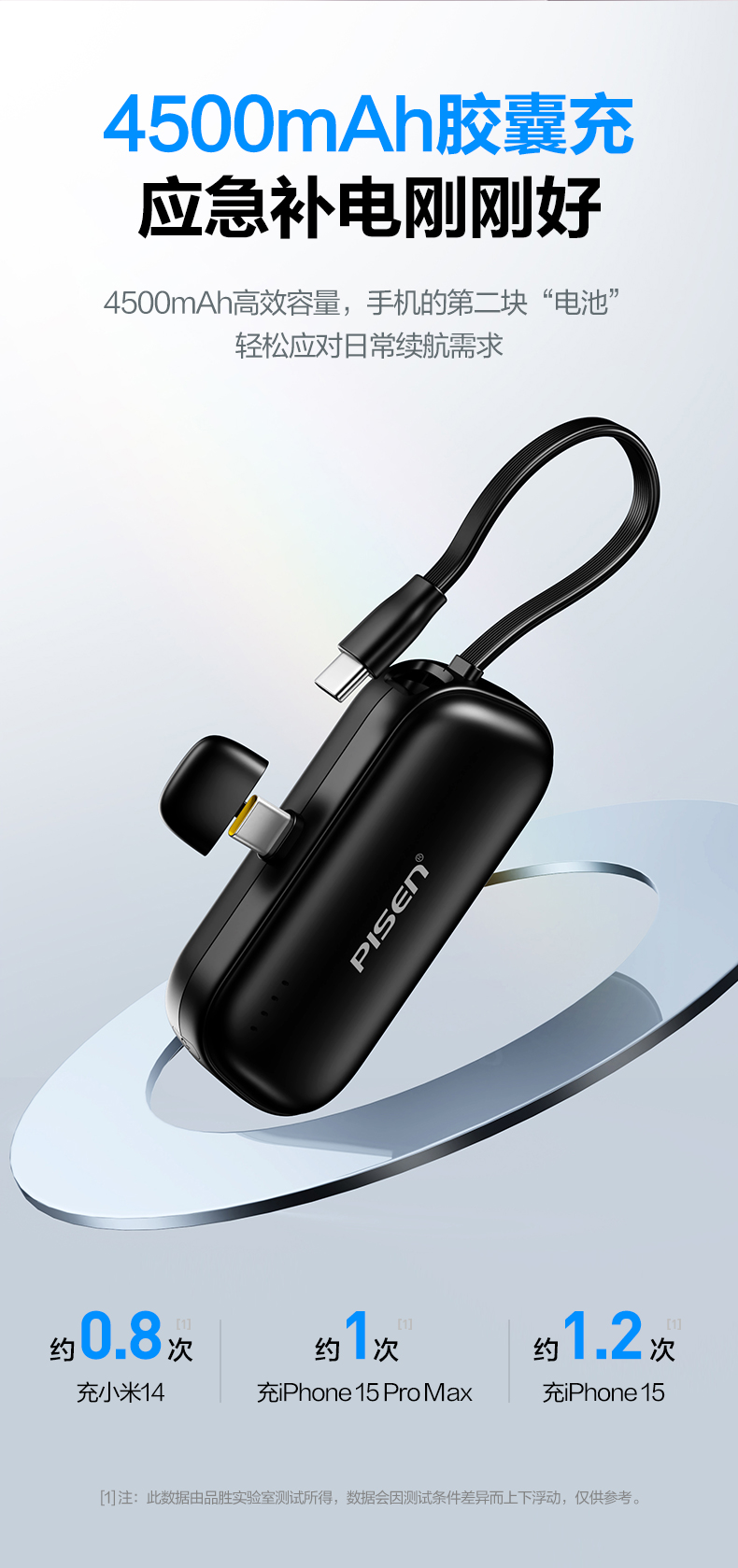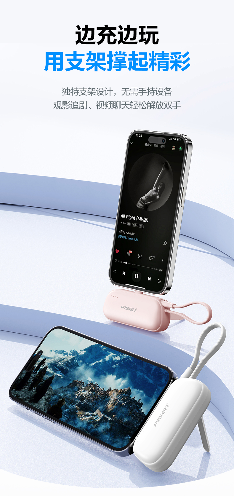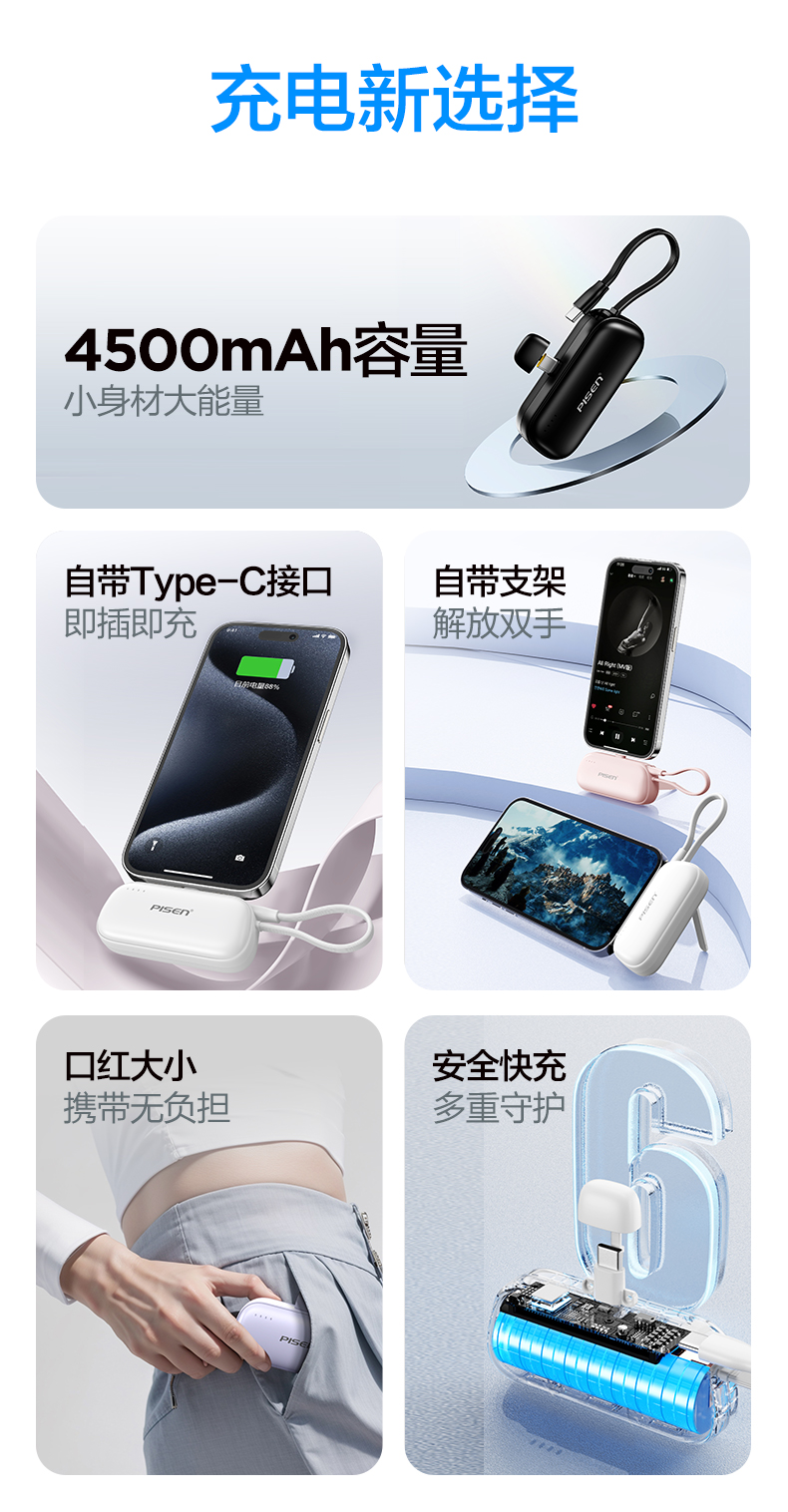 品胜 15W迷你尾插充电宝4500m(Type-C版)Ah移动电源 自带支架 支持华为/小米/荣耀等设备