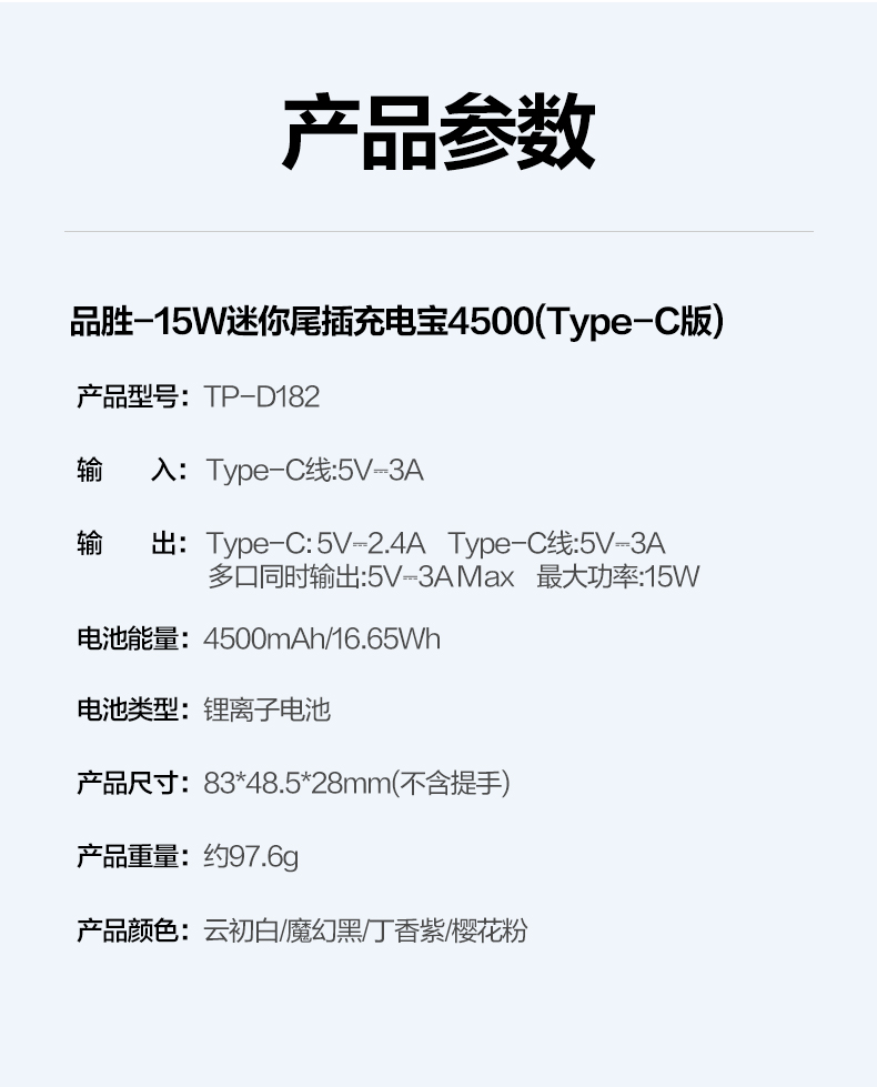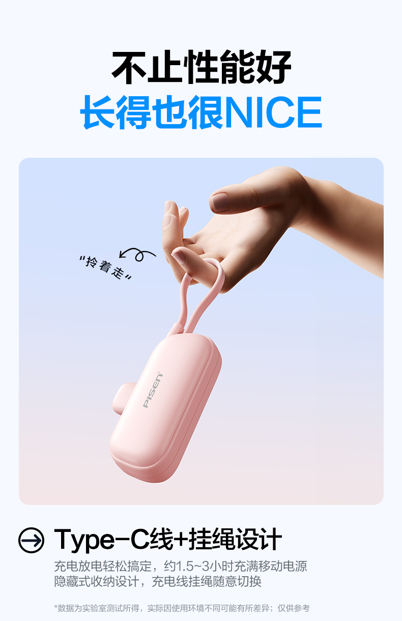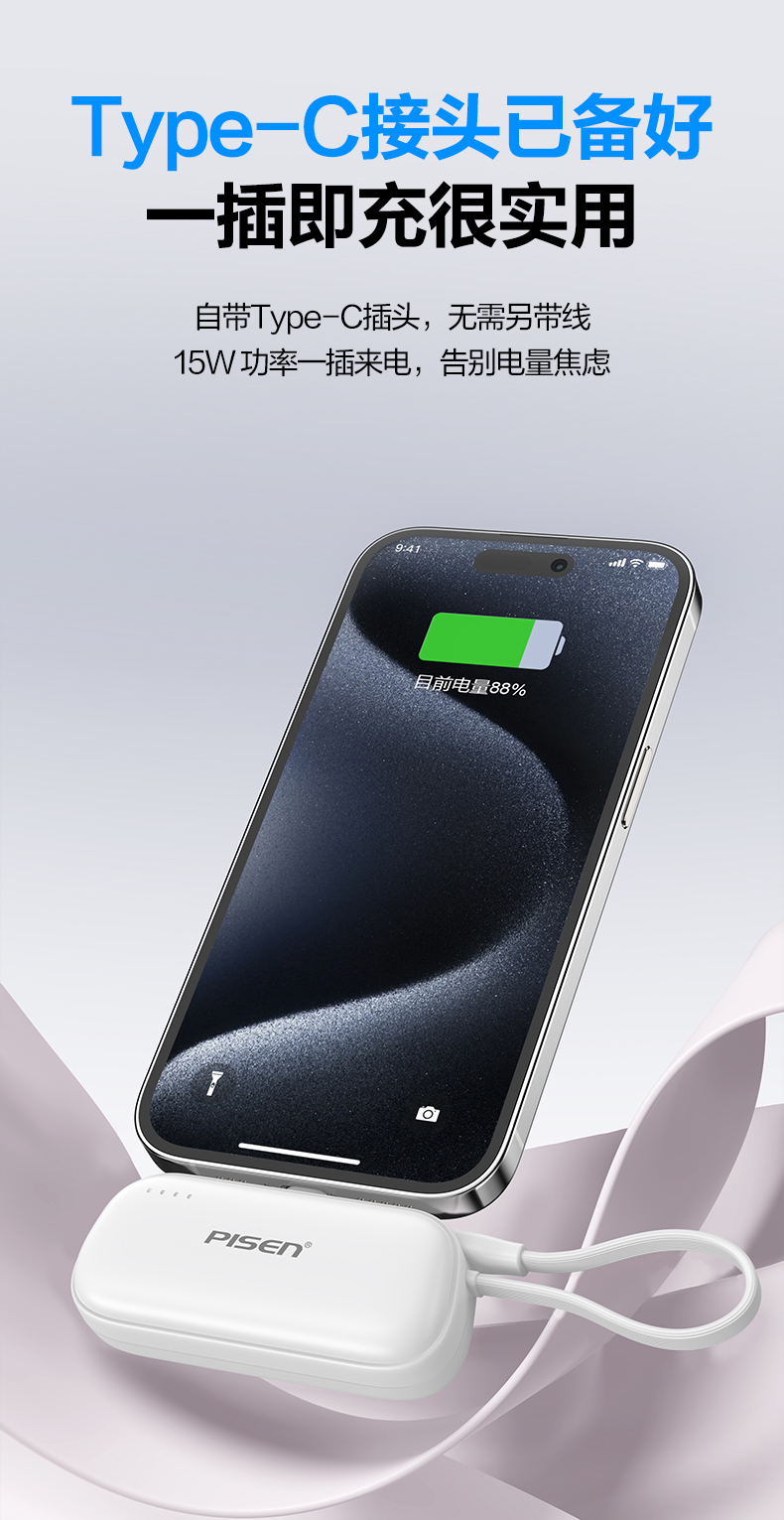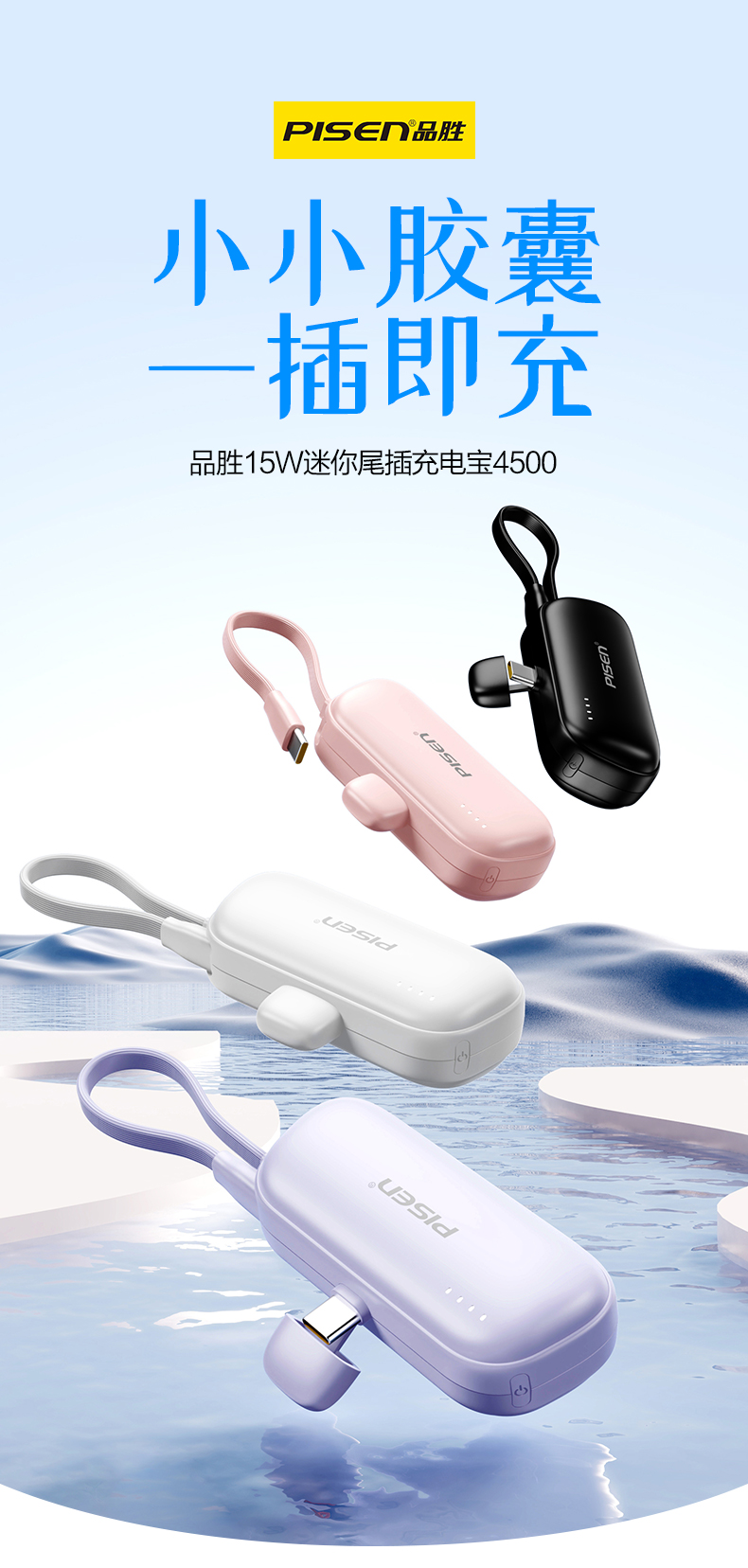品胜 15W迷你尾插充电宝4500m(Type-C版)Ah移动电源 自带支架 支持华为/小米/荣耀等设备