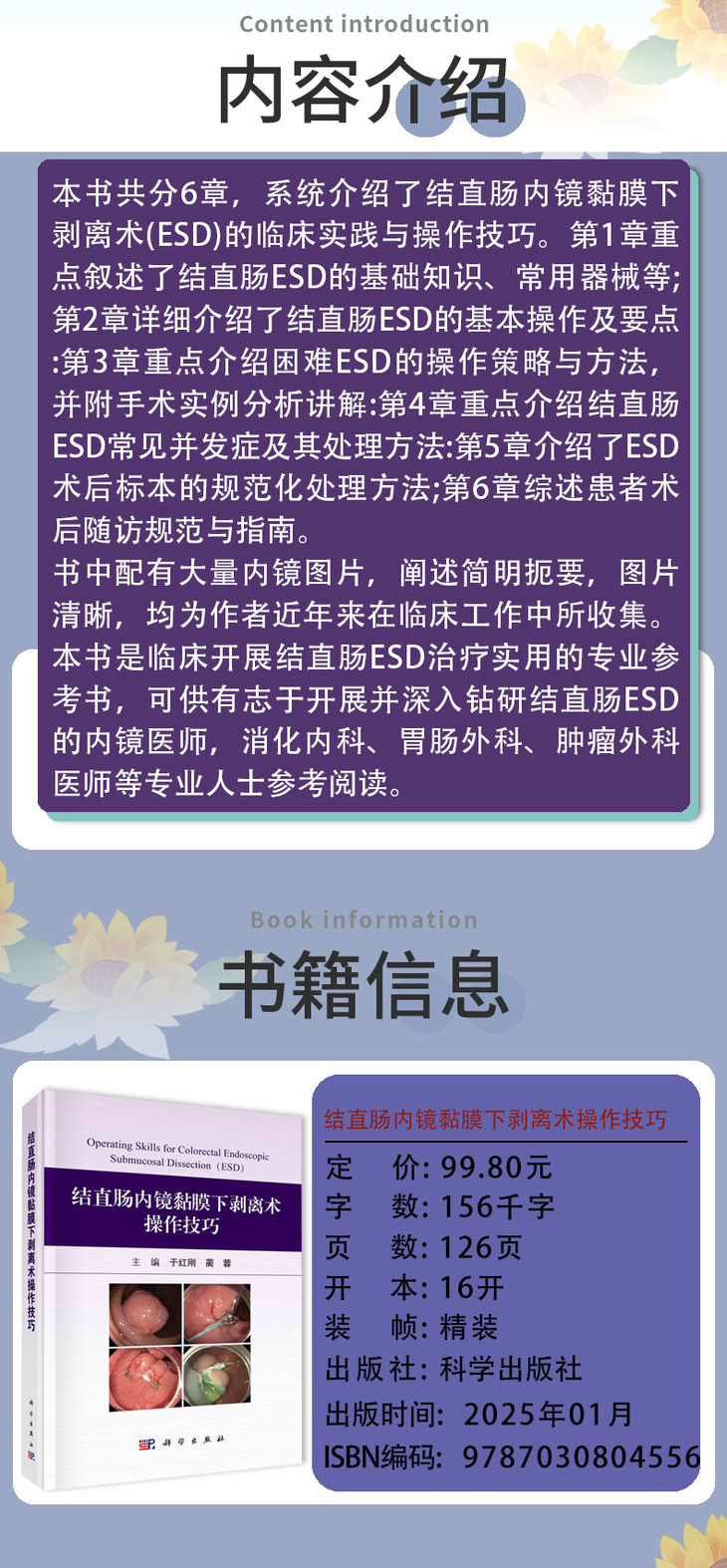 本书共分6章,系统介绍了结直肠内镜黏膜下剥离术(ESD)的临床实践与操作技巧。第1章重点叙述了结直肠ESD的基础知识、常用器械等;第2章详细介绍了结直肠ESD的基本操作及要点;第3章重点介绍困难ESD的操作策略与方法,并附手术实例分析讲解;第4章重点介绍结直肠ESD常见并发症及其处理方法;第5章介绍了ESD术后标本的规范化处理方法;第6章综述患者术后随访规范与指南。