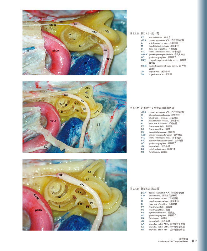 书共分10章,总计1389张高清解剖图片,13cm×8cm巨幅排版,分别从颞骨和侧颅底的解剖和手术径路两个角度去加以描述,从概述颞骨解剖实验室和常用设备器械开始,依次描述颞骨内中耳、内耳、神经、血管解剖、耳后径路常用手术径路解剖、耳内镜下经耳道解剖以及与常见侧颅底手术相关的颅中窝径路、经迷路径路、经耳囊径路、乙状窦后径路和颞下窝径路的解剖。近年来耳内镜技术的兴起使得内镜下中耳解剖变得更为重要,因此在术中特意增加了耳内镜下经耳道径路的章节,方便读者更全面的理解耳内镜下中耳解剖,并对与显微镜下解剖的差别。