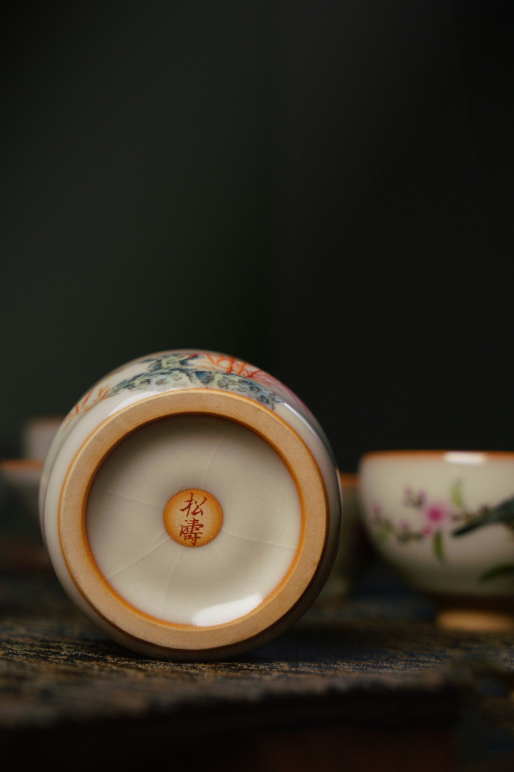 问鼎松涛彩绘哥窑步虚杯(红竹萧萧)持照杯(佛手)斗笠杯(花卉博古)斗笠杯(蝶舞翩翩)抚思杯(蝴蝶翩翩)盖置(青绿山水)(缺货)