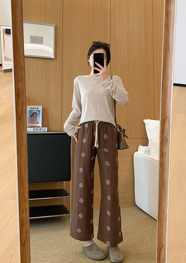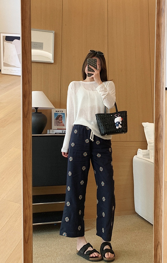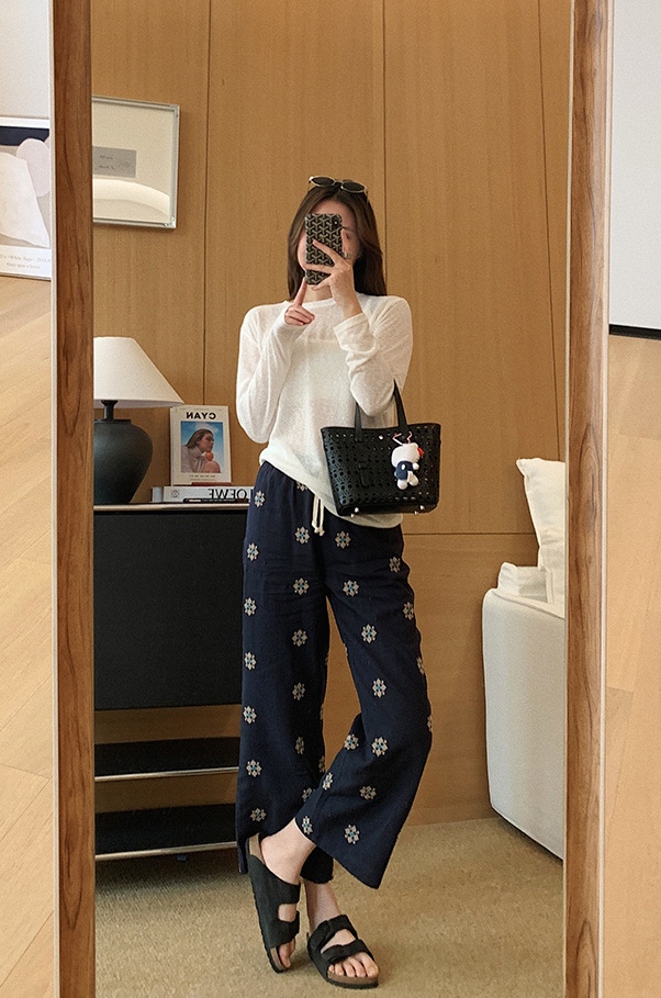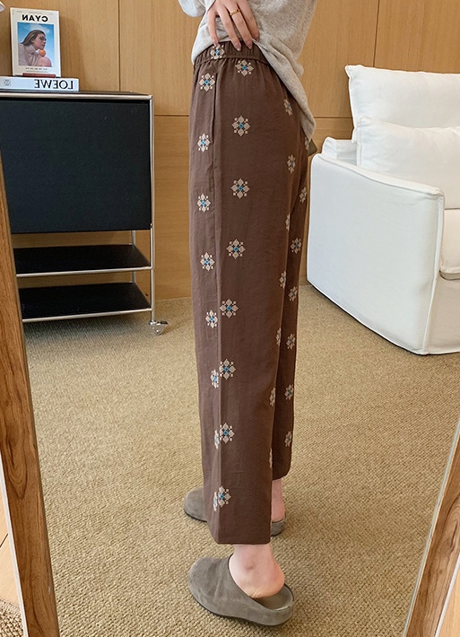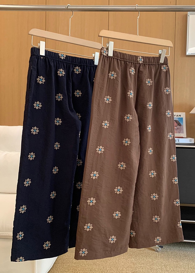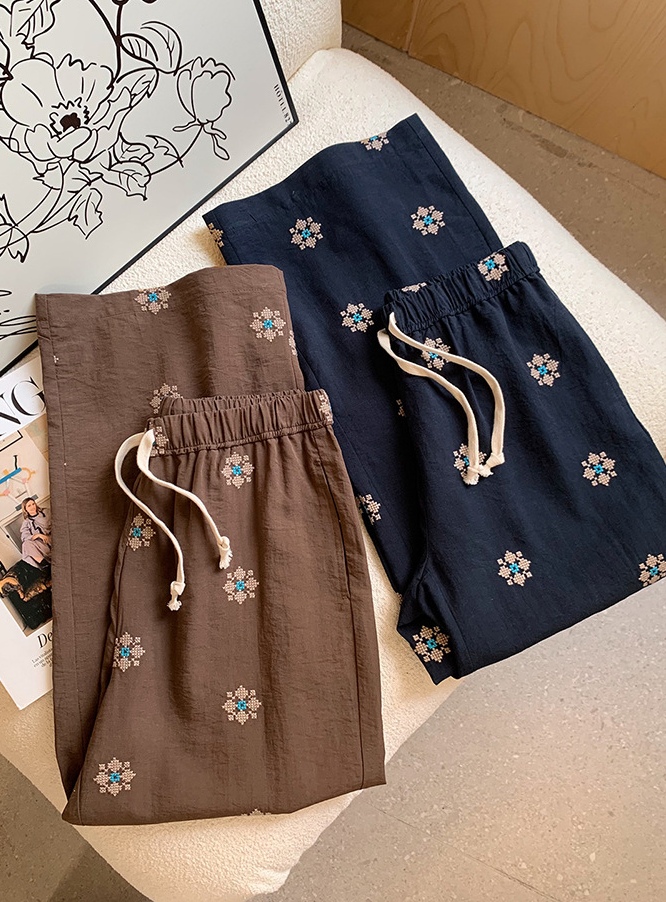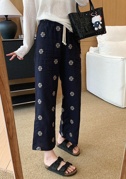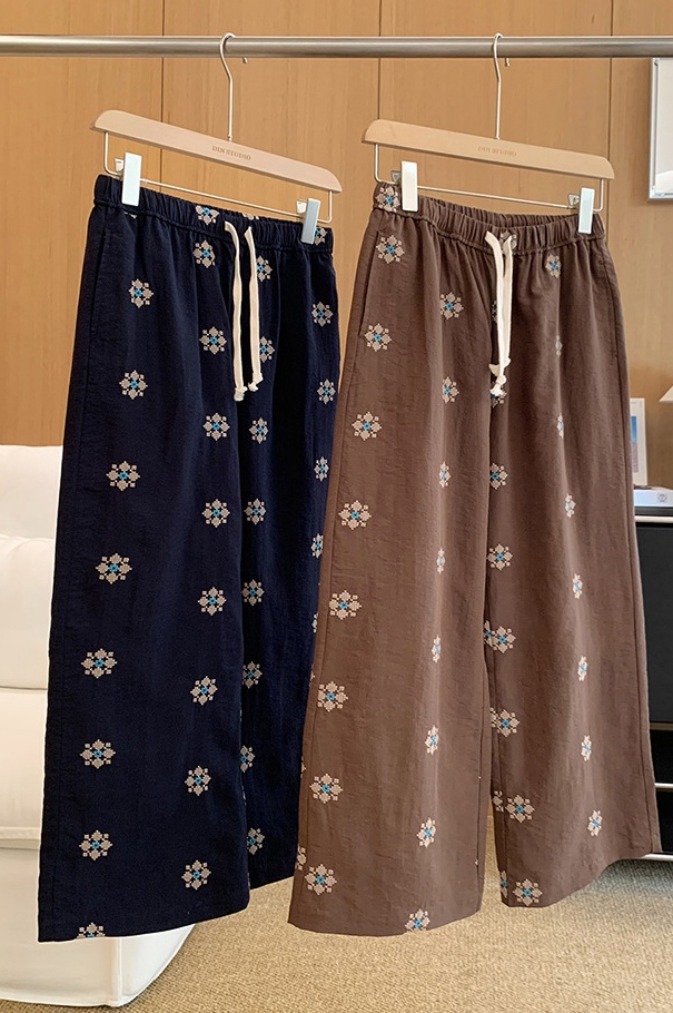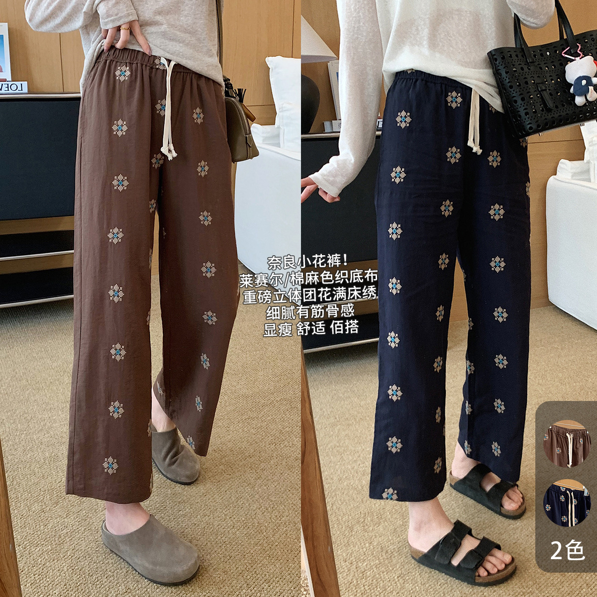 衣橱里独特的慵懒麻裤,选用了莱赛尔和天然麻的混纺色织底布,加上立体团花的满床绣,色彩饱满鲜艳,