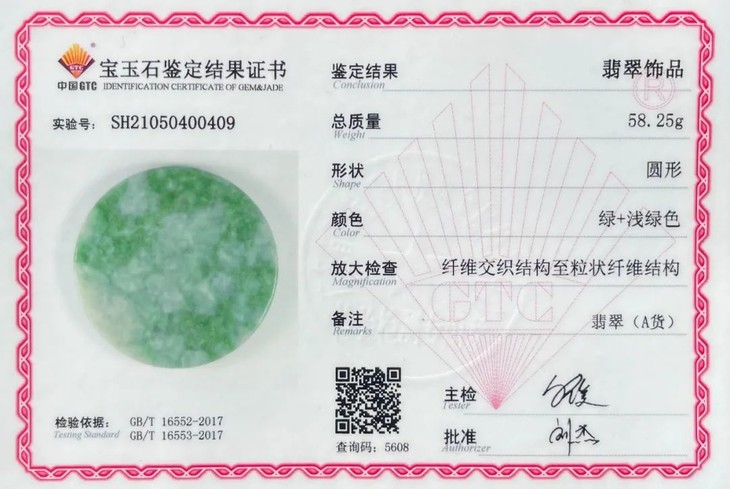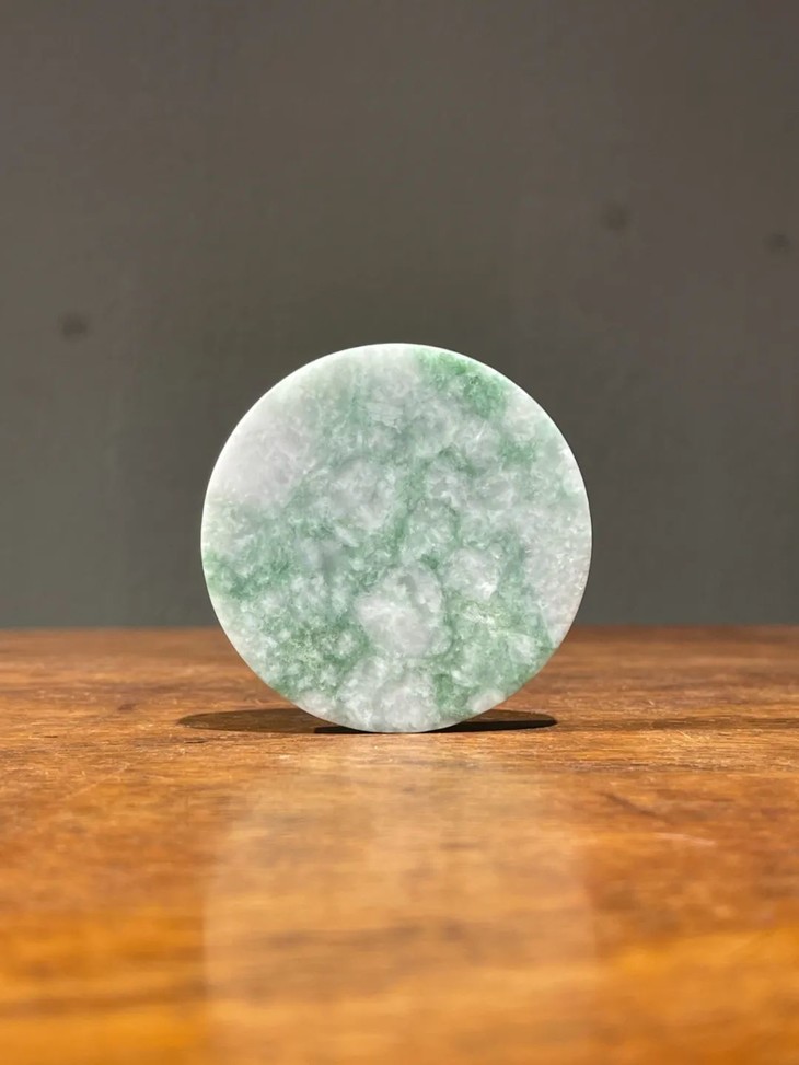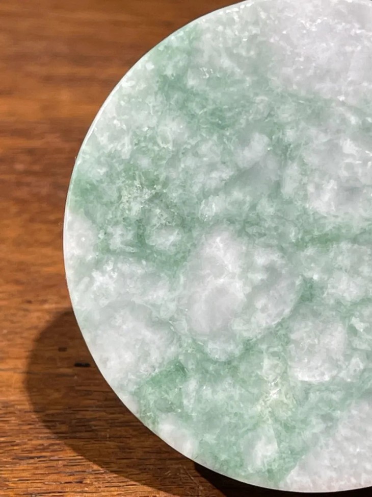 此天然翡翠圆饼型吊坠,白底翡翠玉质地精良,翠绿斑点自然,光素无纹琢磨细腻精致,整体保存完好,无任何损伤。无钻孔,入手可镶贵金属扣环成为項链吊坠,融入当代首饰设计。附专业机构鉴定书,是无人工做色的A货天然翡翠。