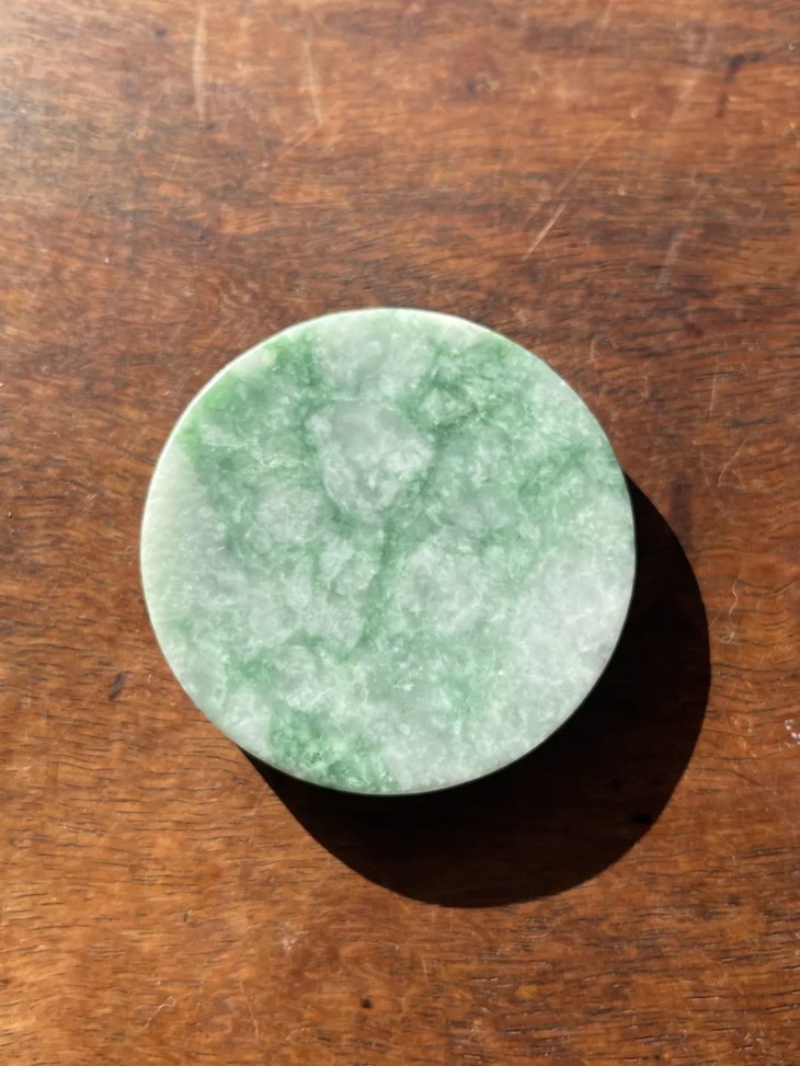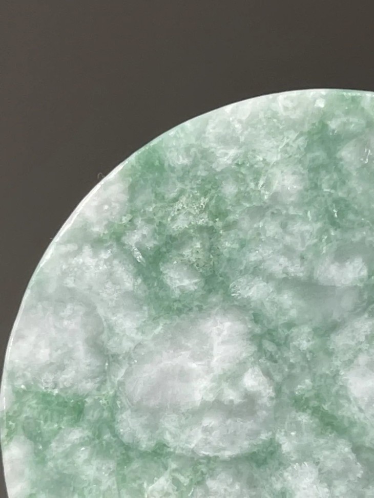 这是一件天然圆饼型吊坠,是切割翡翠手镯时的圆芯饼型块,光素无纹的白底青天然翡翠圆饼块,吊坠,尺寸不小的圆形天然翡翠玉石,可镶贵金属扣环成为贵气简约的項链吊坠。