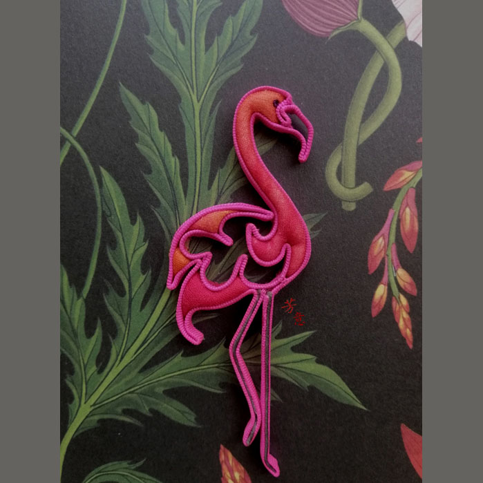 工艺:传统技艺,手工制作。历经近十道工序:真丝预缩熨烫,真丝刮浆,柔软真丝,裁条,折烫,嵌铜丝,塑形固定,嵌芯,固定底托。