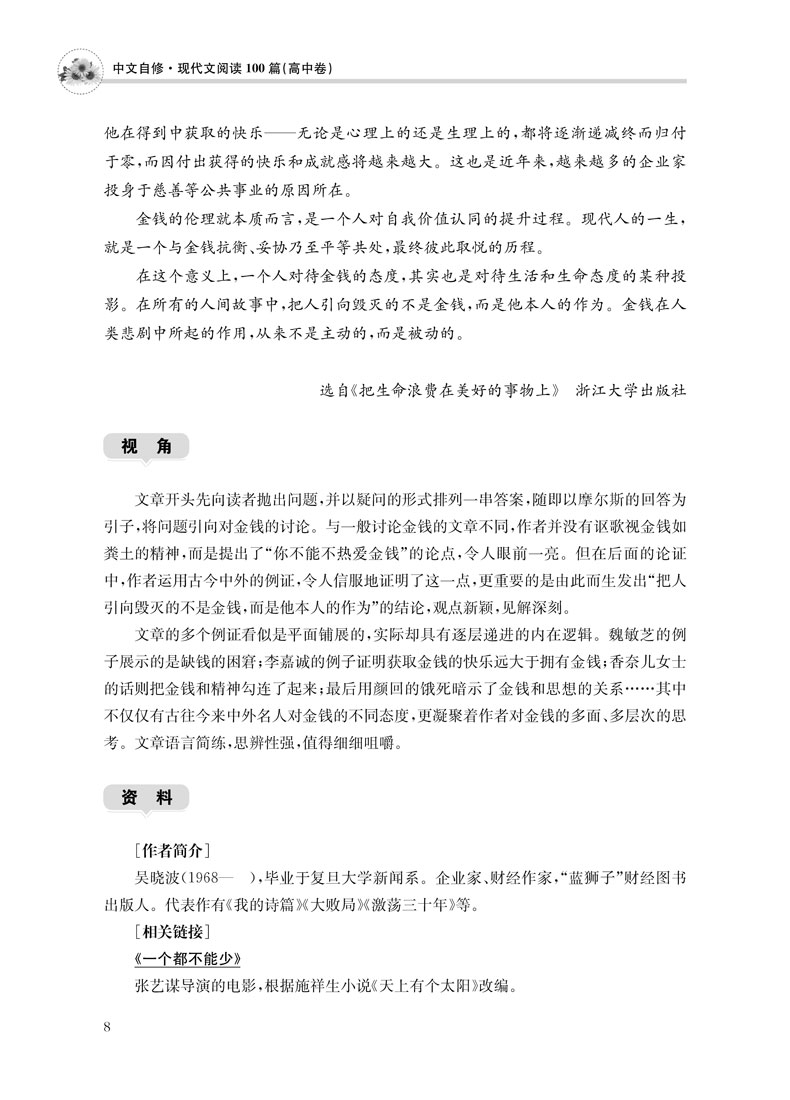 全书根据文章的题材内容,分为《政治与经济》《社会与人生》《历史与现实》《环境与自然》《修身与求索》《科学与技术》《艺术与审美》《文化与创新》八个栏目,主题集中,覆盖面广。主题集中方便对同类作品进行比较阅读,这也是近年来教学和评价的一个新趋势,覆盖面广有利拓宽阅读视野,为写作积累丰富的素材。所选作品均参照中高考现代文阅读的主题内容、语言风格和篇幅容量,涵盖了记叙文、议论文、说明文和散文等各种文体,让读者既能在阅读中享受文学熏陶,得到知识扩容,提高阅读水平,也能为自己的写作资料库备下充足的;弹药。