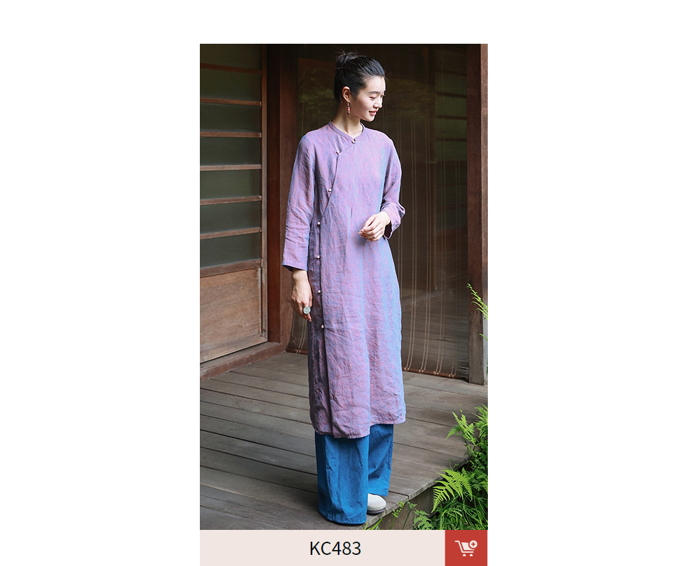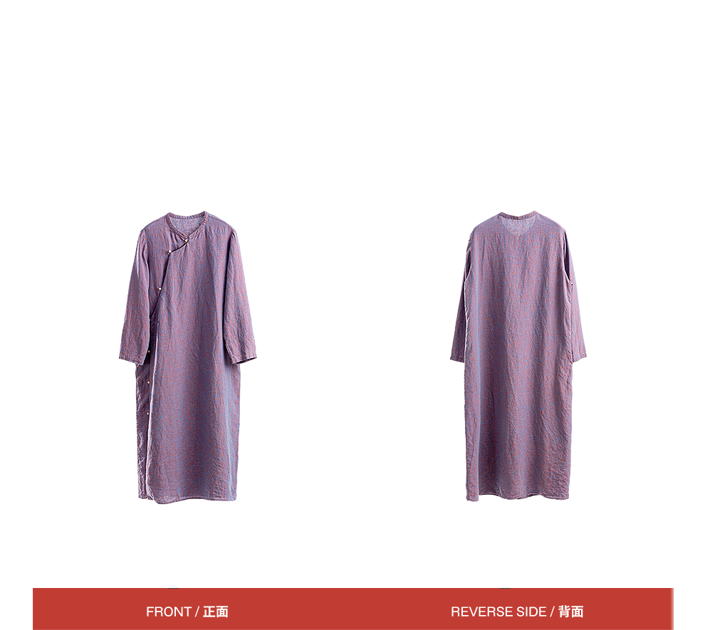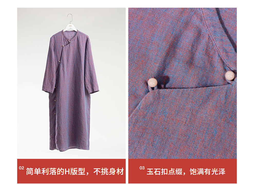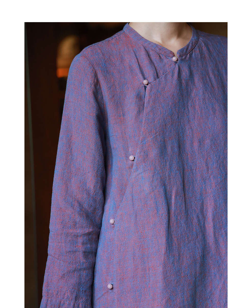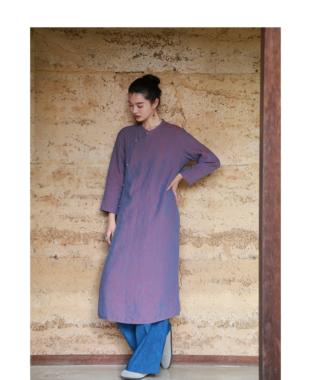 绽放516朵/色织亚麻立领斜襟盘扣正常肩七分袖新中式女连衣裙秋季