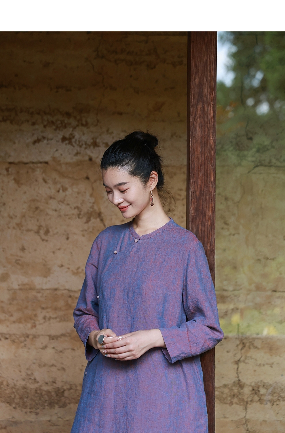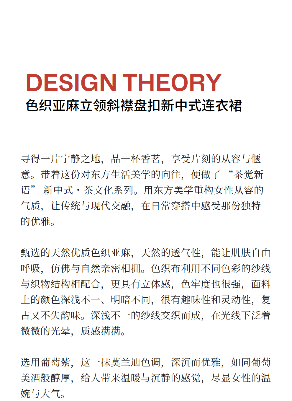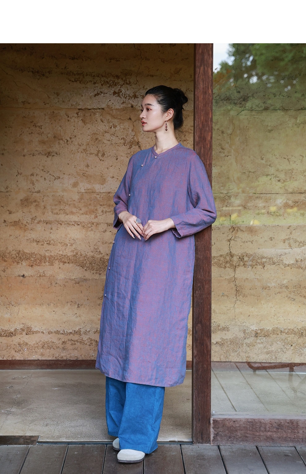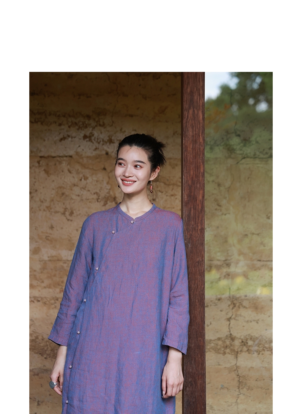 绽放516朵/色织亚麻立领斜襟盘扣正常肩七分袖新中式女连衣裙秋季