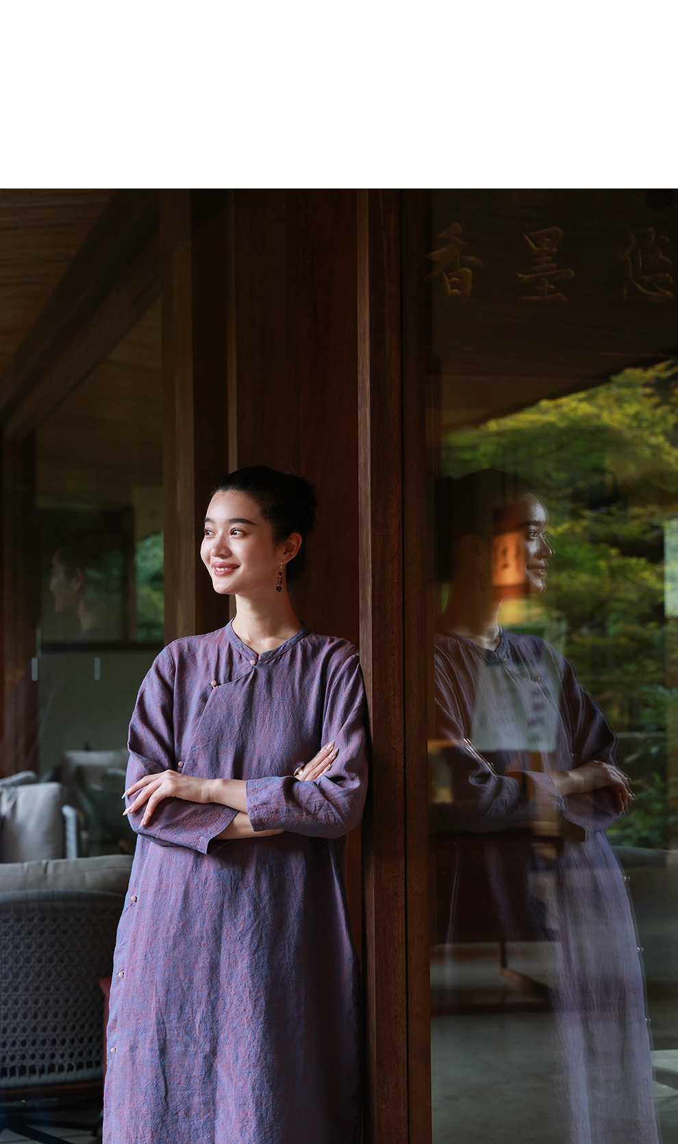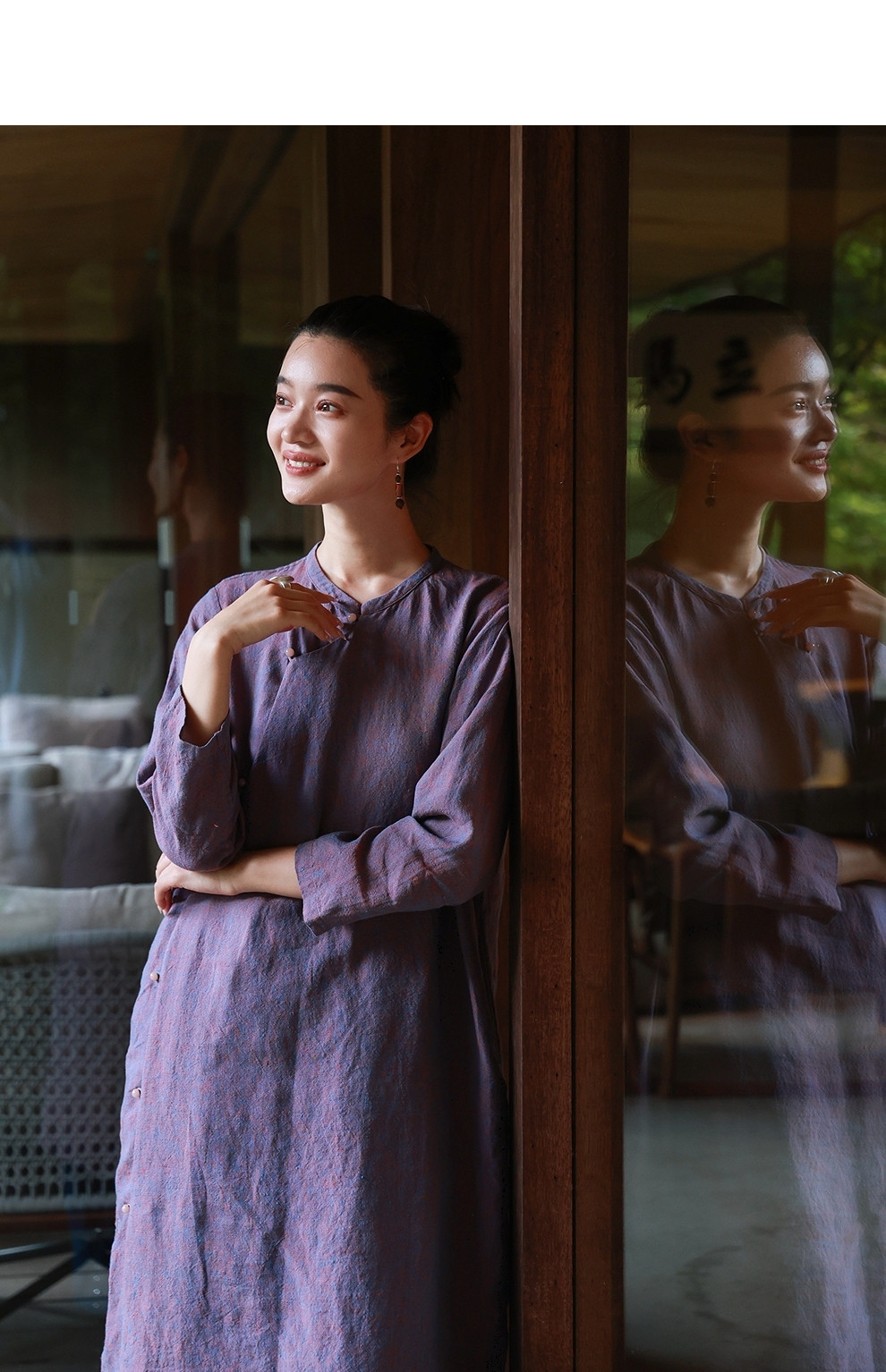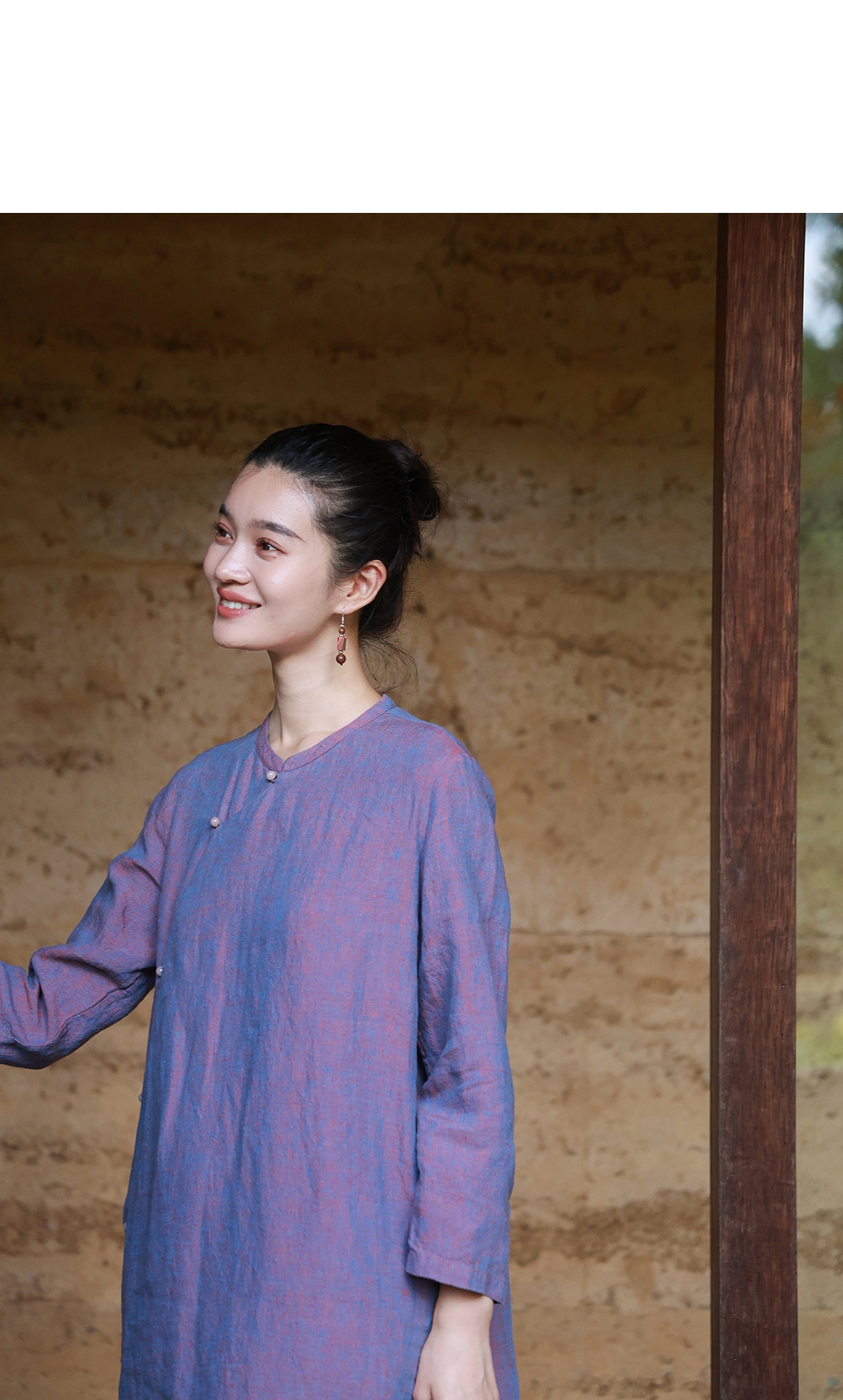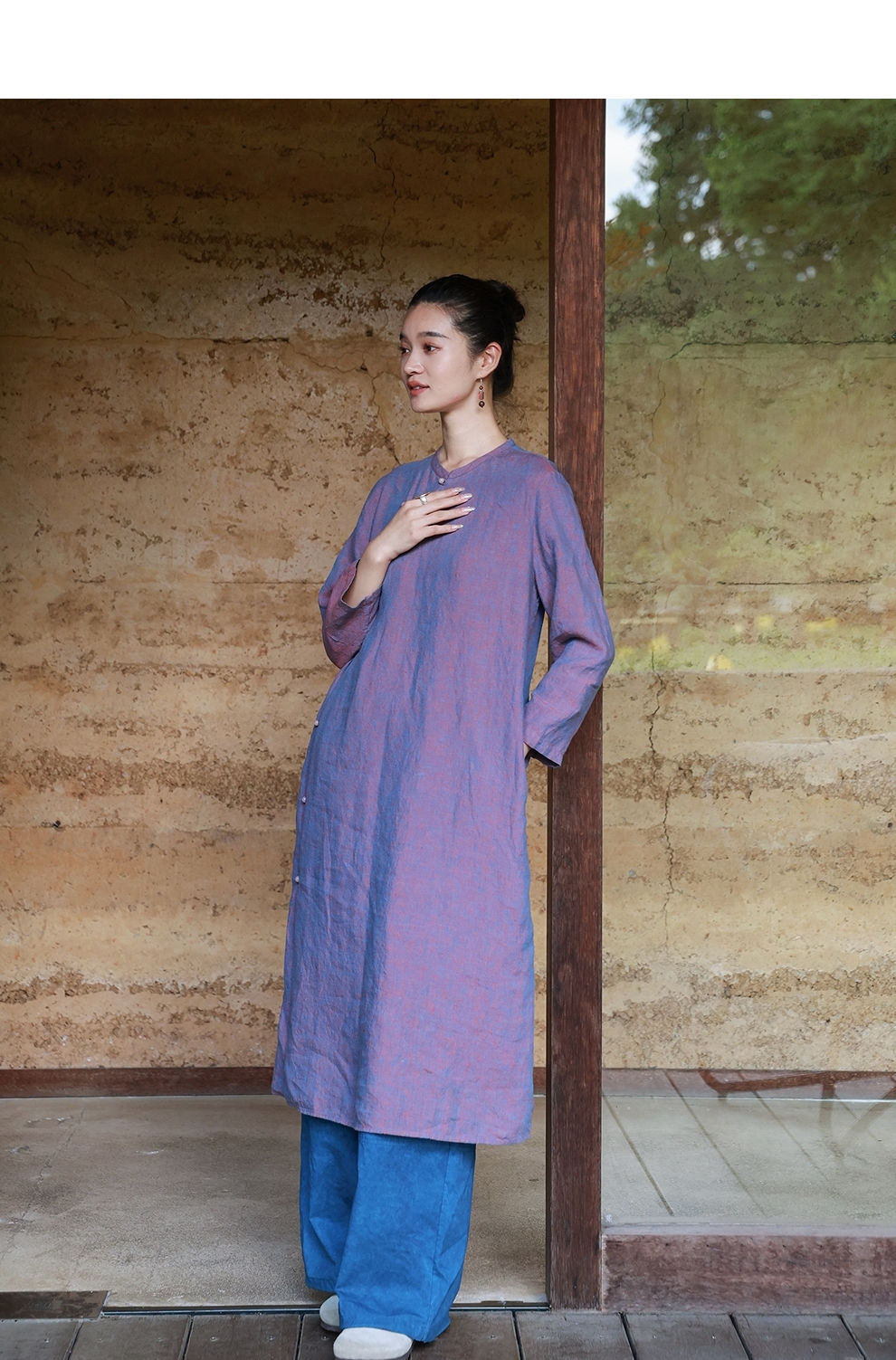 绽放516朵/色织亚麻立领斜襟盘扣正常肩七分袖新中式女连衣裙秋季