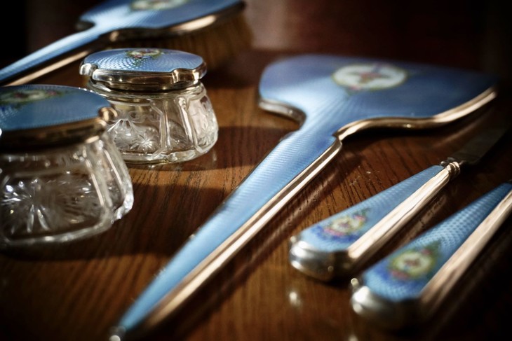 6件套,手绘蓝色珐琅彩花卉 ·包括镜子,刷子,鞋拔,两个雕花玻璃罐,美甲工具