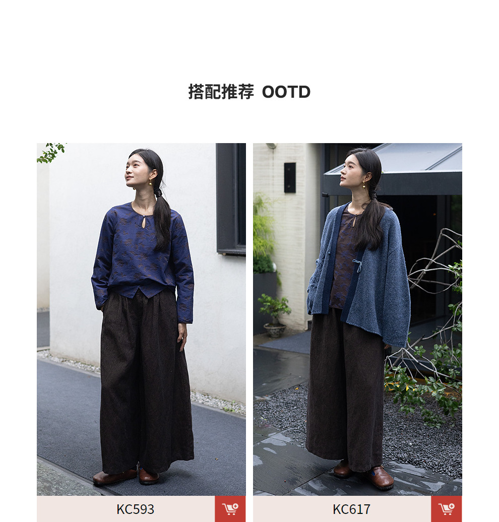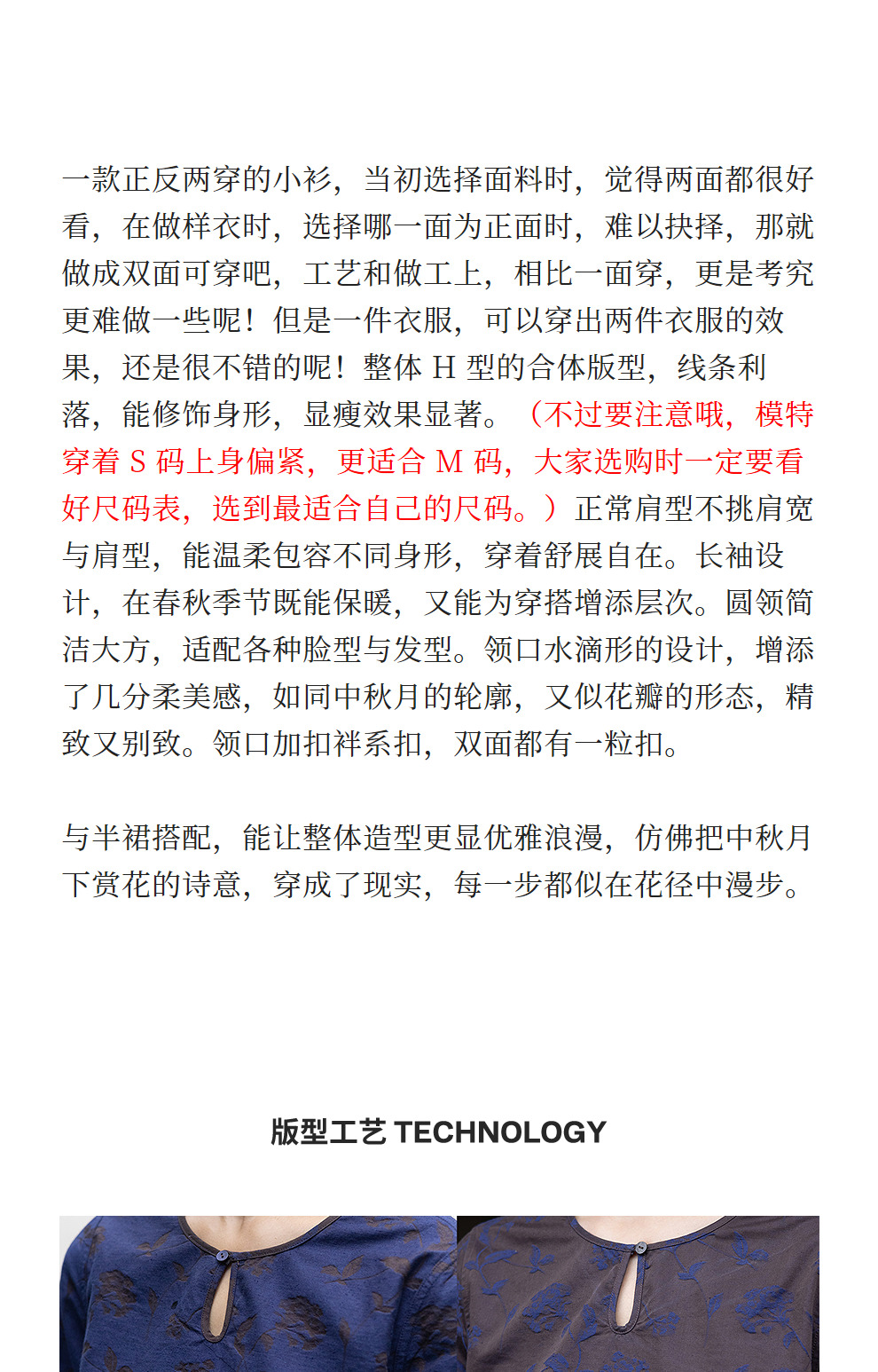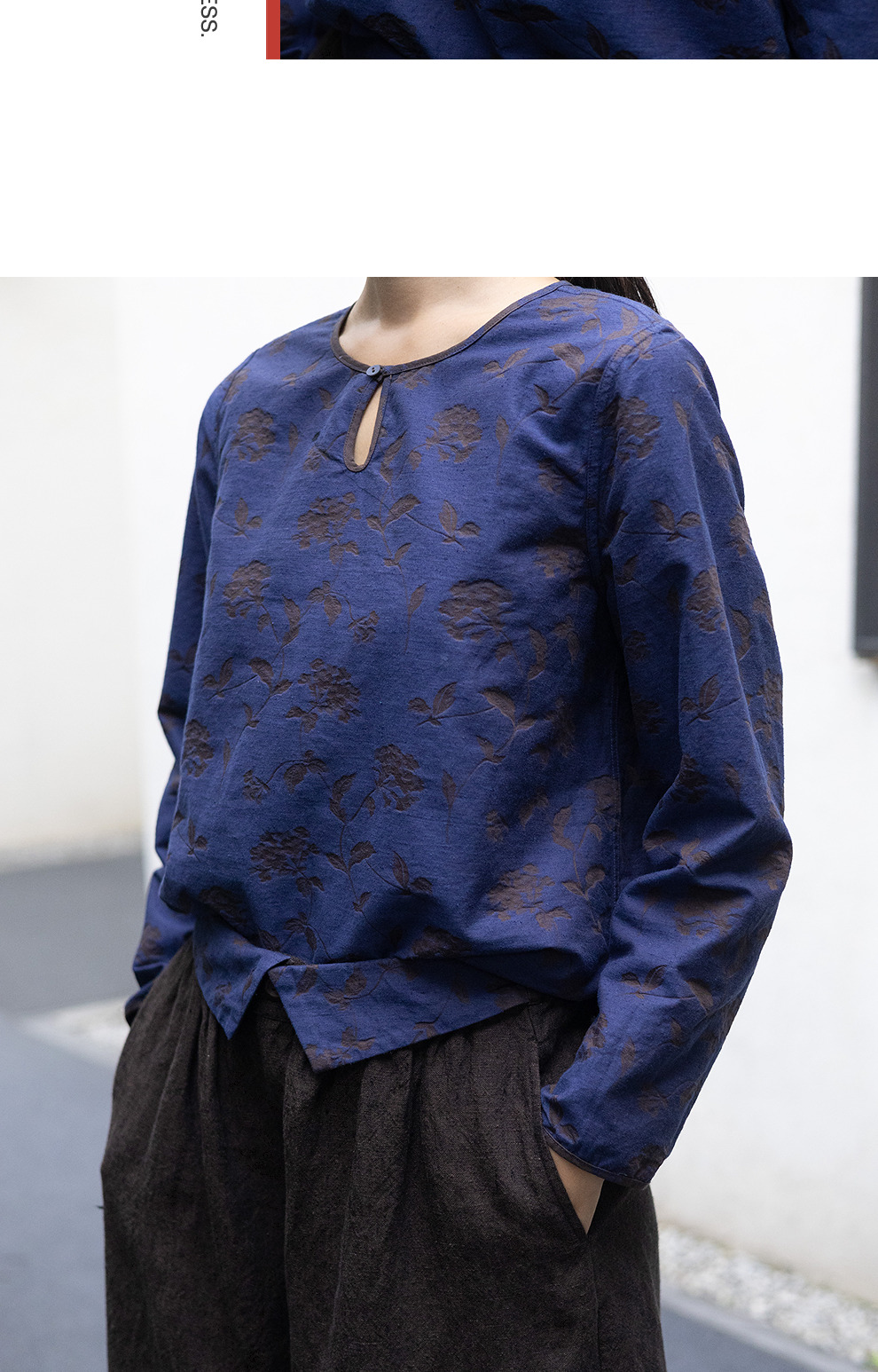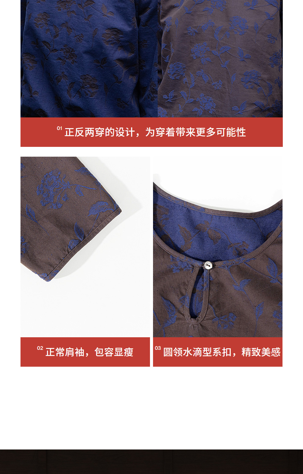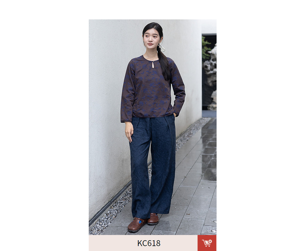 绽放596朵/双面穿棉麻提花圆领水滴型系扣气质文艺新款长袖T恤女