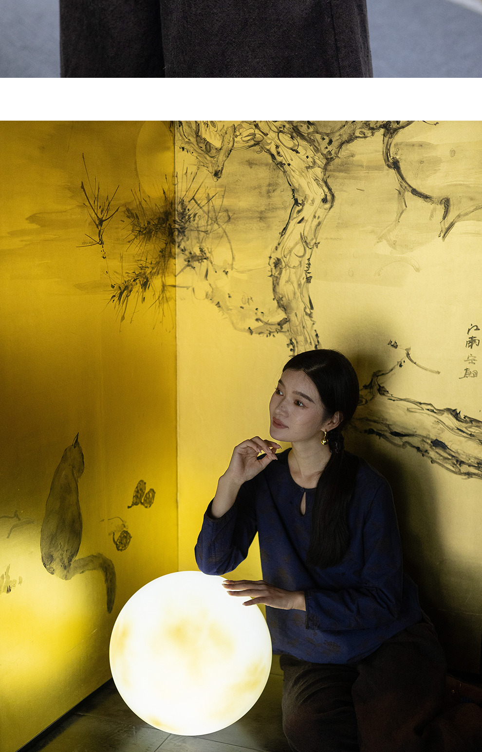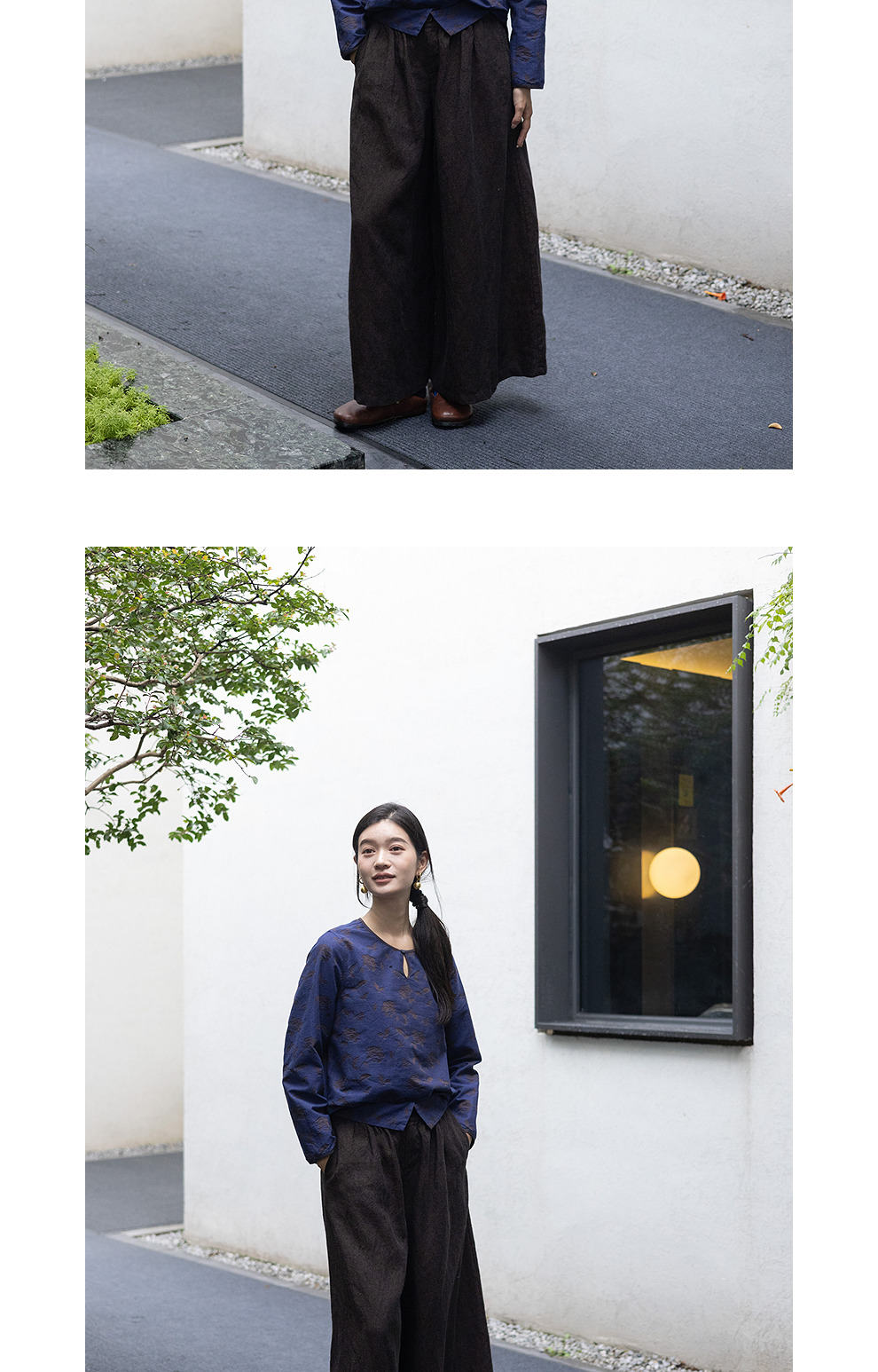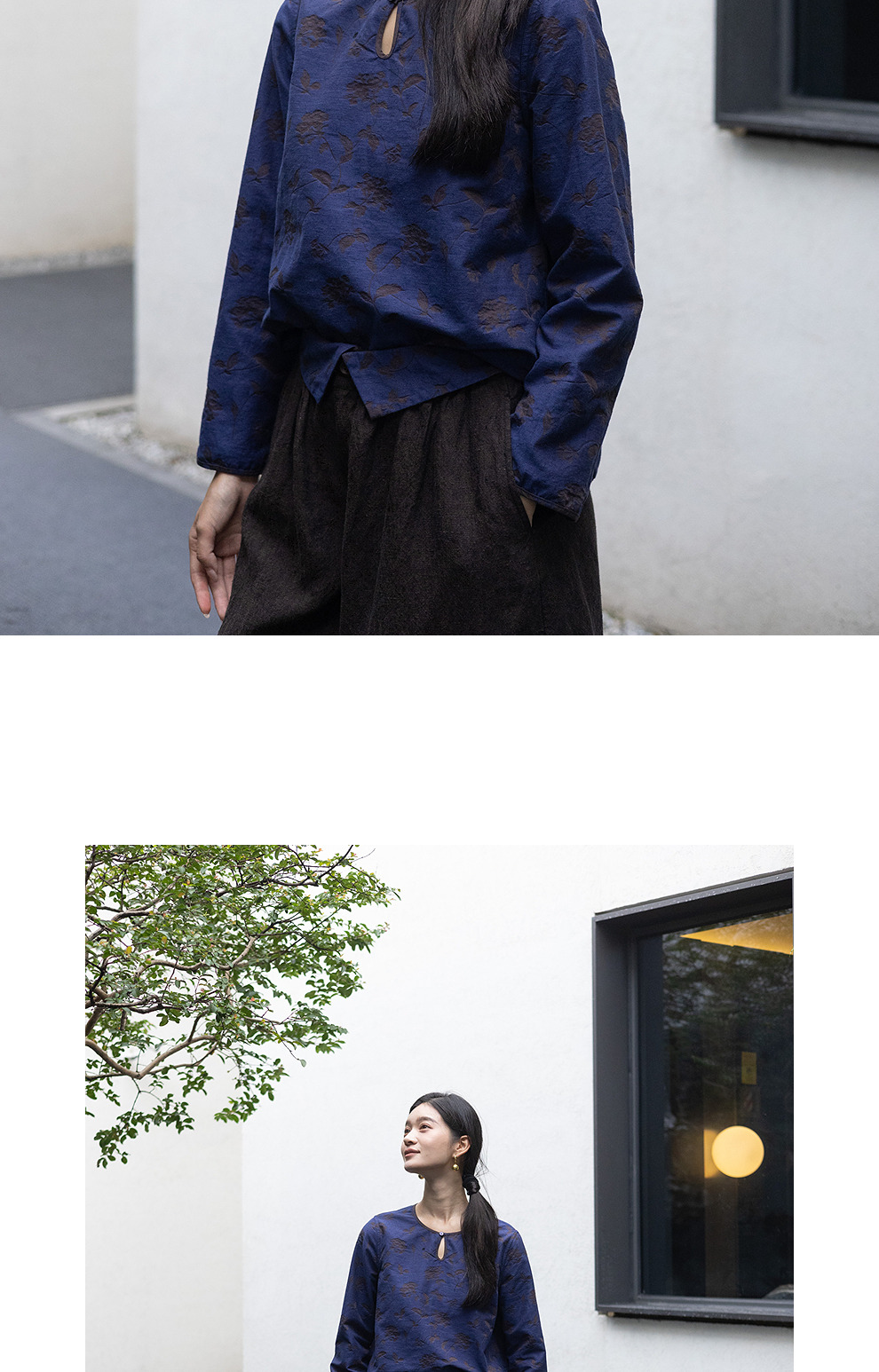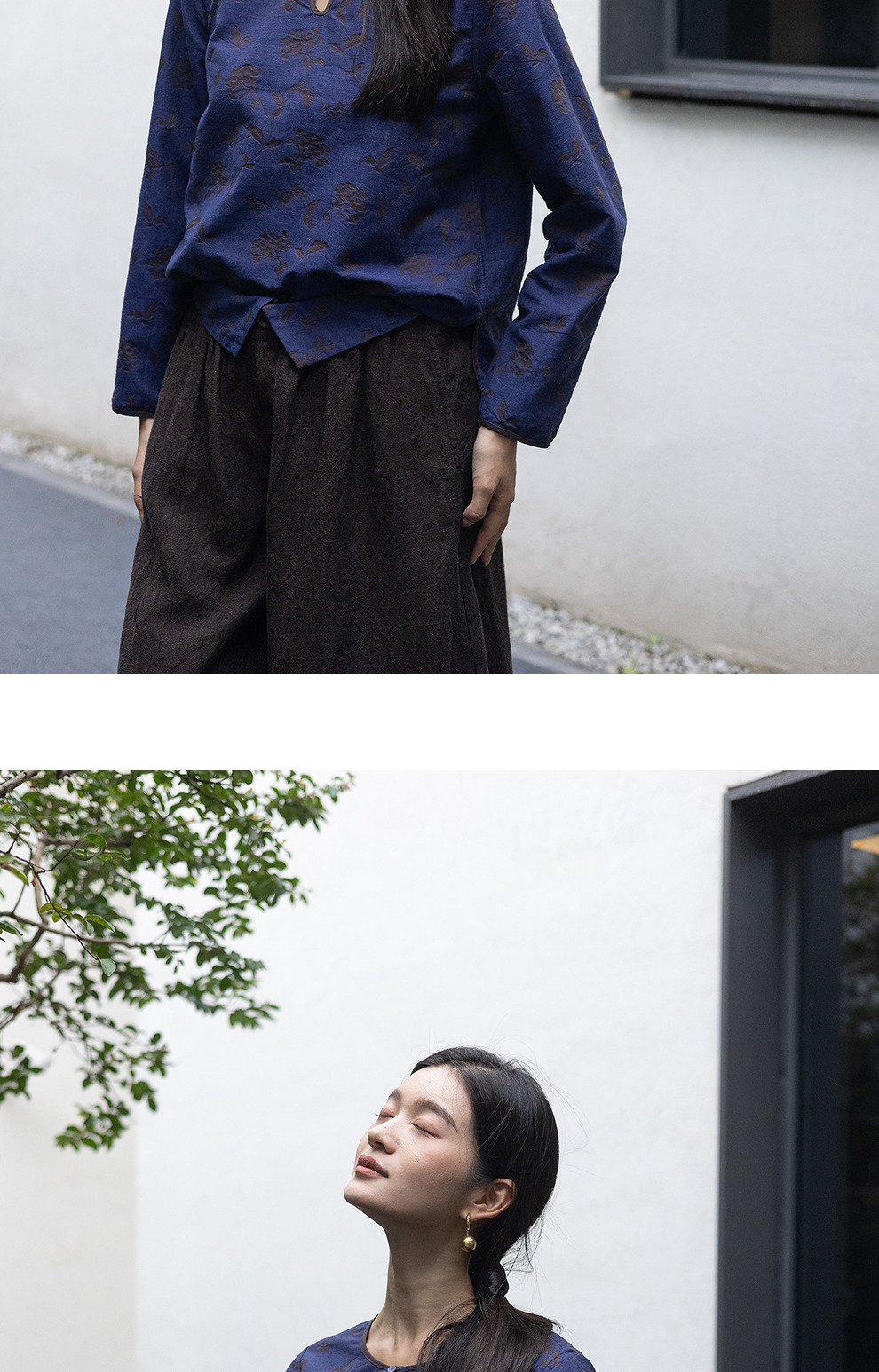 绽放596朵/双面穿棉麻提花圆领水滴型系扣气质文艺新款长袖T恤女