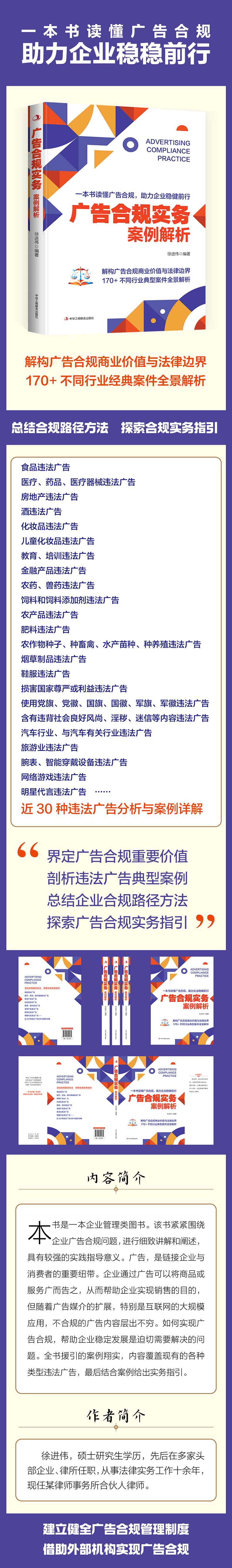 《广告合规实务:案例解析》是一本企业管理类图书。该书紧紧围绕企业广告合规问题,进行细致讲解和阐述,具有较强的实践指导意义。广告,是链接企业与消费者的重要纽带。企业通过广告可以将商品或服务广而告之,从而帮助企业实现销售的目的,但随着广告媒介的扩展,特别是互联网的大规模应用,不合规的广告内容层出不穷。如何实现广告合规,帮助企业稳定发展是迫切需要解决的问题。全书援引的案例翔实,内容覆盖现有的各种类型违法广告,最后结合案例给出实务指引。