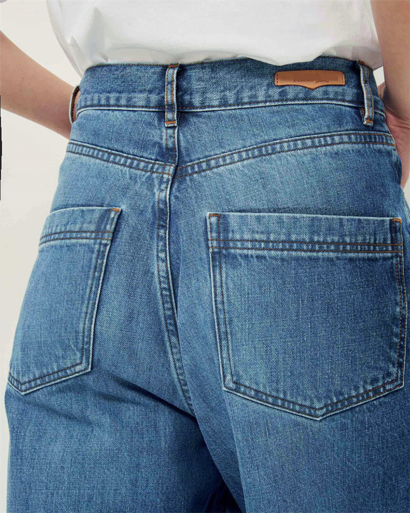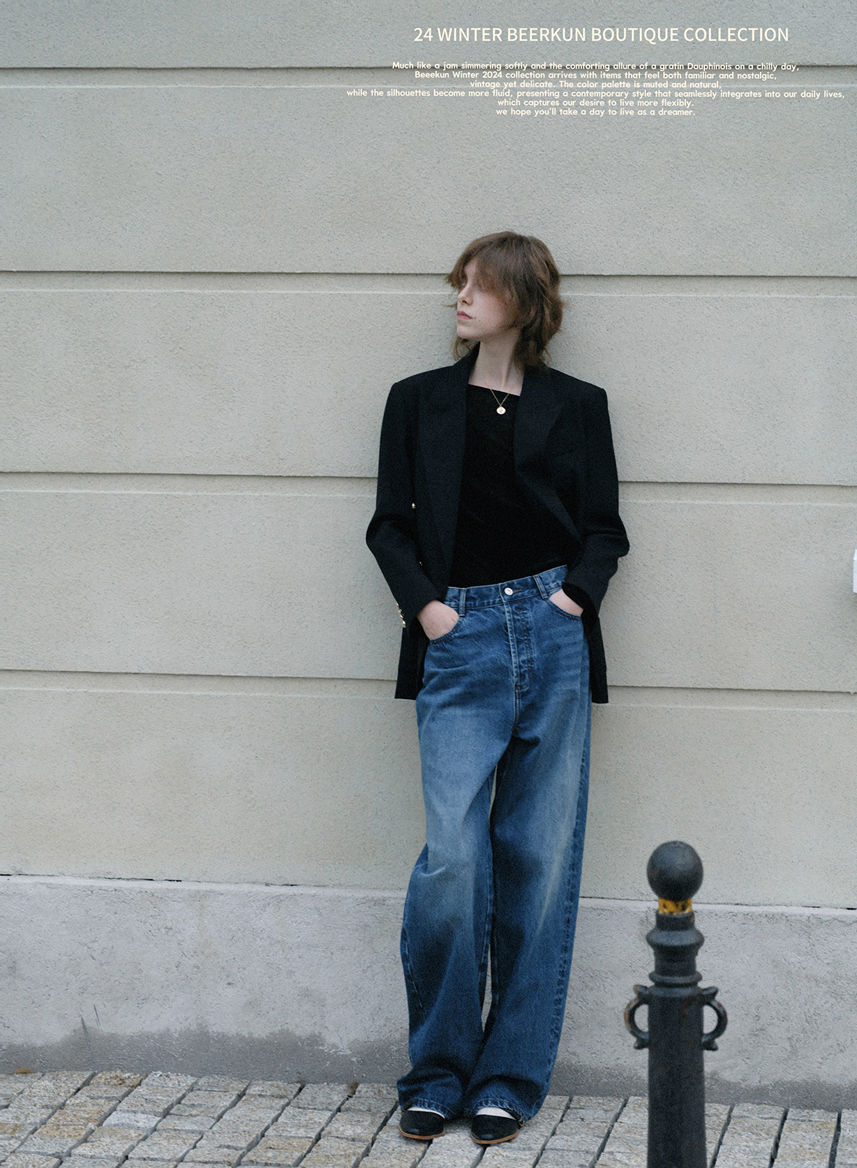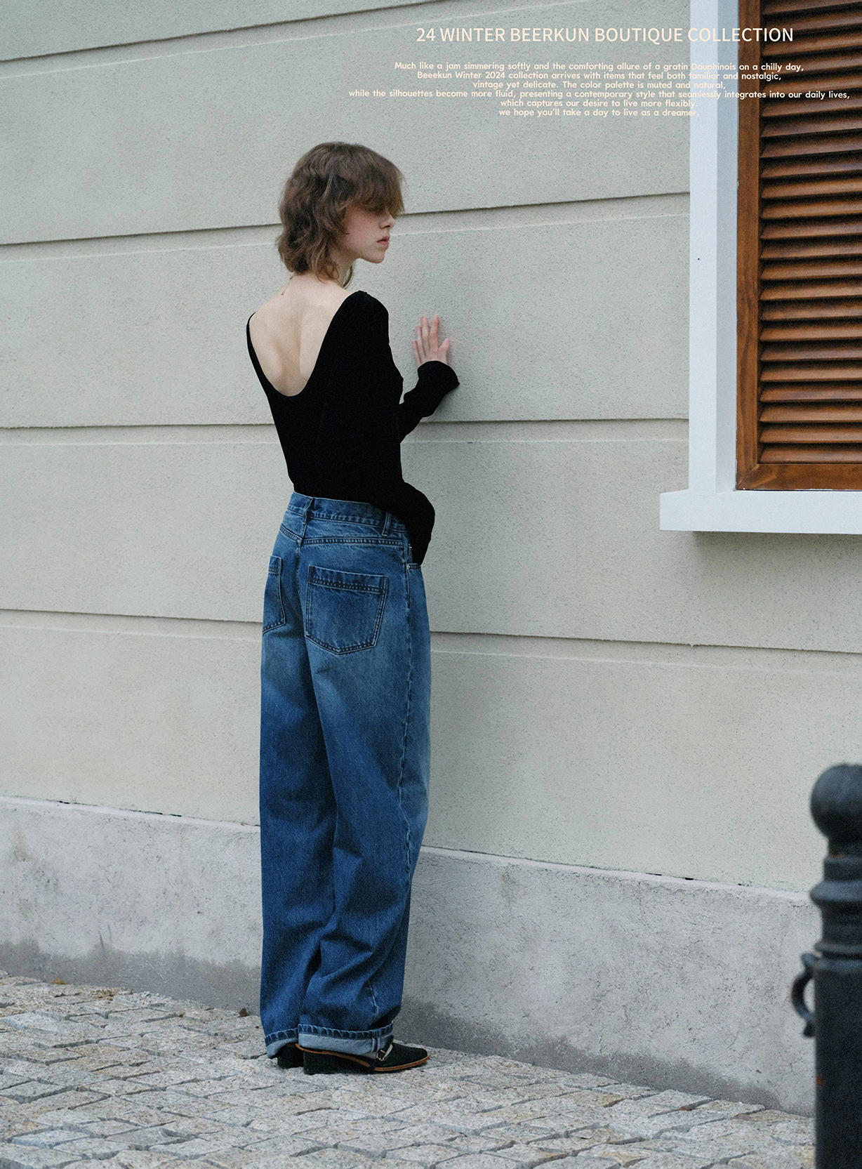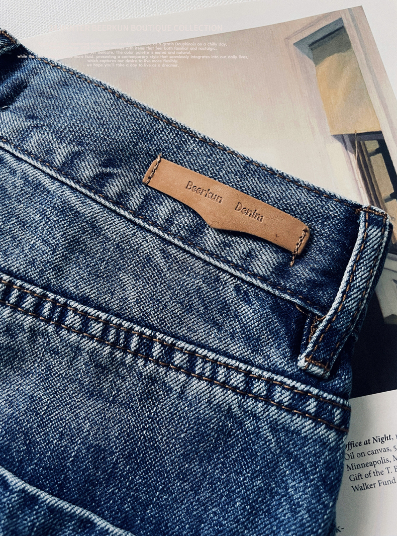 [特价]法式雅痞调水洗蓝高腰宽松直筒牛仔裤 深蓝色 多尺码可选