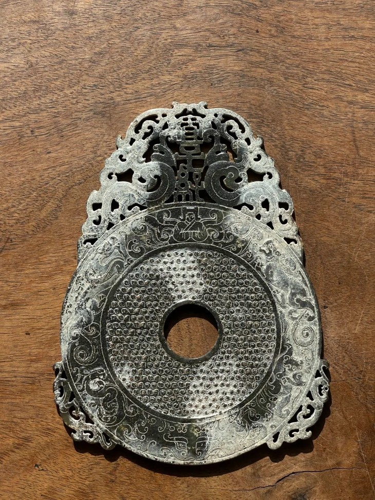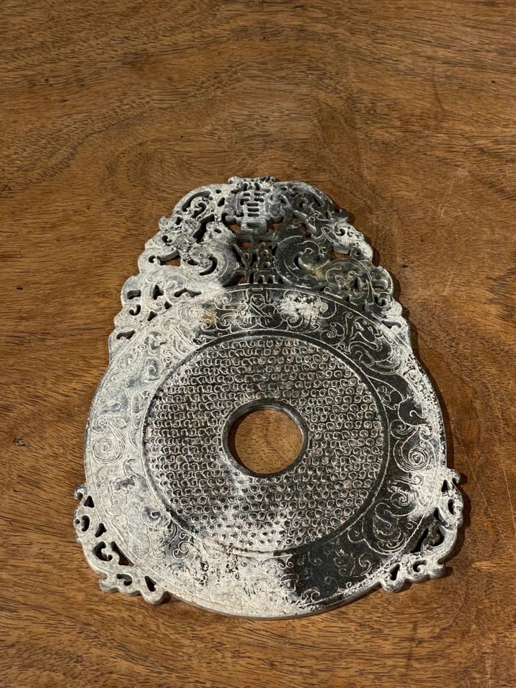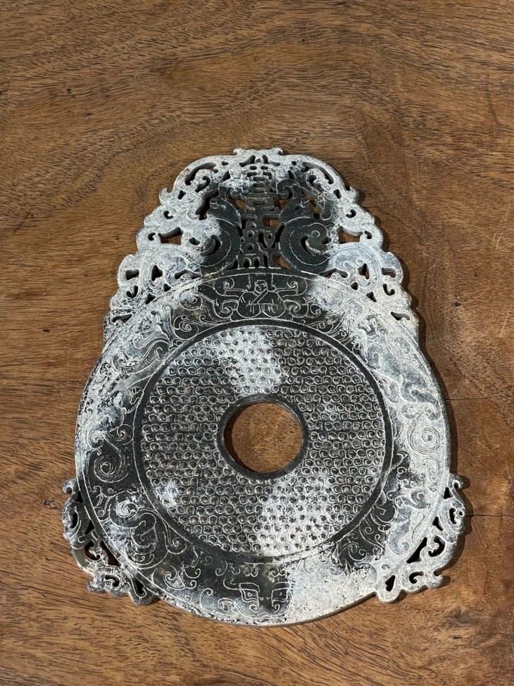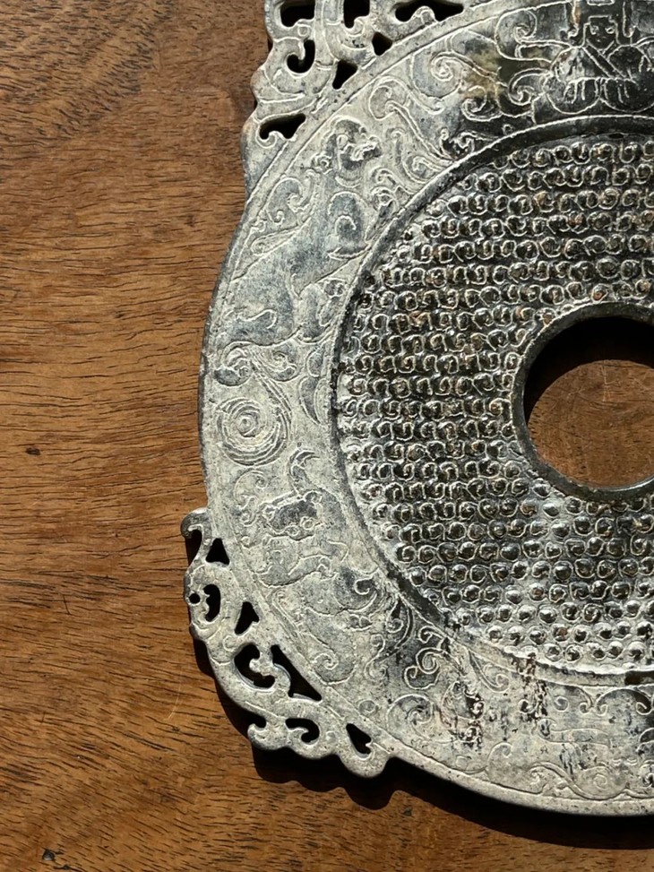 这是一件以和田提油黑沁白玉镂雕双龙出廓龙虎穀纹壁,尺寸硕大,出廓镂雕大玉璧,圆形玉璧中央浮雕穀纹,外围雕华丽繁复的龙虎、舞人、熊、螭龙、以及饕餮纹饰,上方出廓镂雕双龙凤拱“宜子孫”镂雕篆体,下方两侧出廓各一S形螭龙, 整体风格华丽、镂雕琢磨精緻细腻,提油仿古沁自然流畅,是一件精美的仿古玉器。